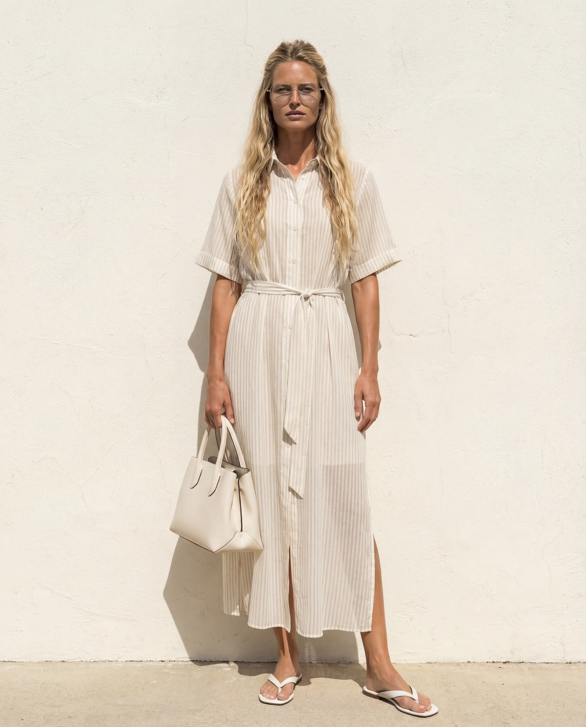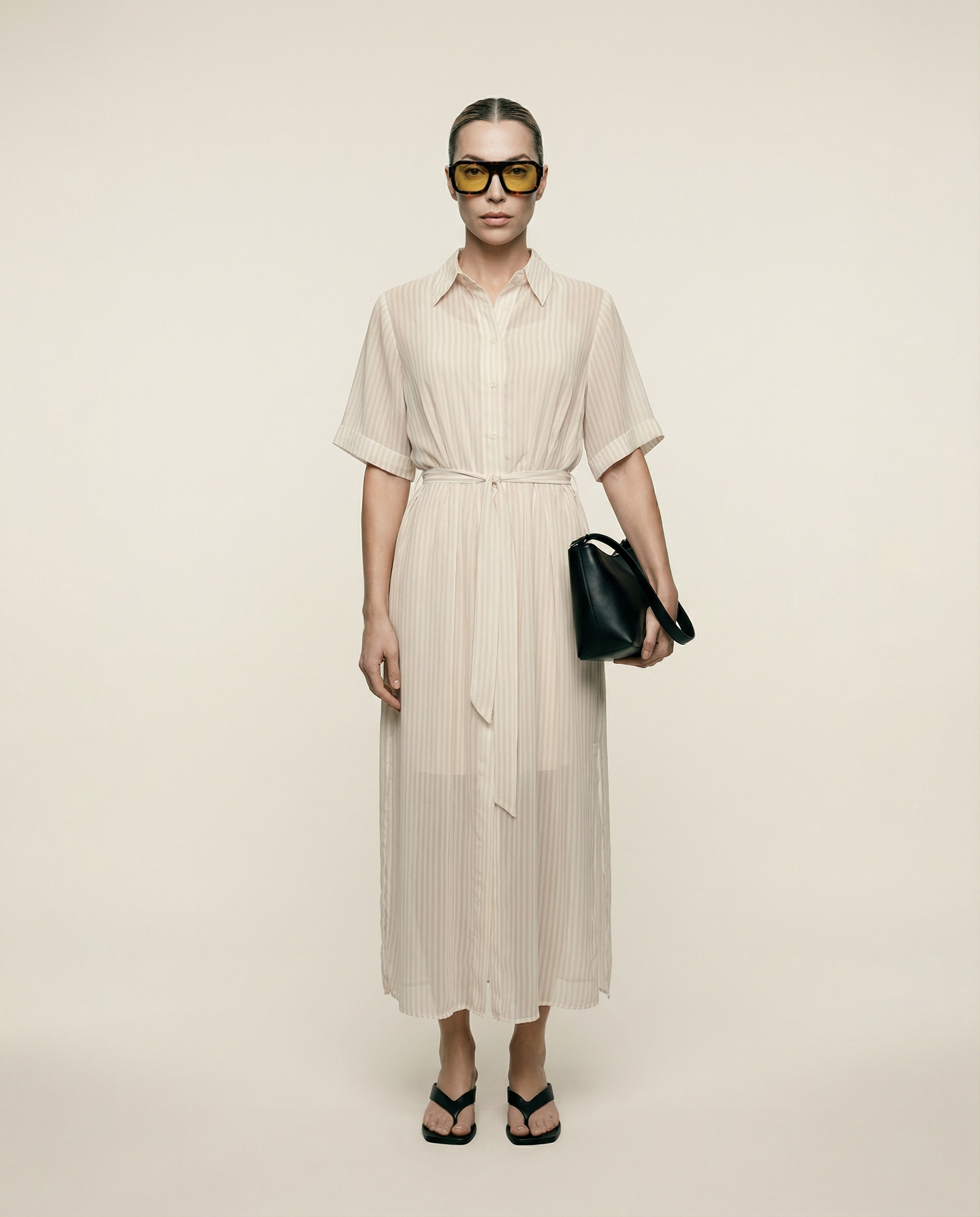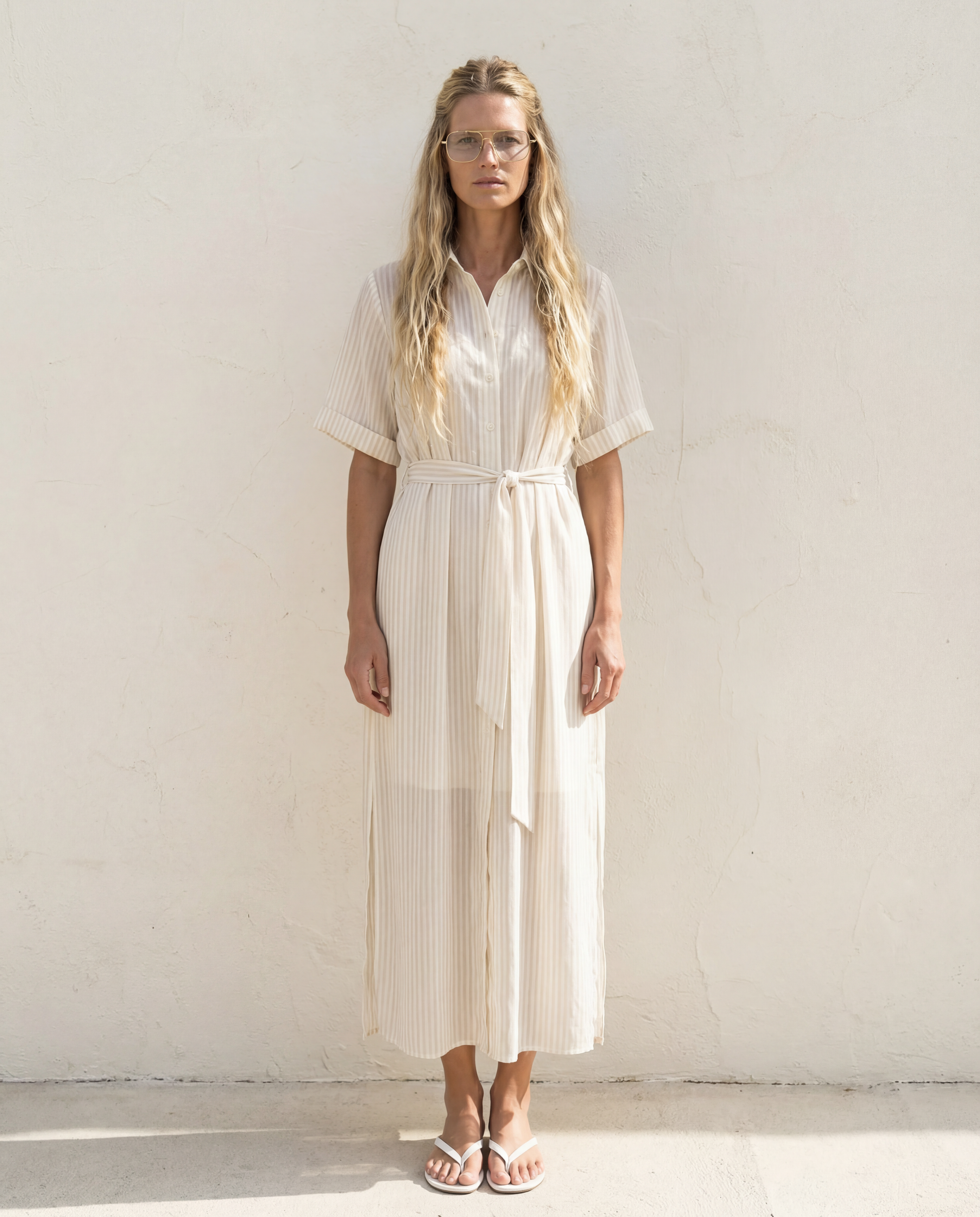 Elevate your wardrobe with this versatile chiffon piece, featuring a timeless sand stripe pattern. The sheer fabric drapes beautifully as a standalone dress when paired with the included slip, or layer it effortlessly over denim for a refined duster look. Perfect as a beach coverup, this multi-purpose essential transitions seamlessly from day to evening wear.