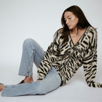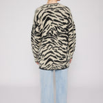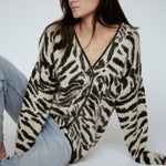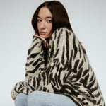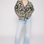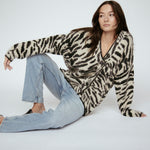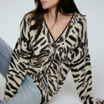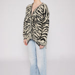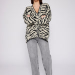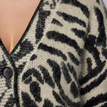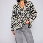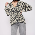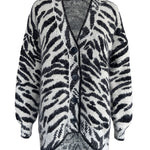 Indulge in luxury with our couture-quality Mohair blend cardigan. This incredibly soft and cozy piece features a subtle metallic shine woven into the pattern, adding a touch of elegance to this knit. This statement-print cardigan boasts a button front, a relaxed easy to wear fit, and a slightly longer back for a sophisticated silhouette. Warm and refined, this cardigan is the perfect blend of comfort and style for cool days.