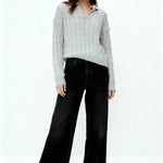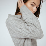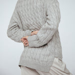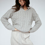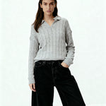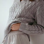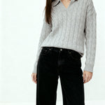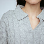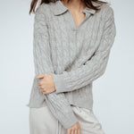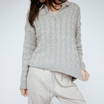 Elevate your wardrobe with our cozy chic cashmere blend polo sweater. Crafted from premium cashmere blend yarn, this incredibly soft sweater features a sophisticated textured braided pattern and a curved hem for a touch of luxury. The back is slightly longer than the front, with side slits adding a modern twist. Ribbed sleeve hems, collar, and bodice finish the look with a polished touch. Lightweight yet warm, this versatile knit transitions seamlessly through seasons. Style it casually for lounge days or dress it up for cooler evenings out.