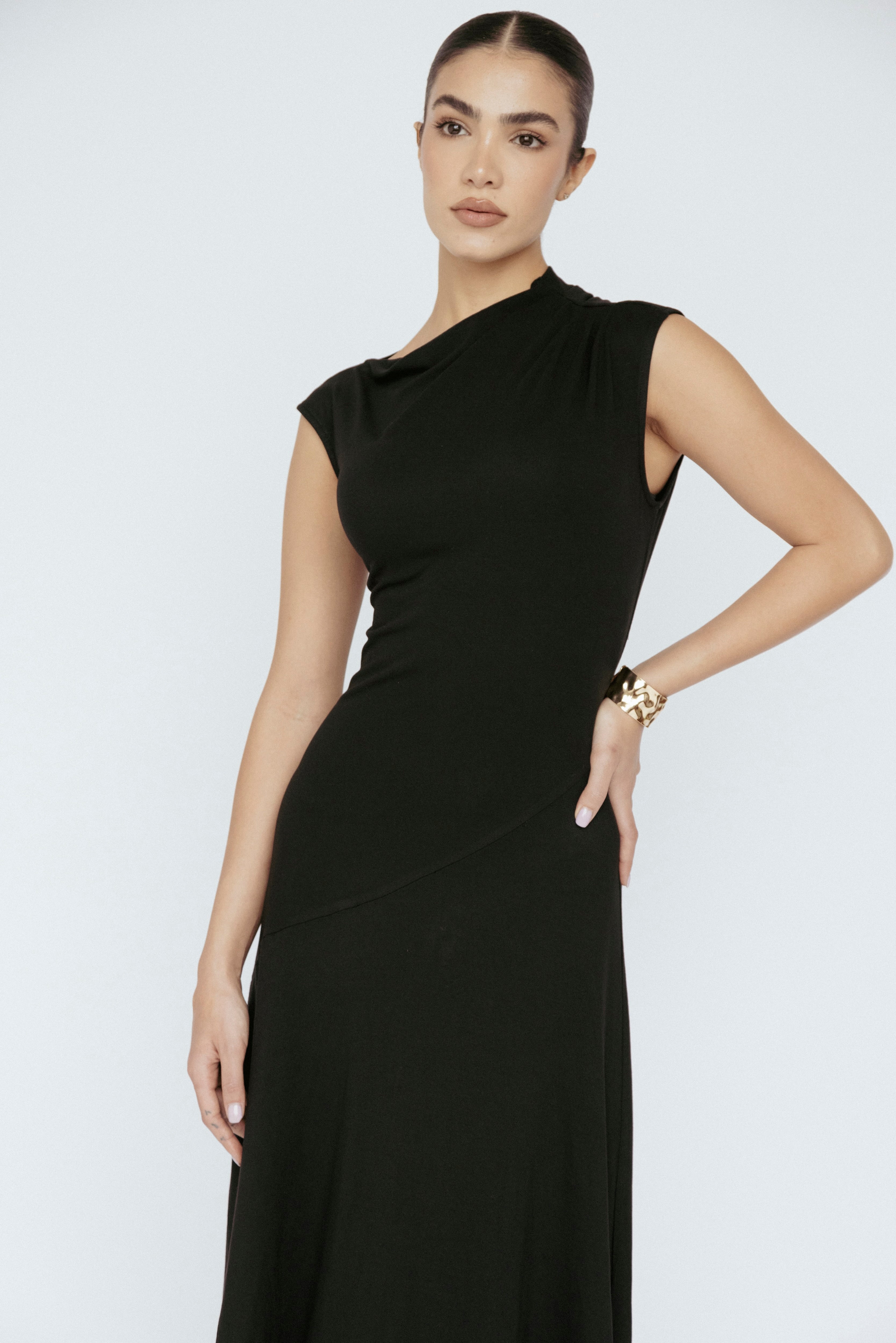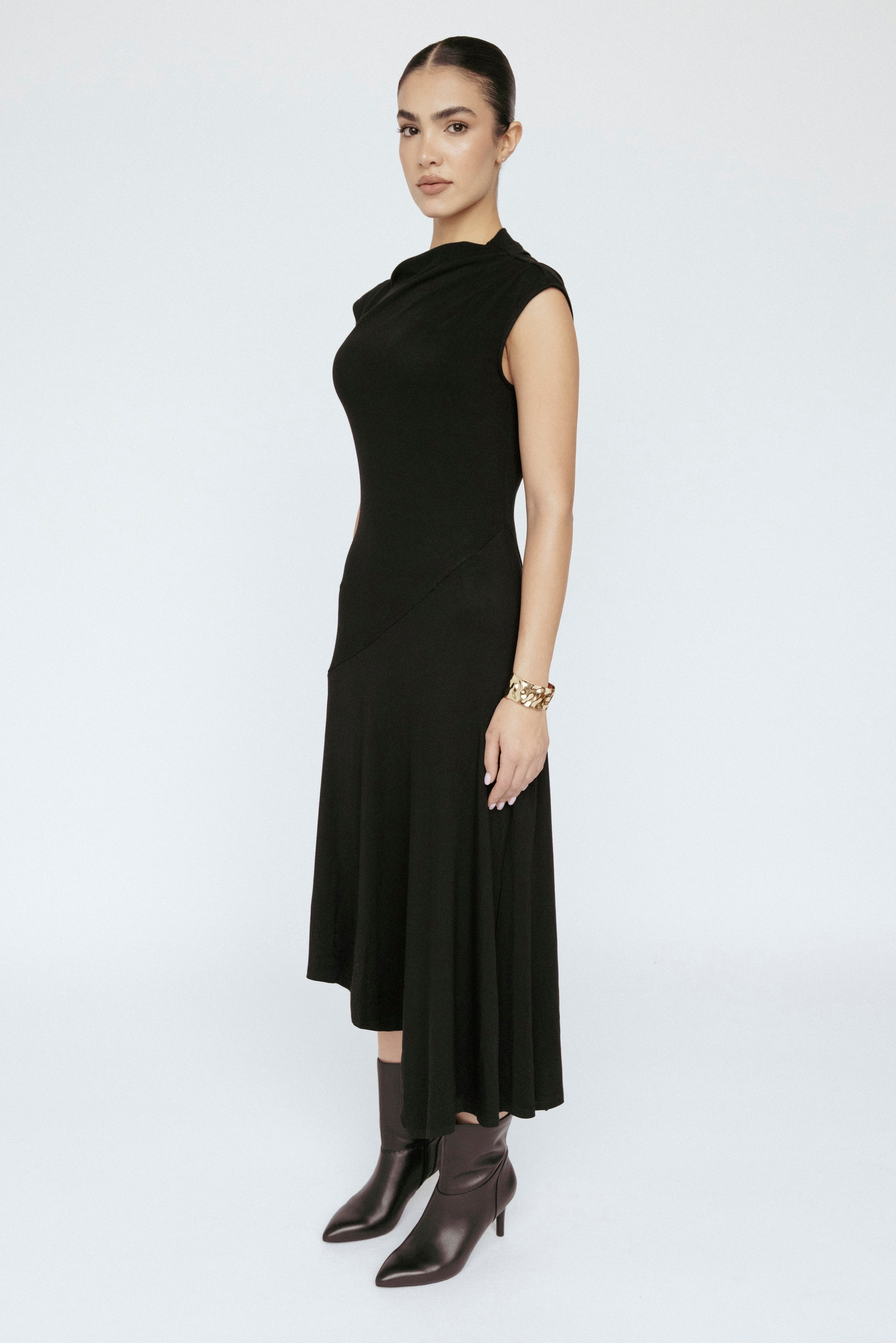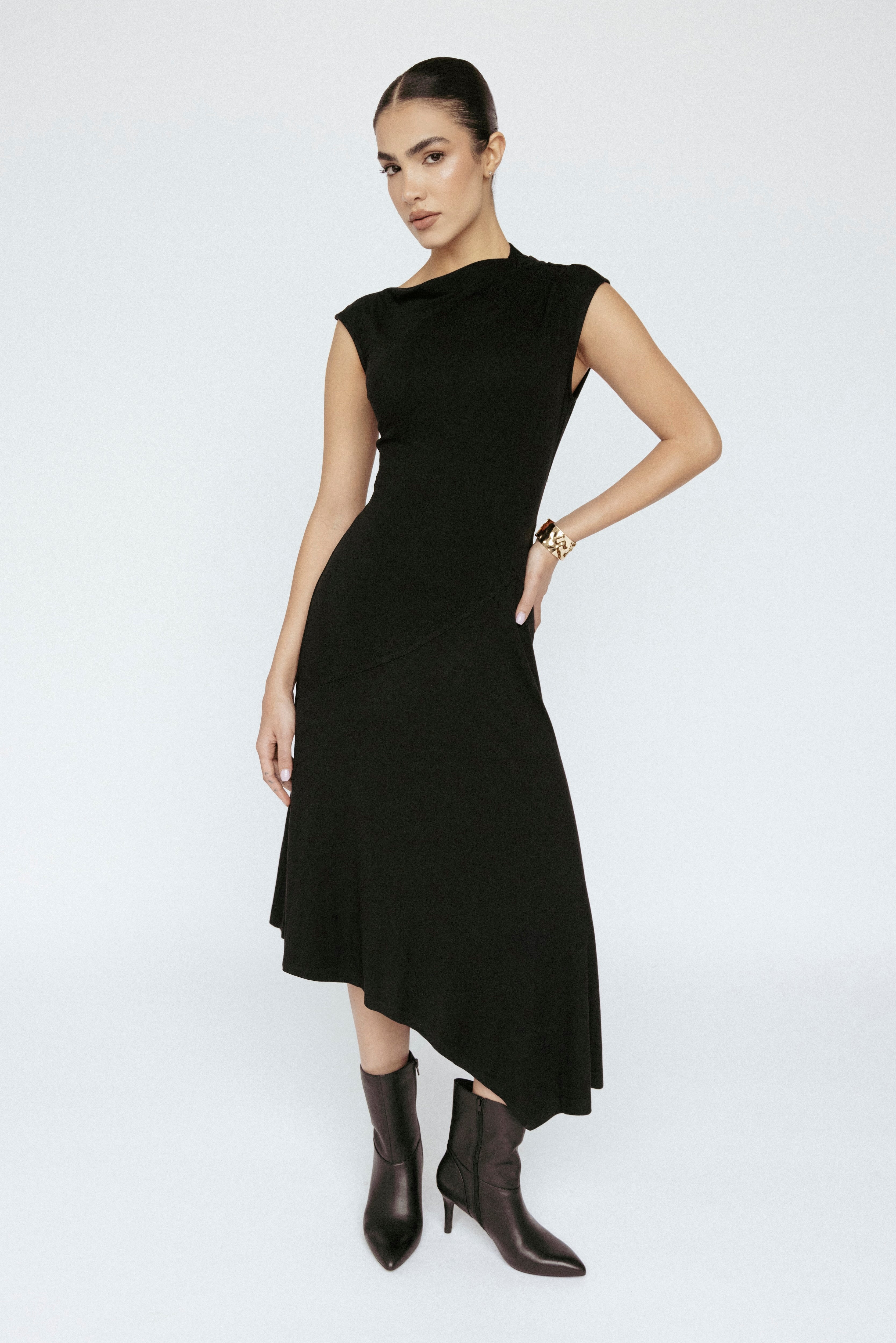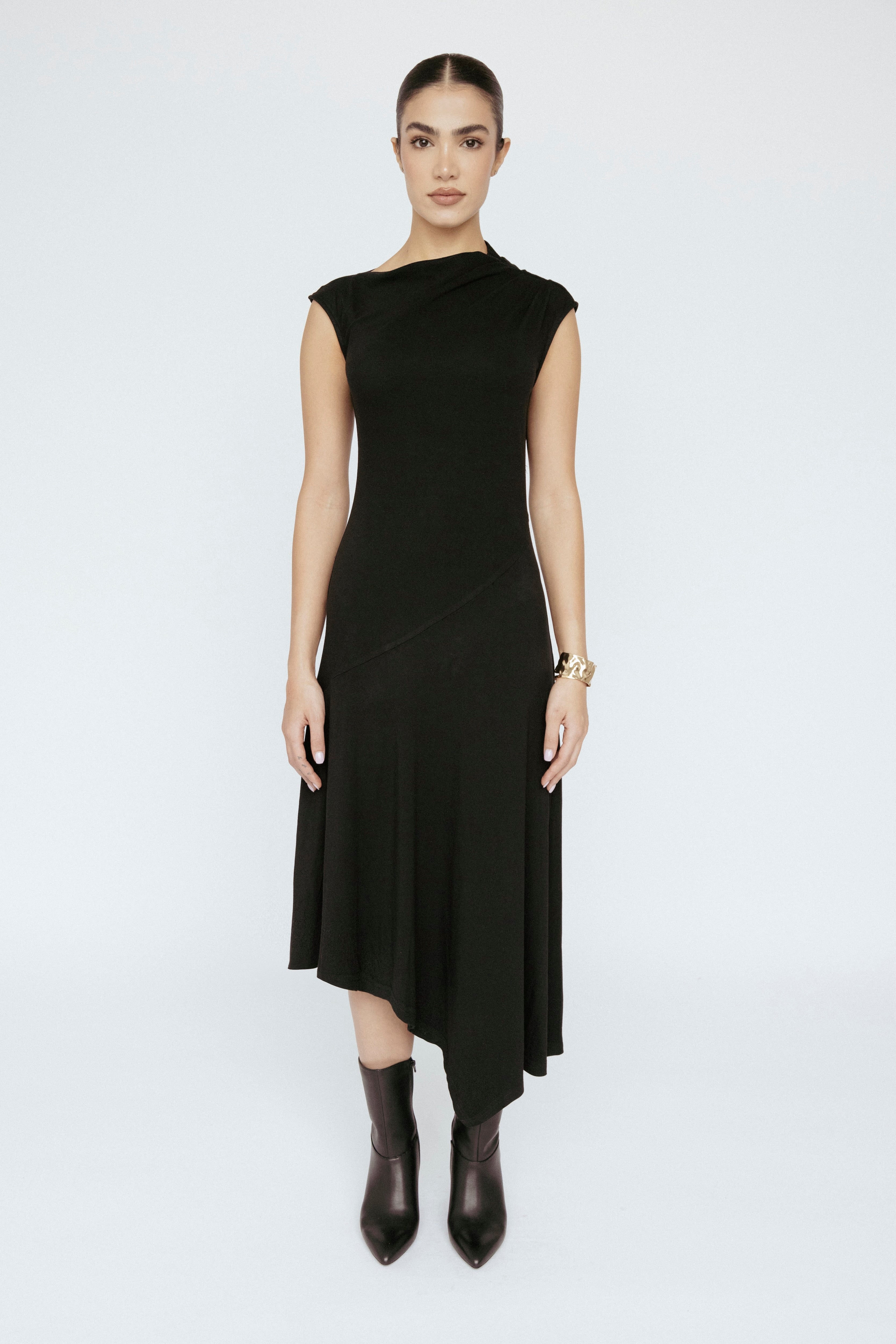 Sculptural ease meets everyday versatility. This asymmetric dress is crafted from our signature bamboo jersey—a fabric chosen for its luxurious drape, breathable softness, and sustainable footprint. Featuring pleated shoulder detailing and a fluid, uneven hemline, the silhouette strikes a balance between refined and relaxed.