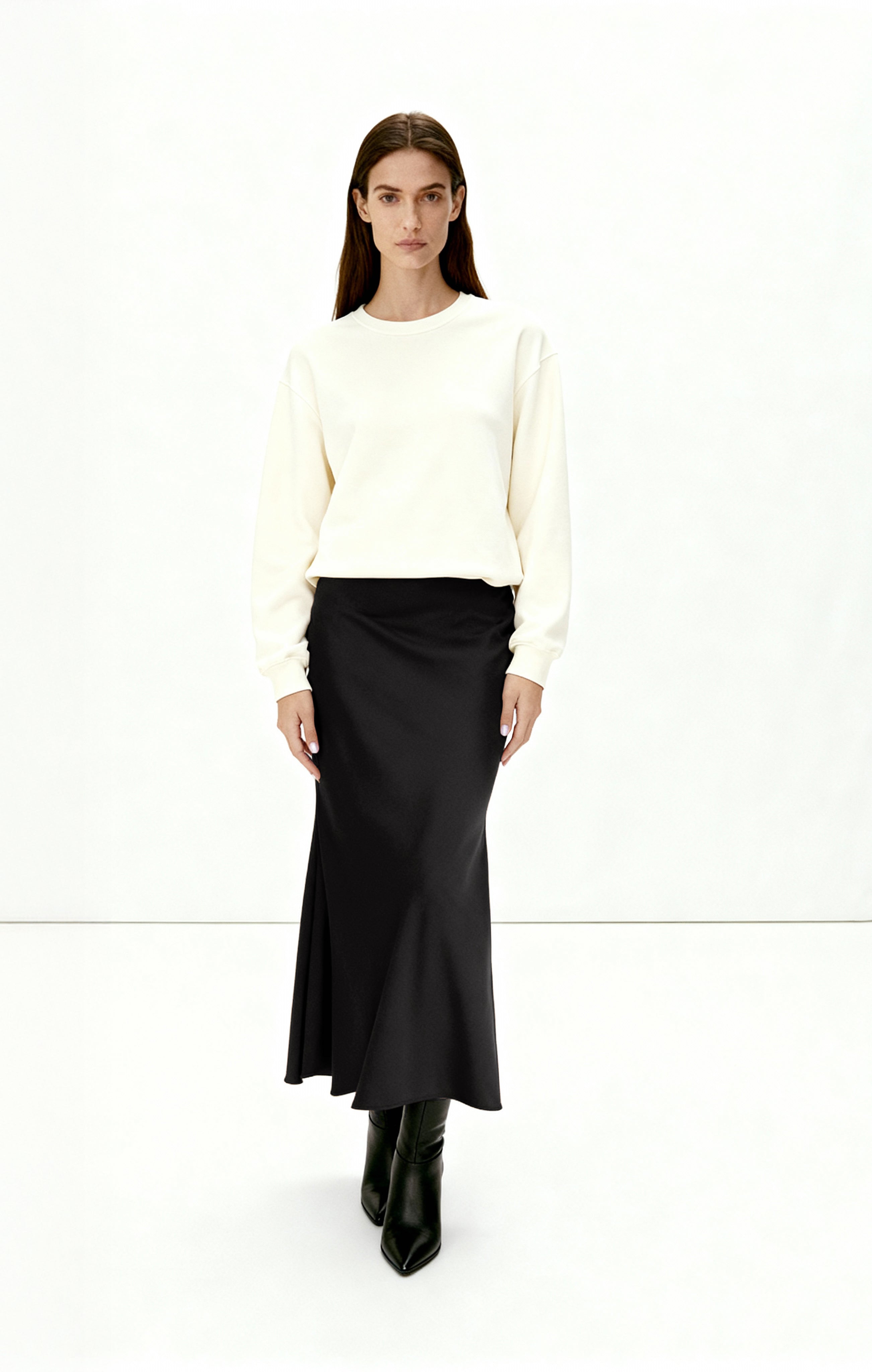 A timeless wardrobe staple, this bias-cut skirt is crafted from our signature butter satin for a fluid drape and subtle sheen. Designed with a concealed elastic waistband for a smooth, comfortable fit, it skims the body with effortless elegance.