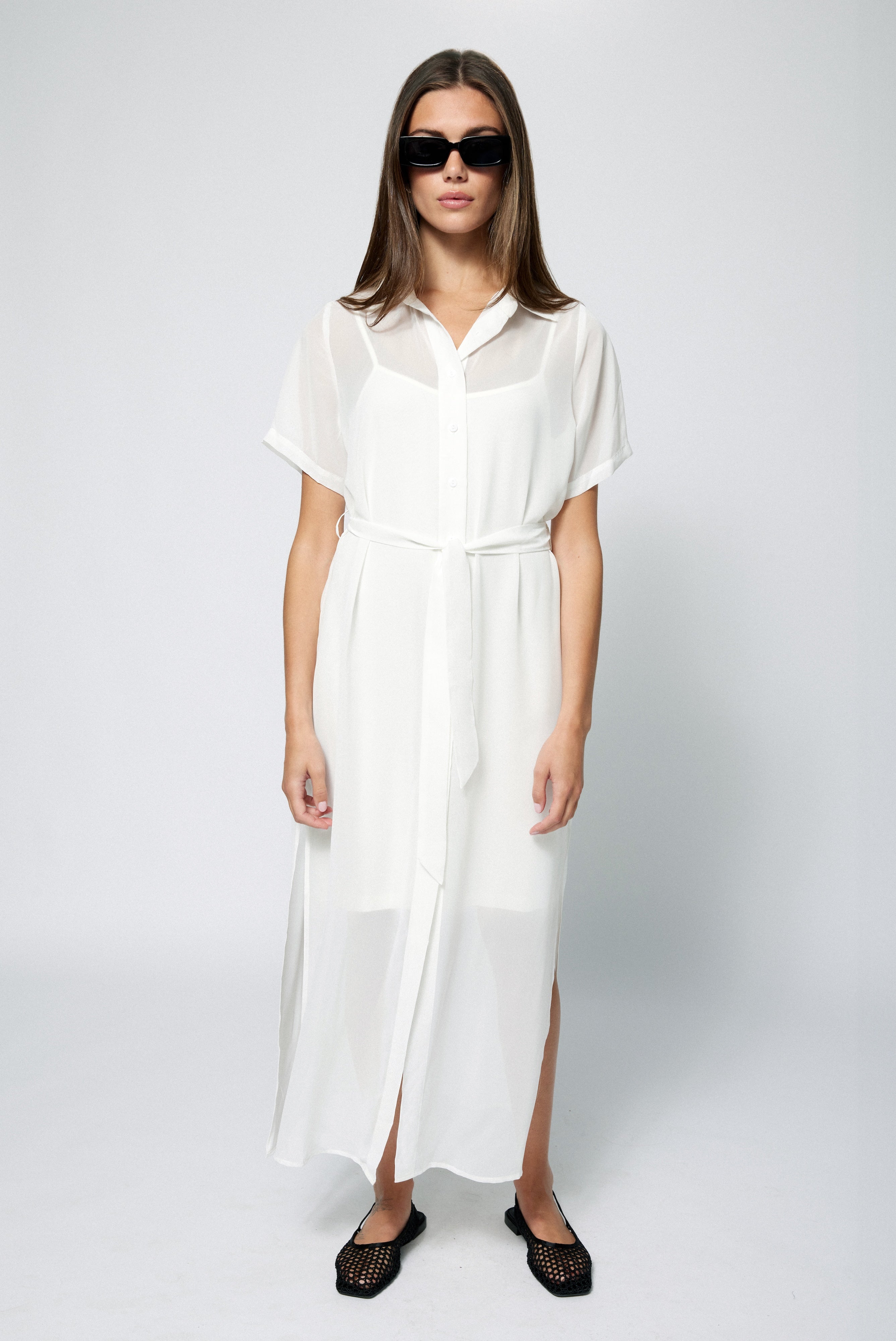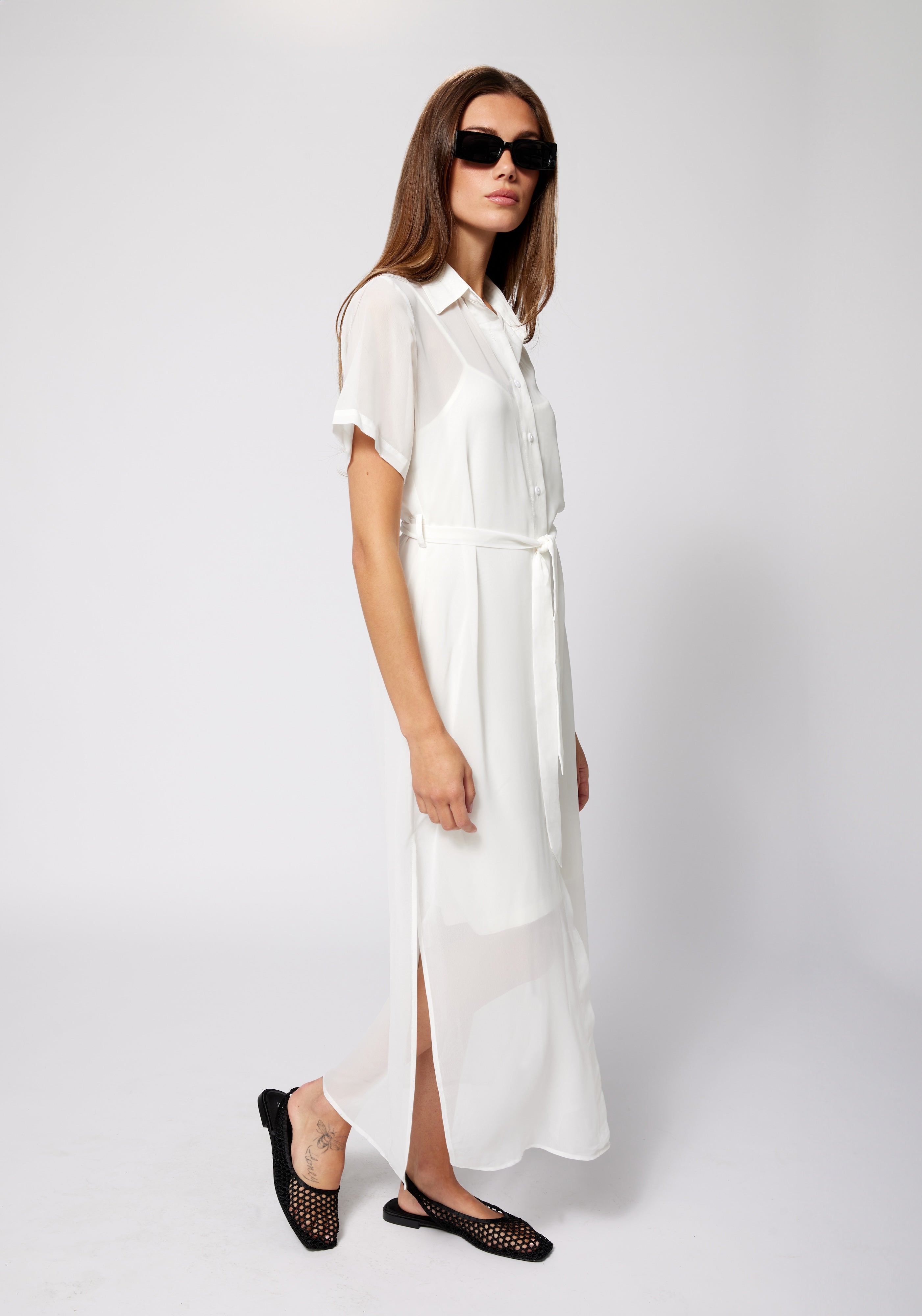 Effortlessly elegant and delightfully versatile, this lightweight chiffon dress is your new go-to for spring, summer, and beyond. Made from a soft, semi-sheer chiffon, it flows beautifully with every step, featuring side slits for added movement and a waist tie to cinch the perfect silhouette.