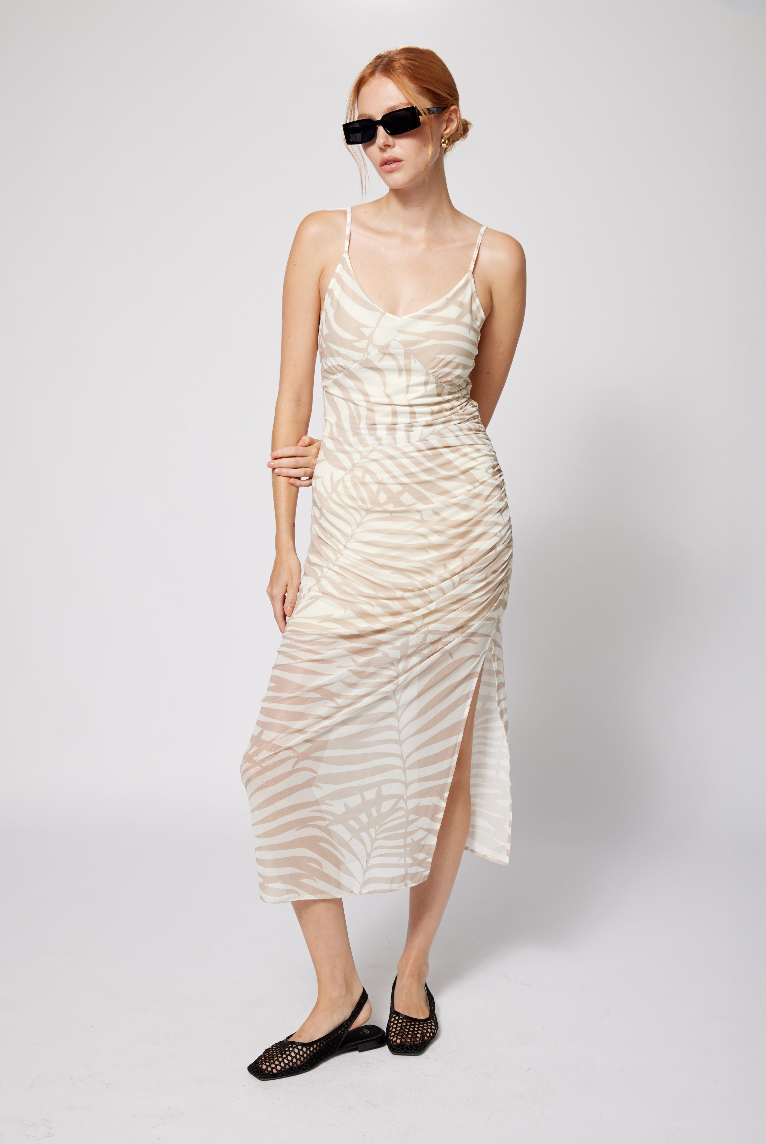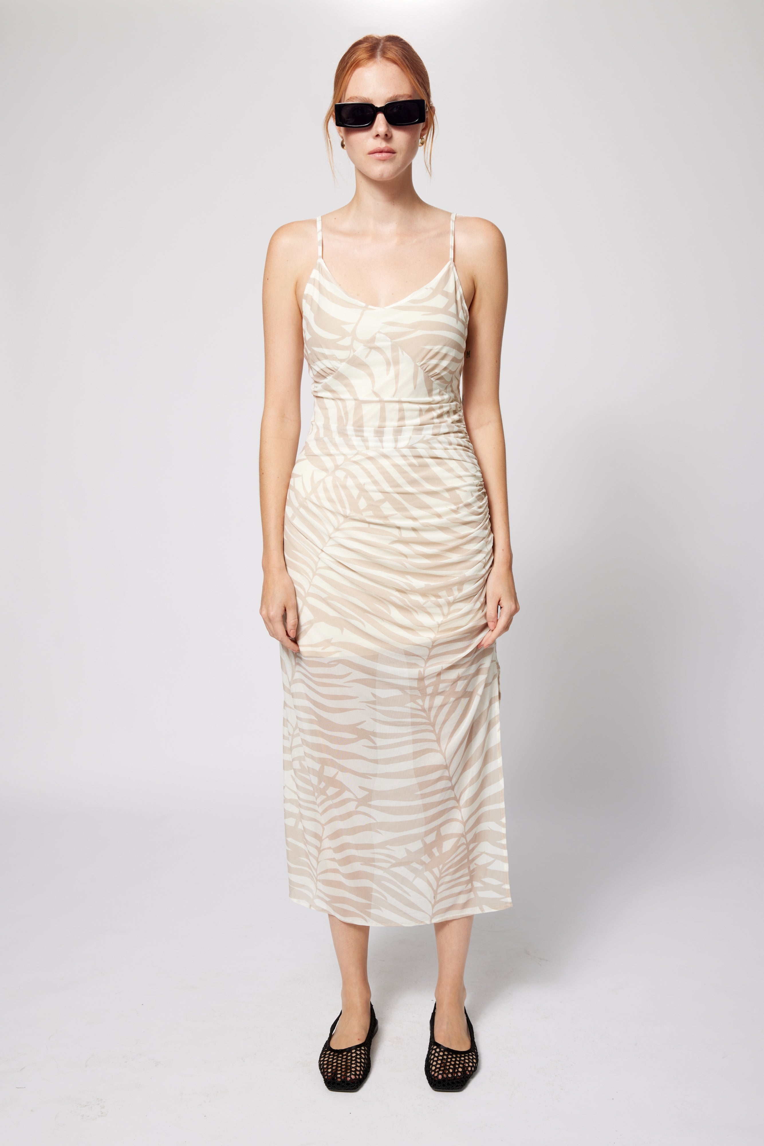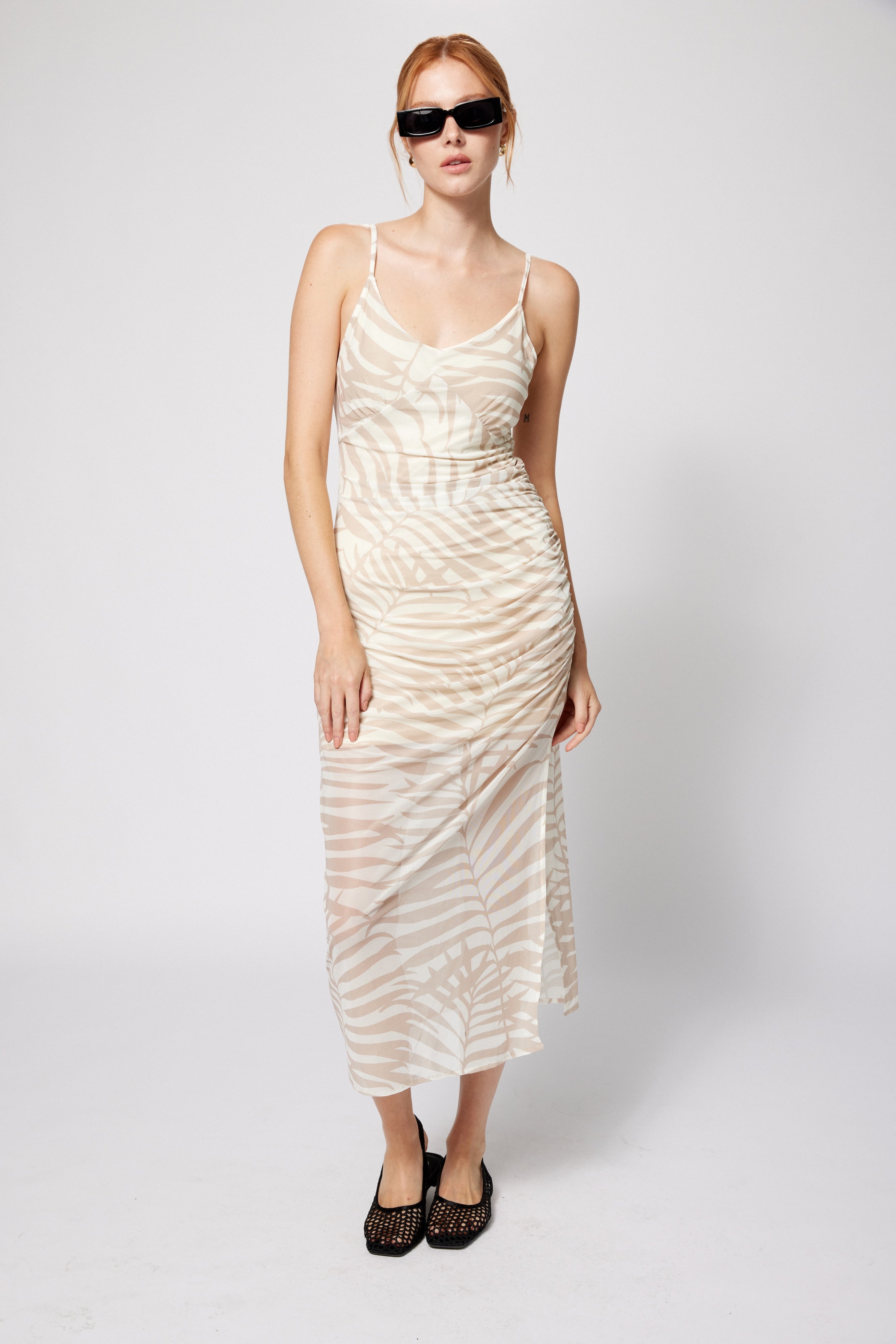 A study in effortless sensuality, this dress is crafted from whisper-soft stretch mesh, sheer yet fully lined in buttery soft jersey for a "not even there" feel. Adjustable spaghetti straps offer a customizable fit, while ruched side seams drape over the silhouette with understated elegance. Designed in a neutral palm print, it’s a versatile staple—layer it under summer jackets and knits for textural contrast, or wear it solo to embrace its fluid, figure-flattering shape. A piece that moves with you, designed for endless summer styling possibilities. Great for travel!