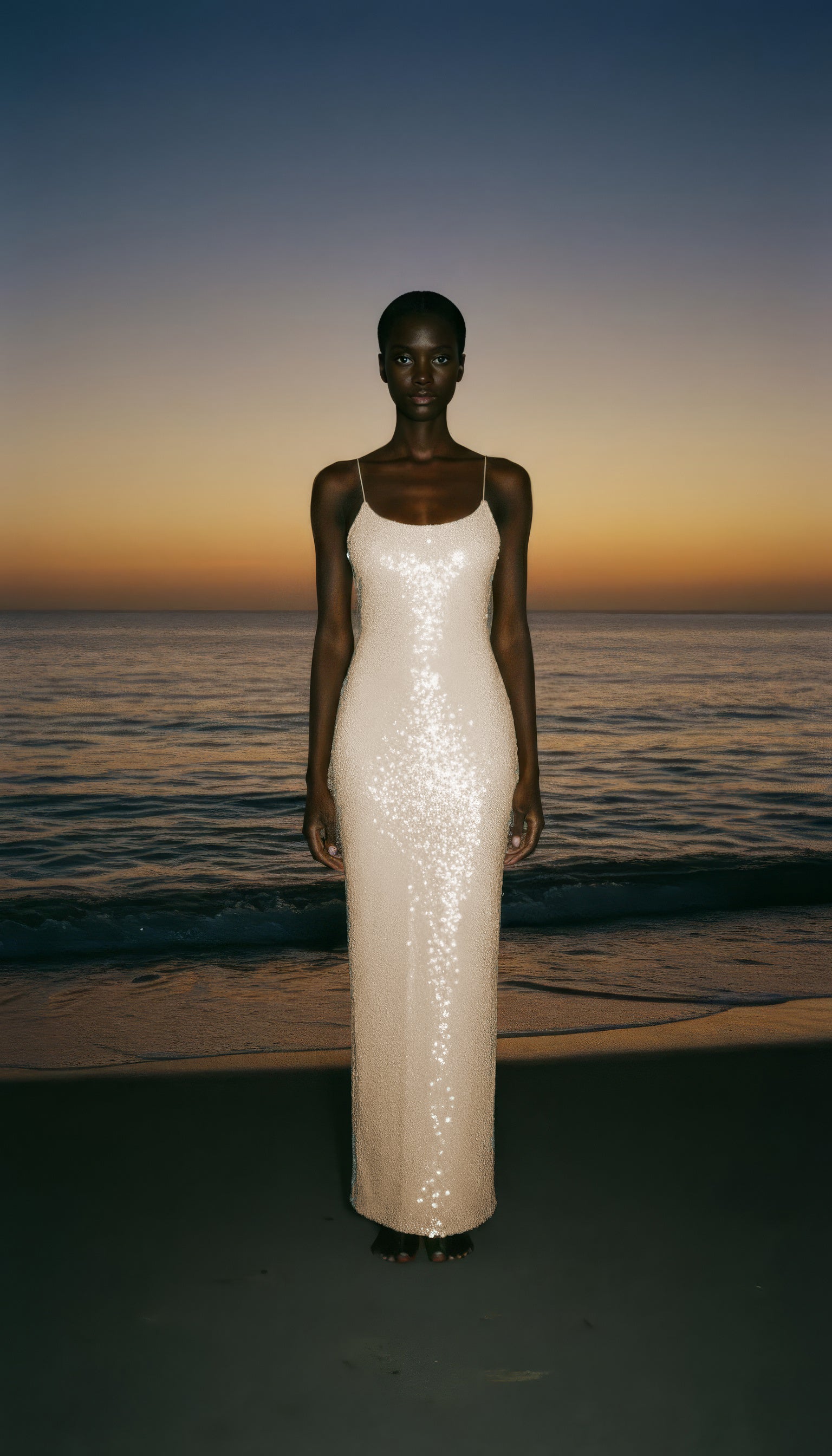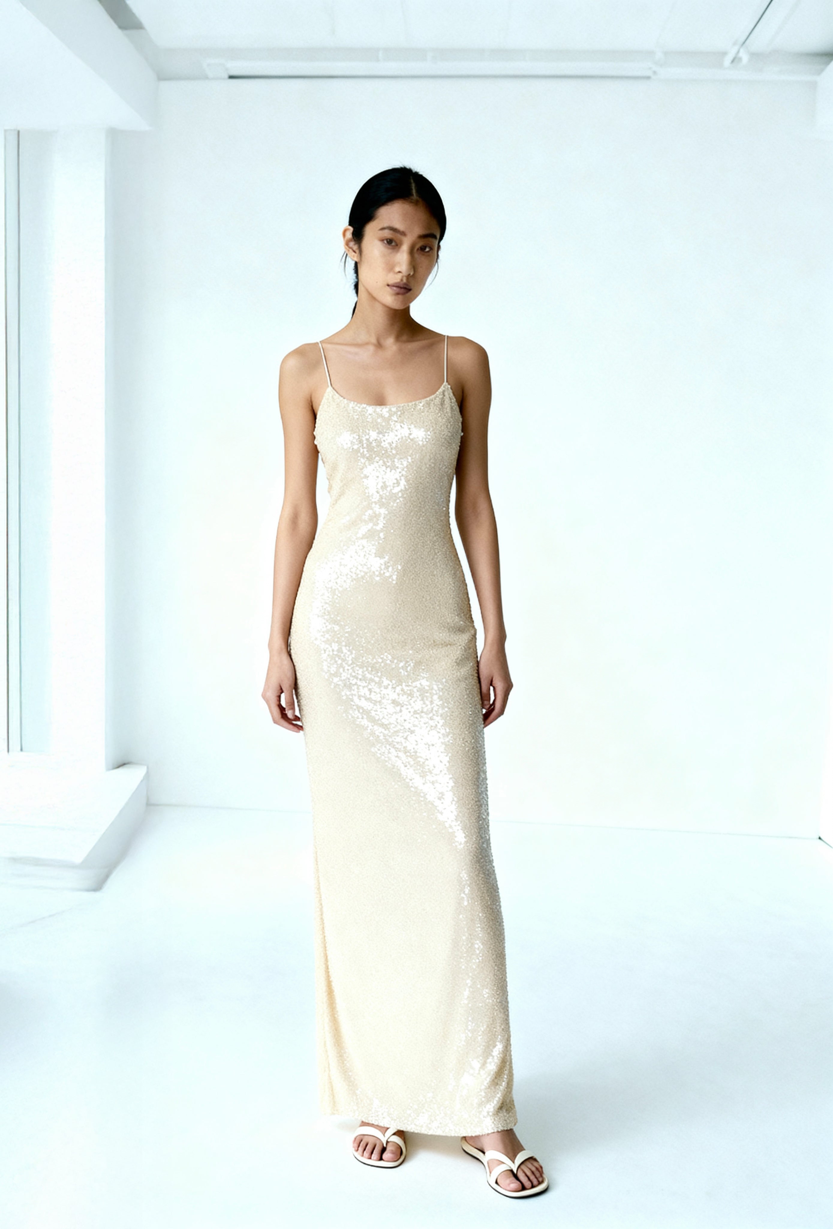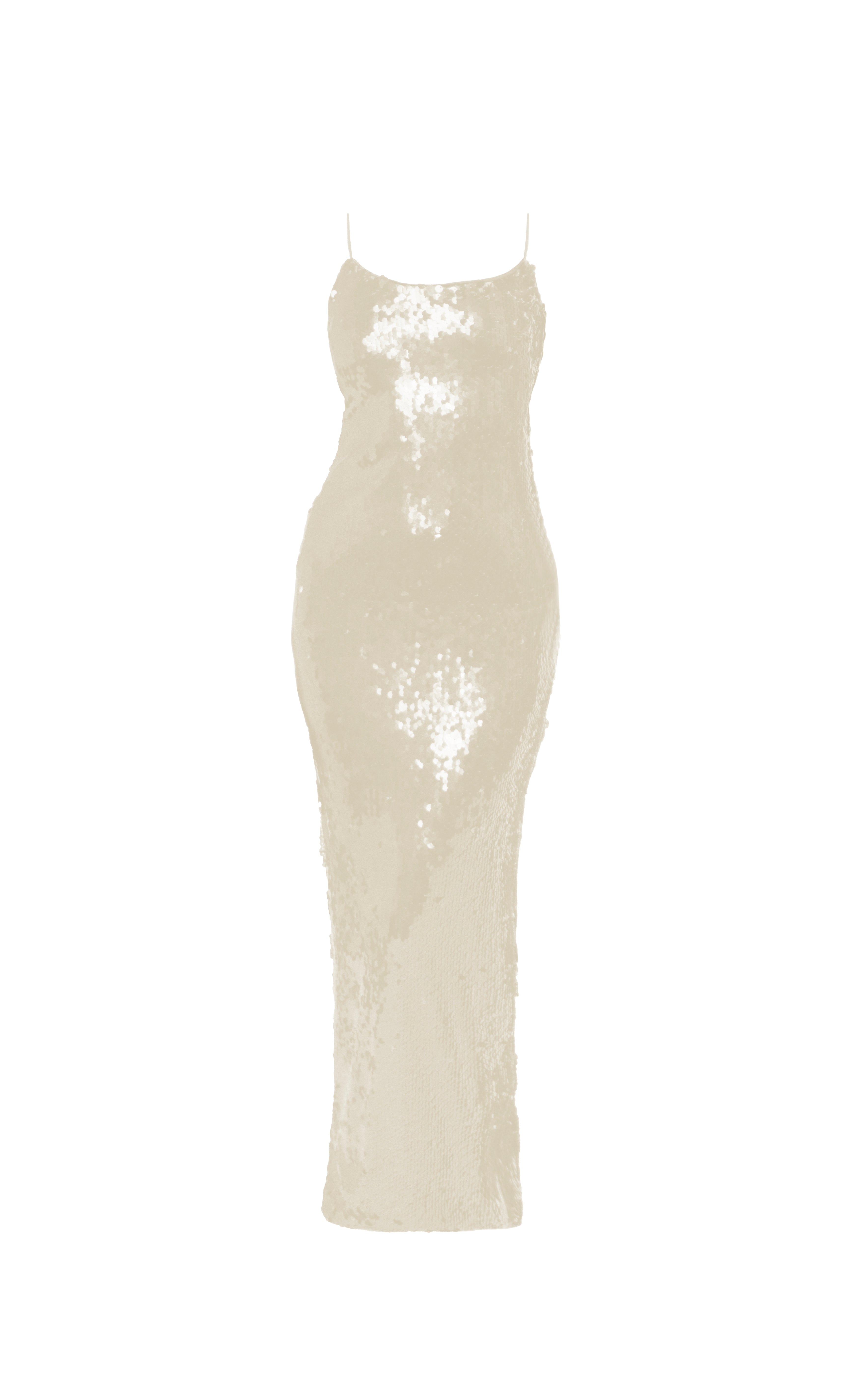 A study in quiet glamour. This creamy Ivory column gown is hand-finished in rich, light-catching sequins that subtly shift with every movement. Designed with barely-there straps and a softly sculpted silhouette, it skims the body with ease, thanks to a silky stretch-jersey interior that offers unexpected comfort beneath the surface.