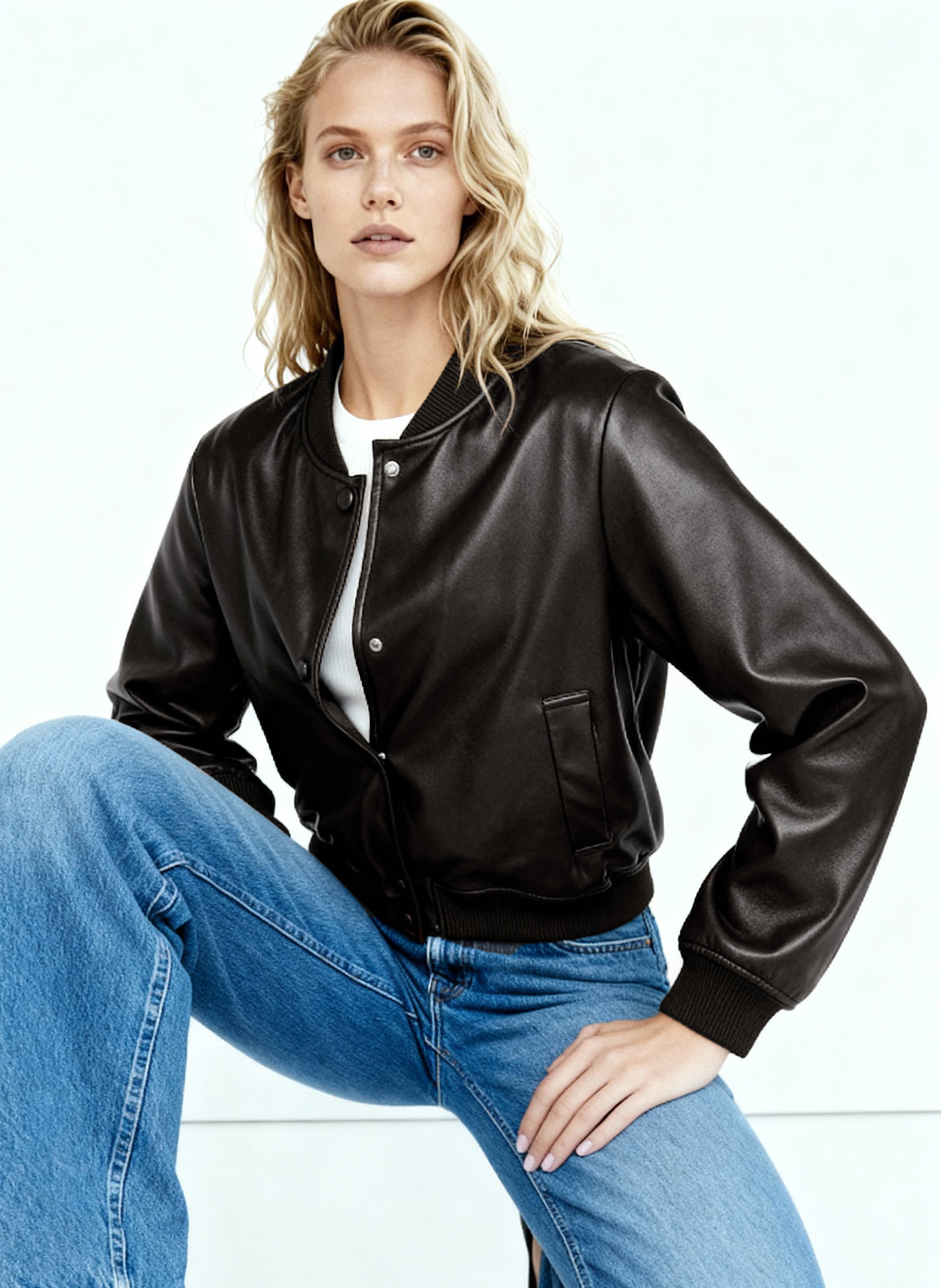 A standout piece in the collection, this bomber is crafted from our Impossibly Soft Vegan Leather—so smooth it feels like butter. Lined with our signature butter satin for an added touch of luxury, it’s finished with leather-covered snaps, a ribbed collar, and cuffs in a timeless bomber silhouette. Elevated yet effortless, it’s the ultimate modern classic.