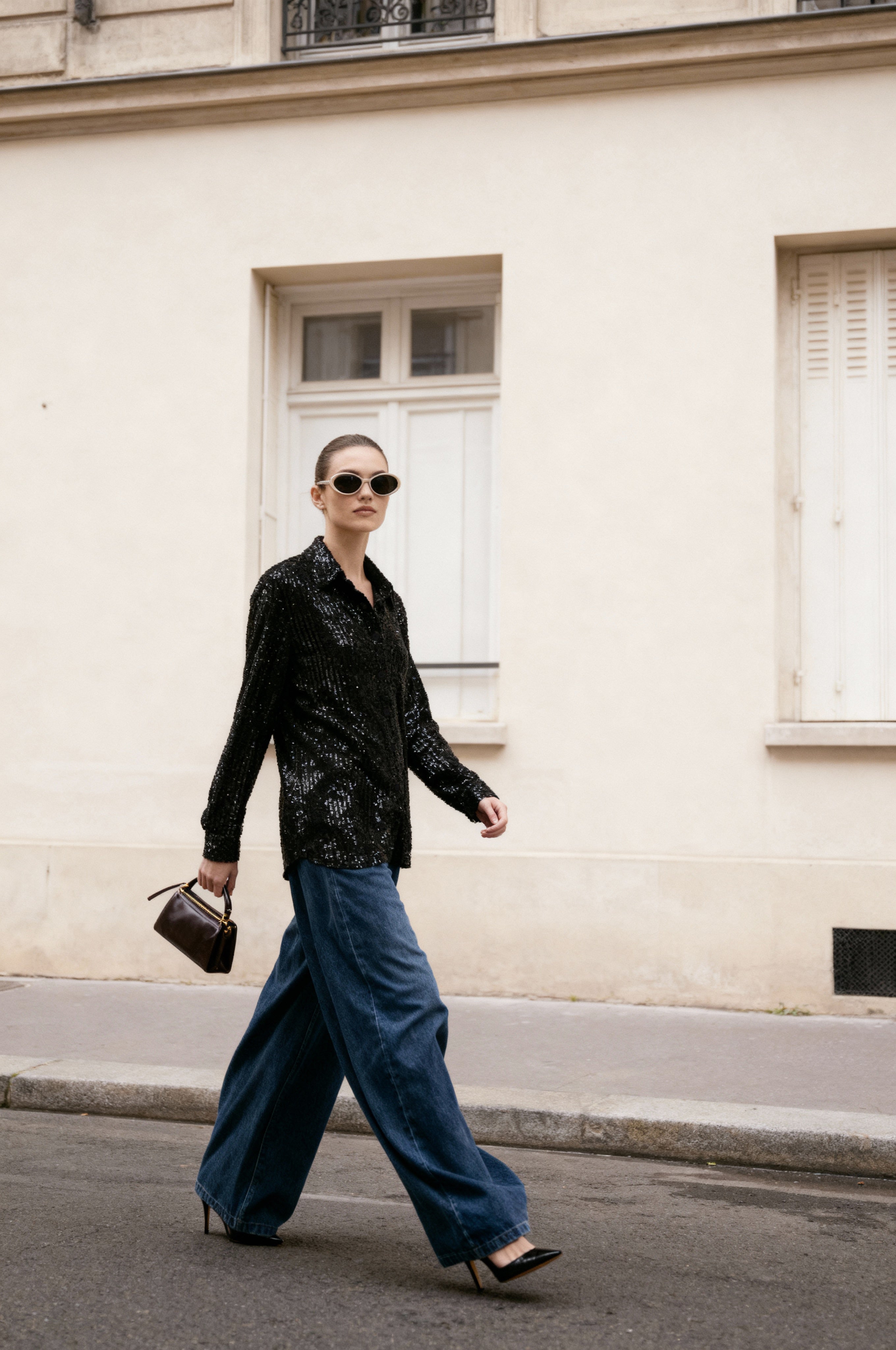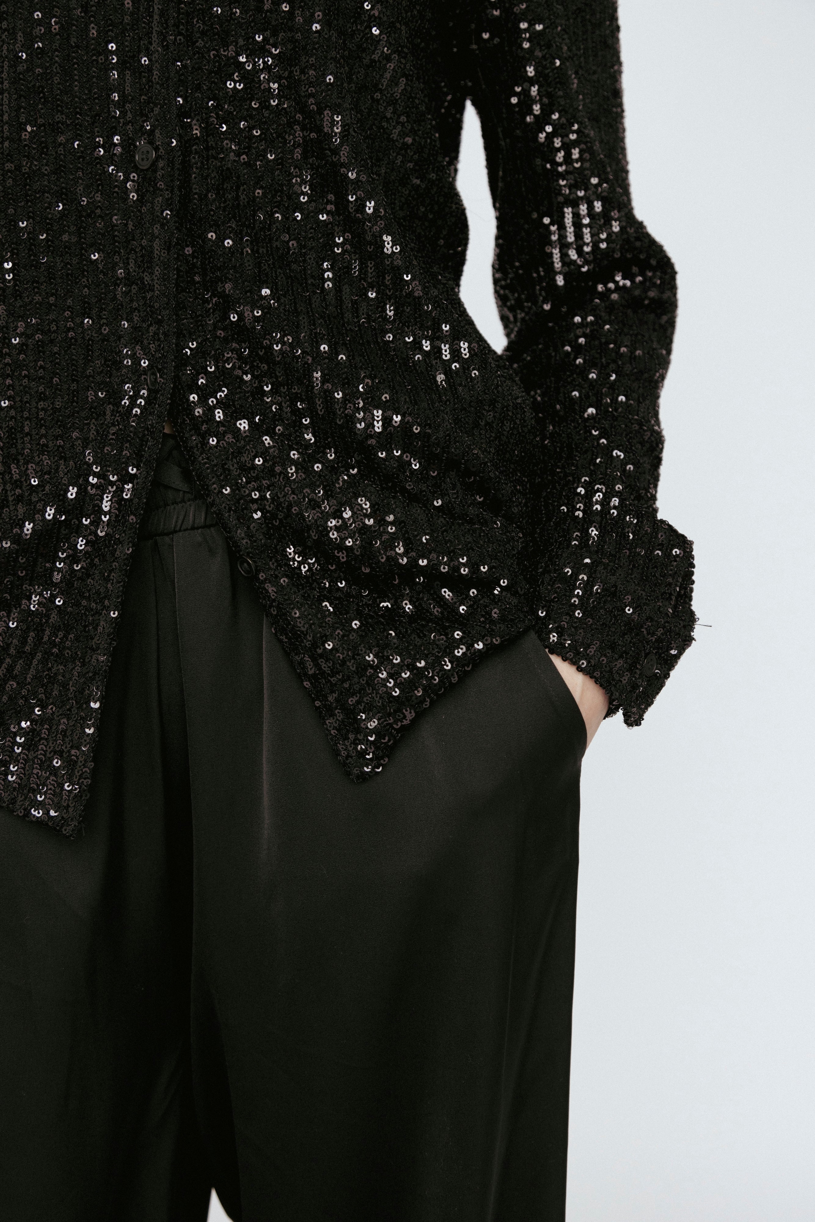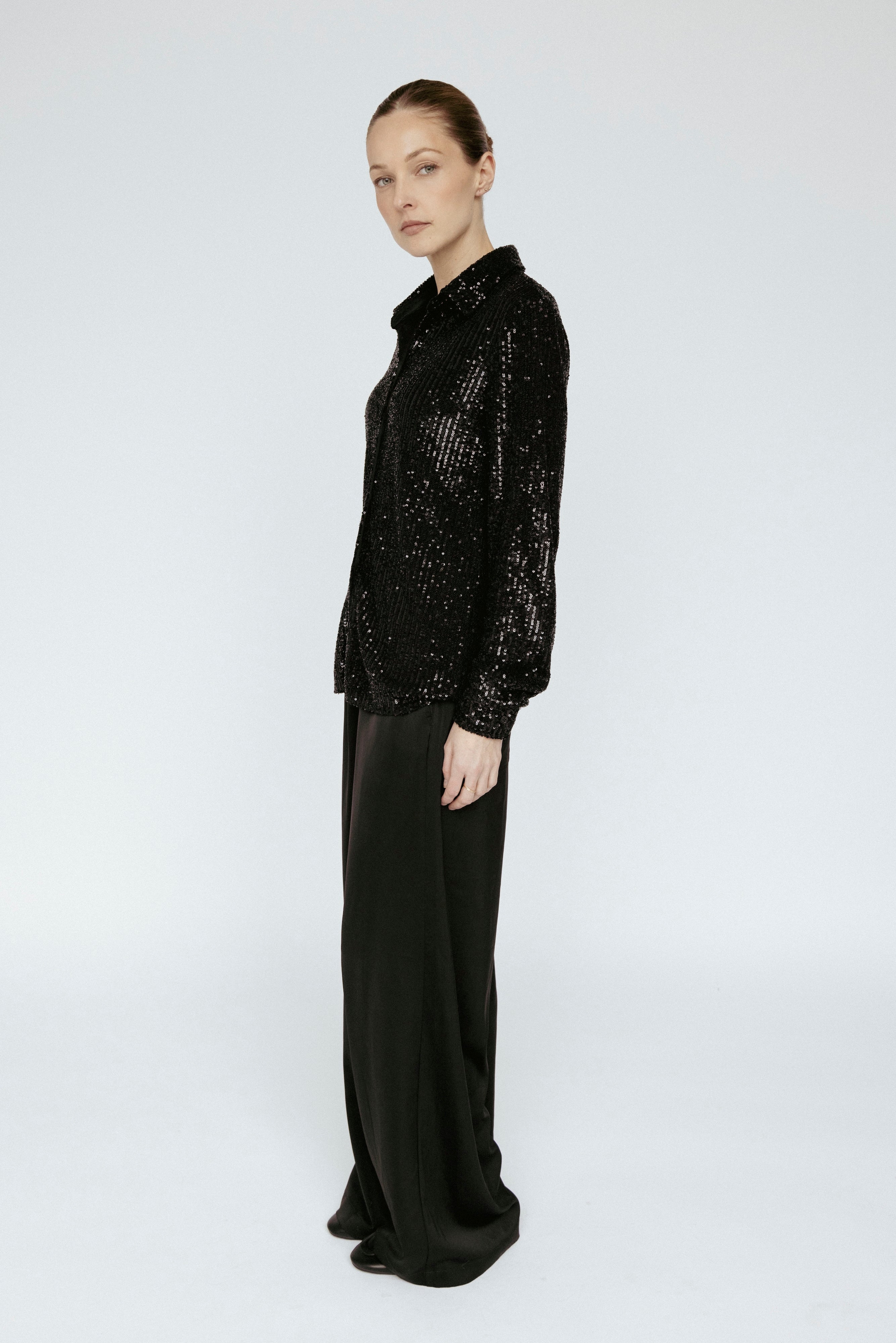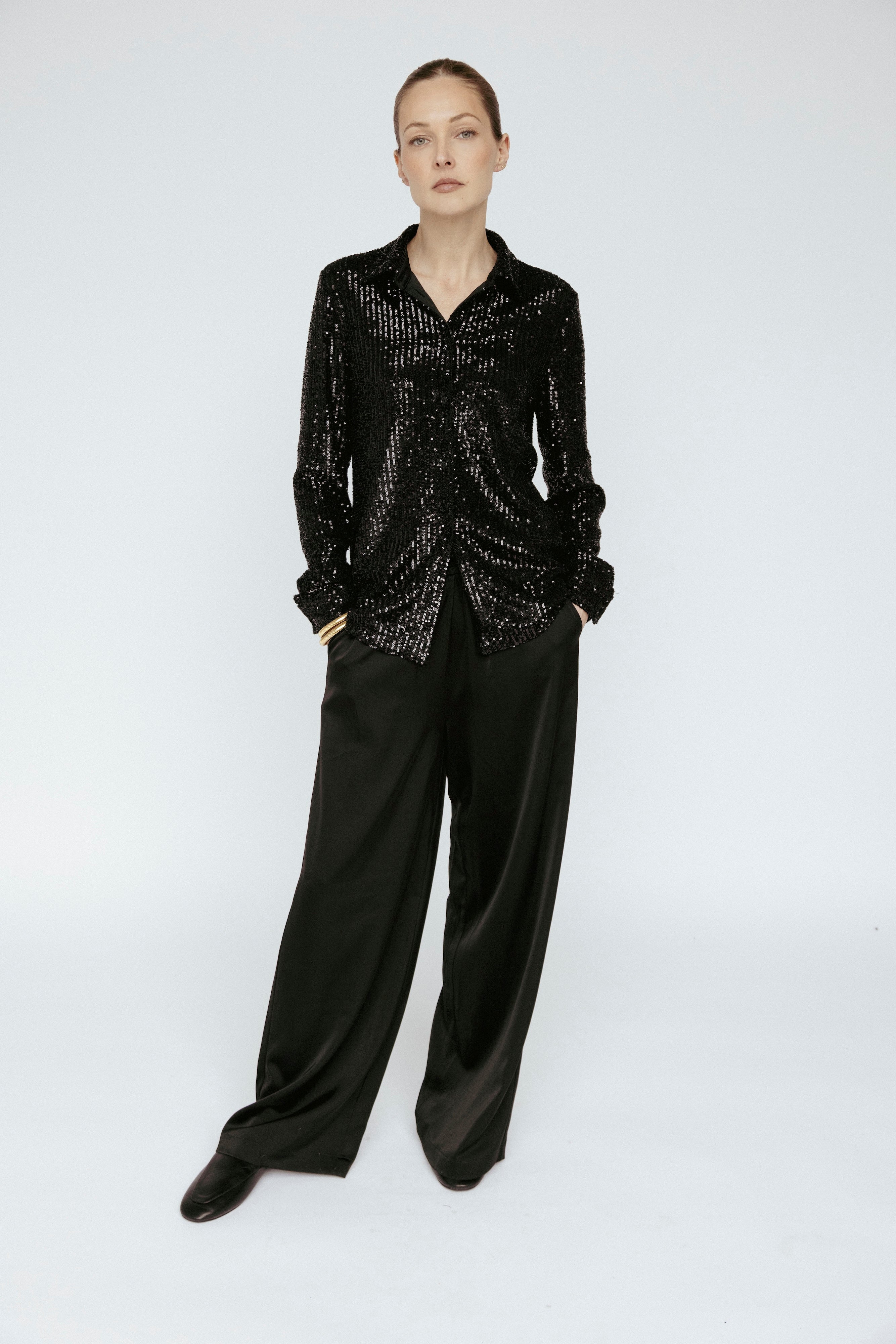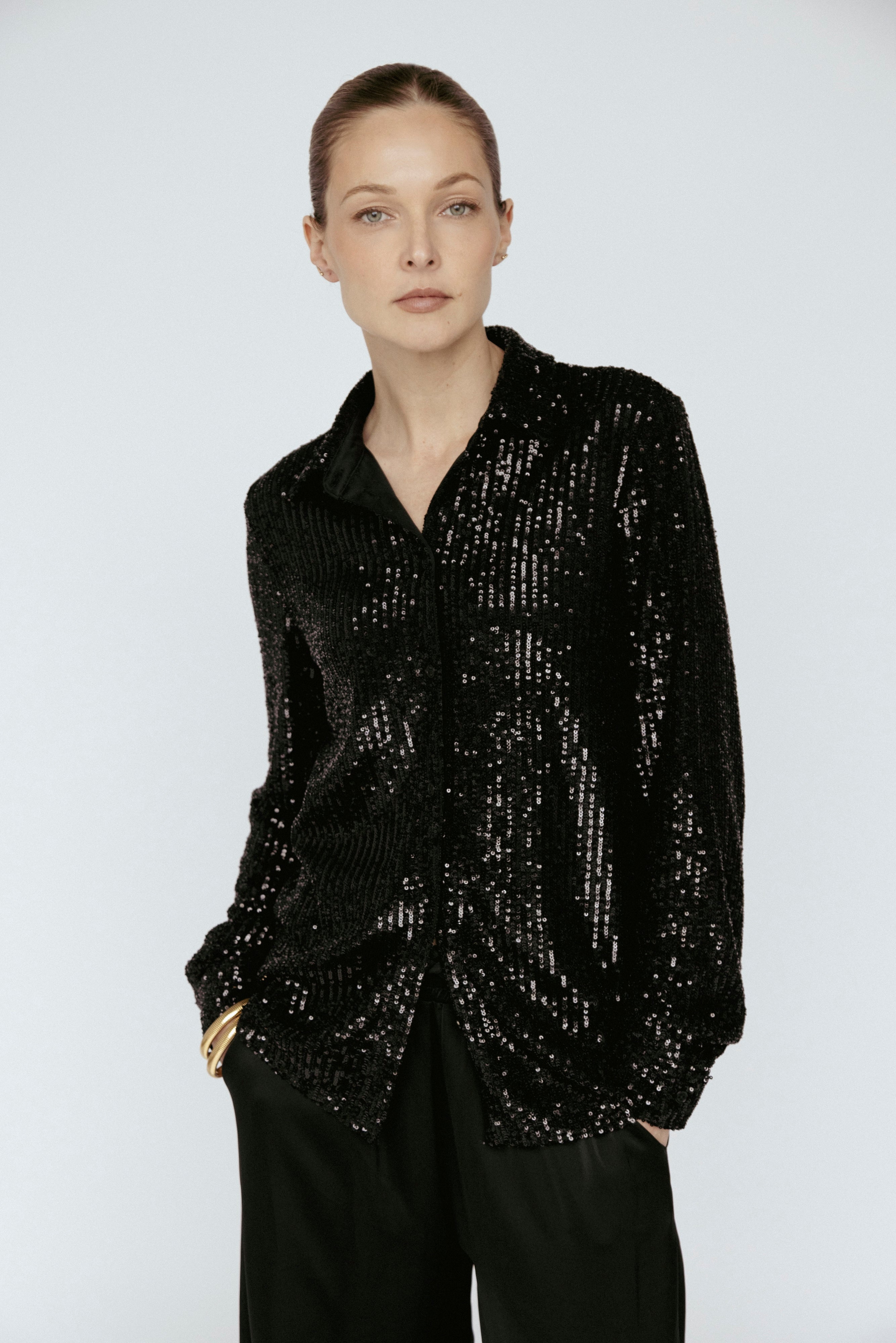 A true statement piece, this classic button-down is reimagined in allover sequins for striking shine and texture. Fully lined with a soft stretch jersey for comfort and ease, it balances glamour with wearability in a timeless silhouette.