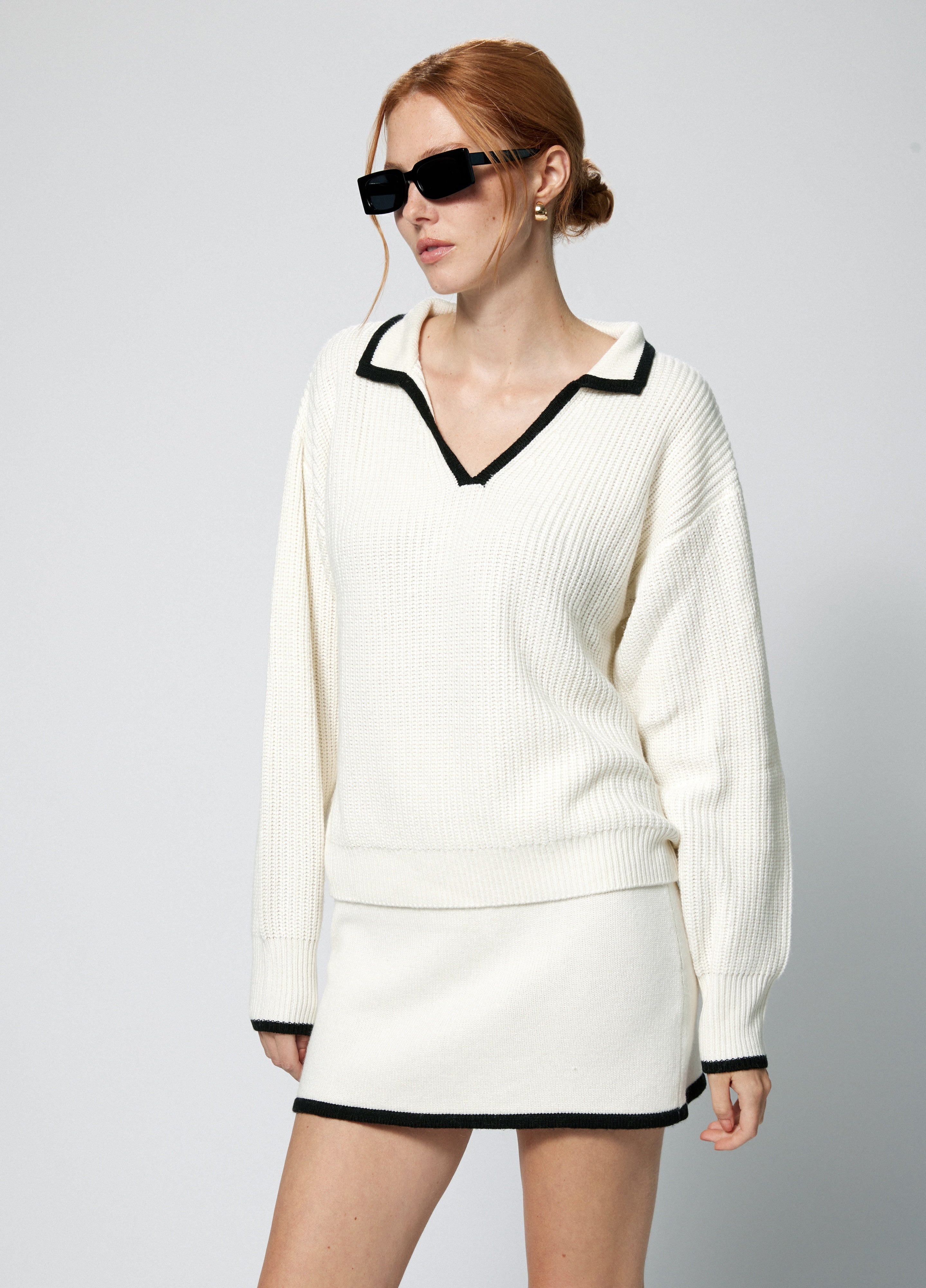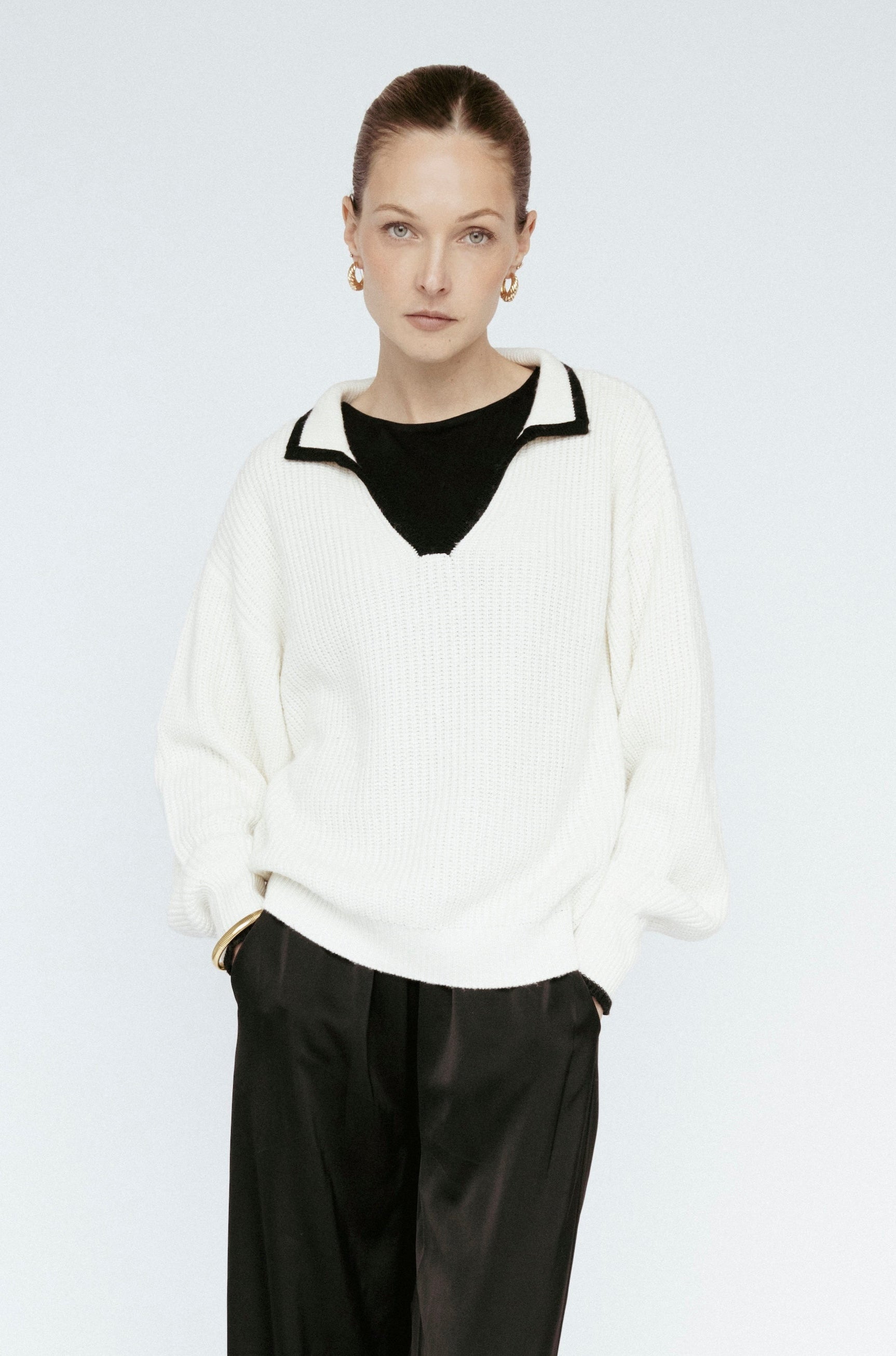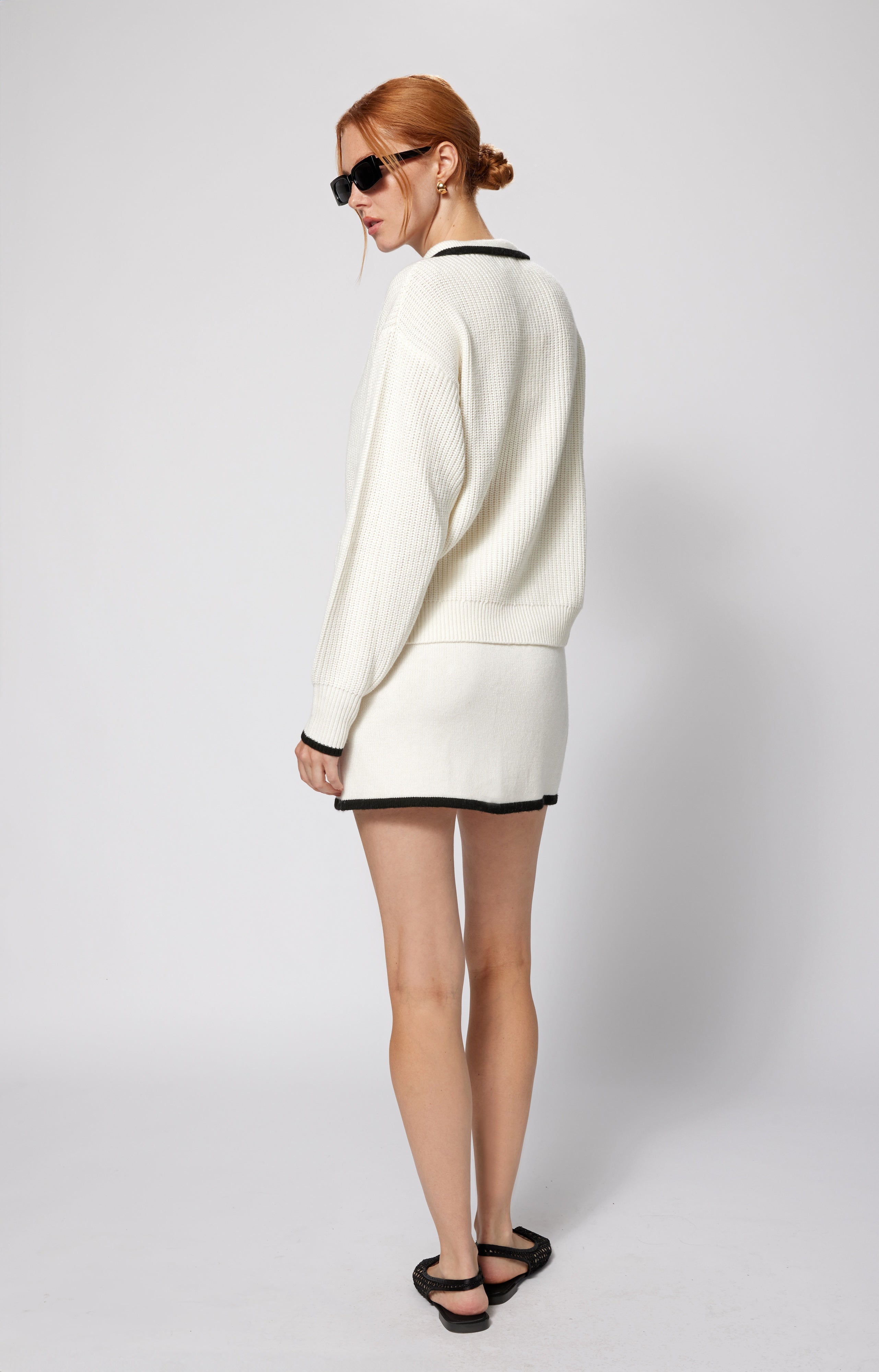 Luxuriously lightweight and irresistibly cozy, this cashmere-blend sweater is a timeless piece with a modern edge. Black trim accents add a striking contrast, giving it a nostalgic yet chic appeal that elevates any outfit.