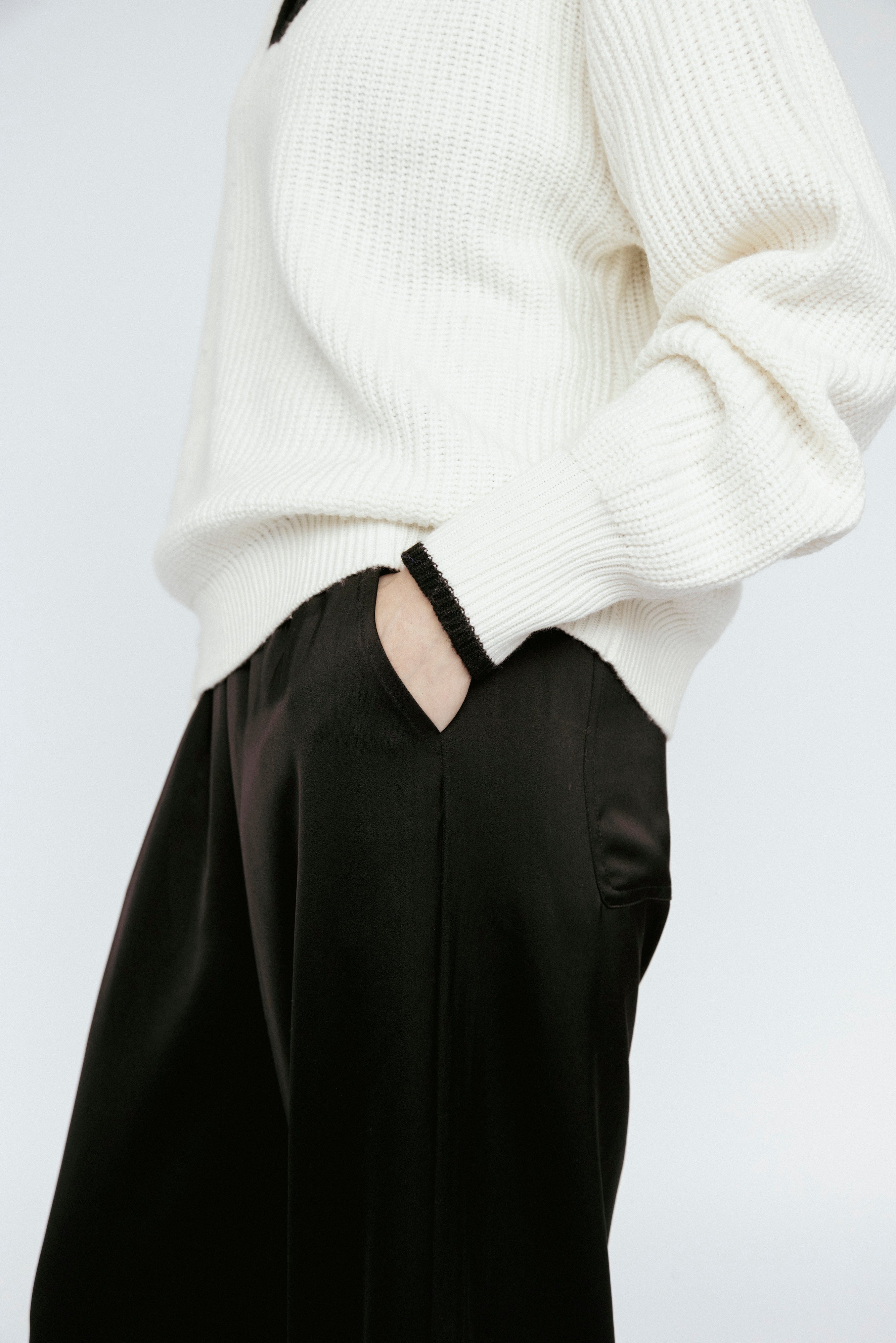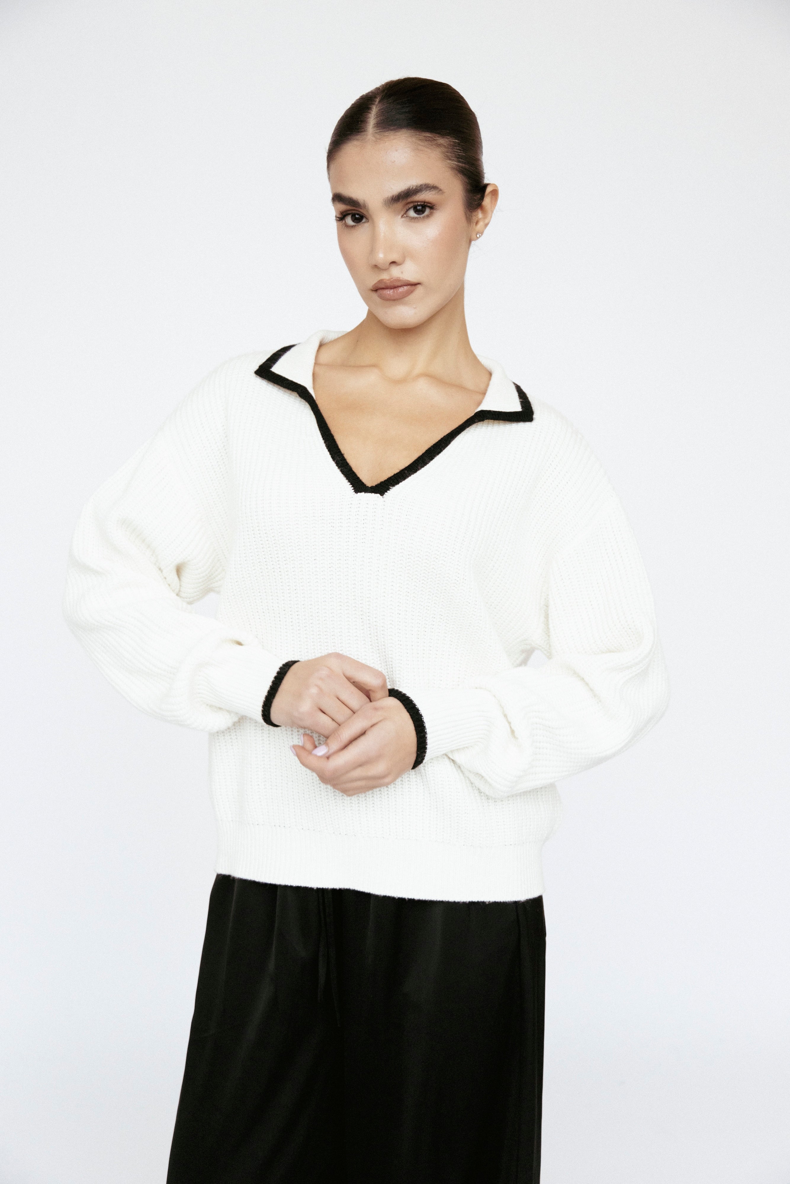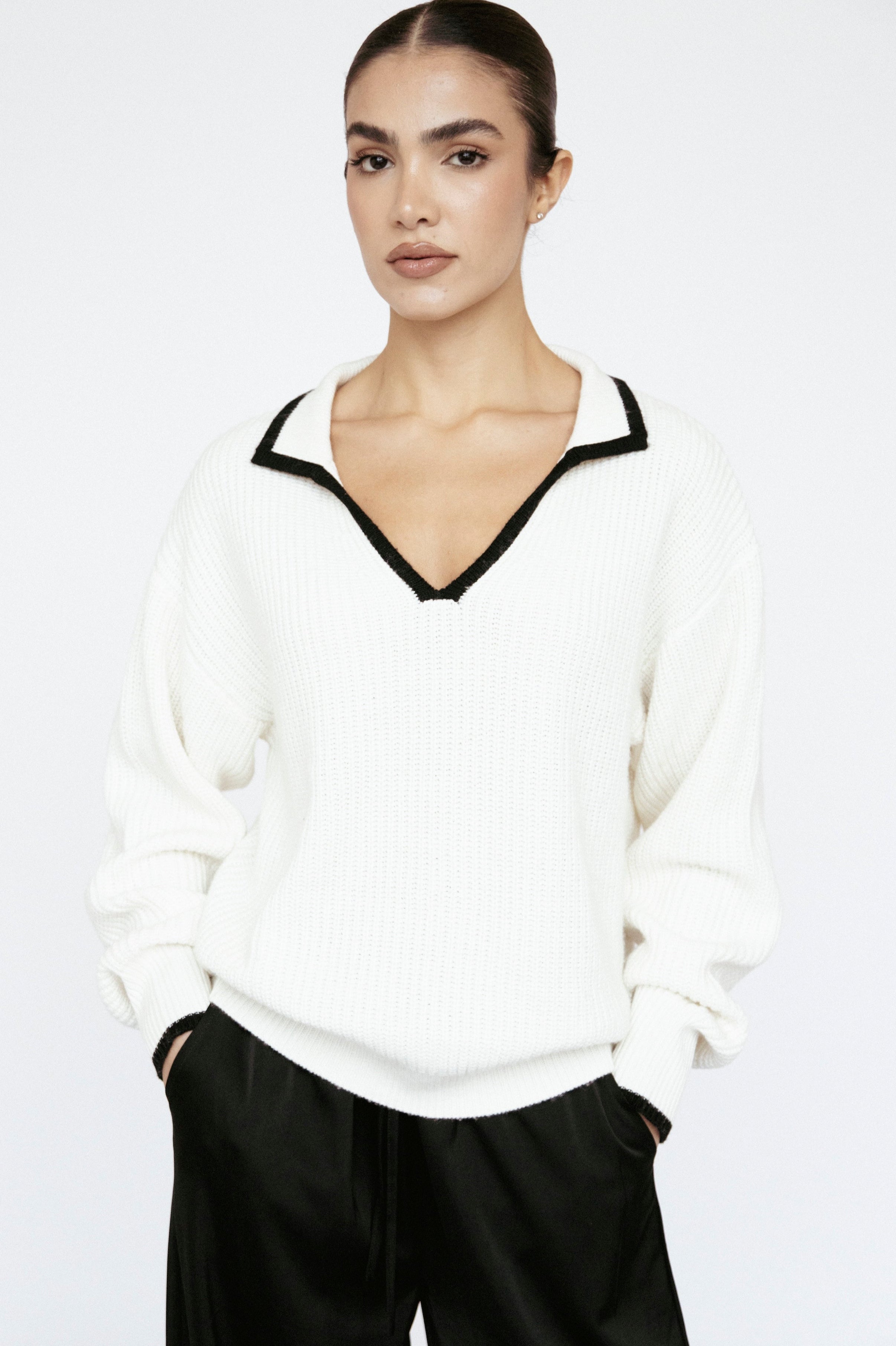 Luxuriously lightweight and irresistibly cozy, this cashmere-blend sweater is a timeless piece with a modern edge. Black trim accents add a striking contrast, giving it a nostalgic yet chic appeal that elevates any outfit.