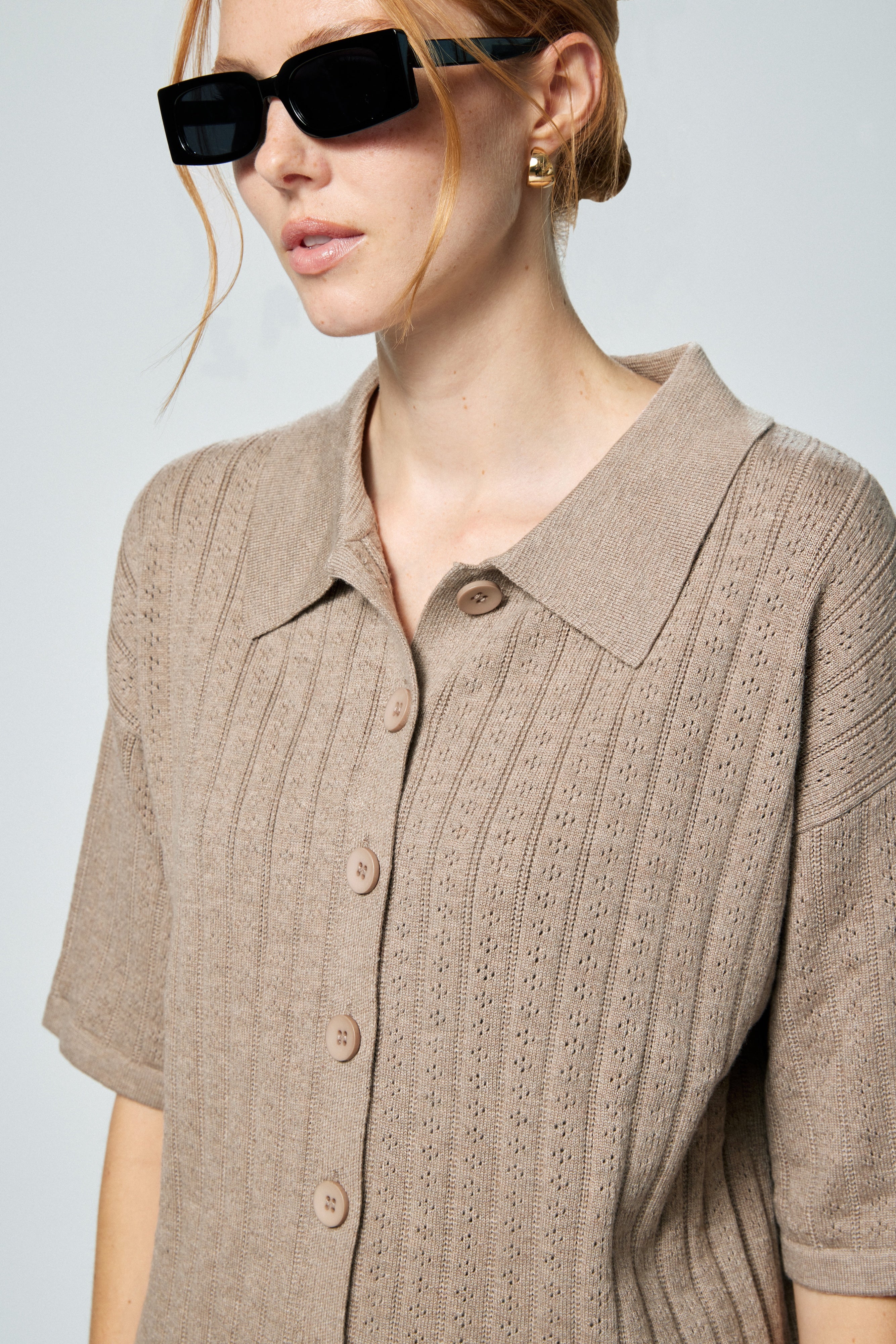Relaxed elegance meets refined craftsmanship in this oversized knit button-down top. Perfect for lounging at home or traveling in style, it pairs beautifully with the matching pant for the ultimate in laid-back luxury.