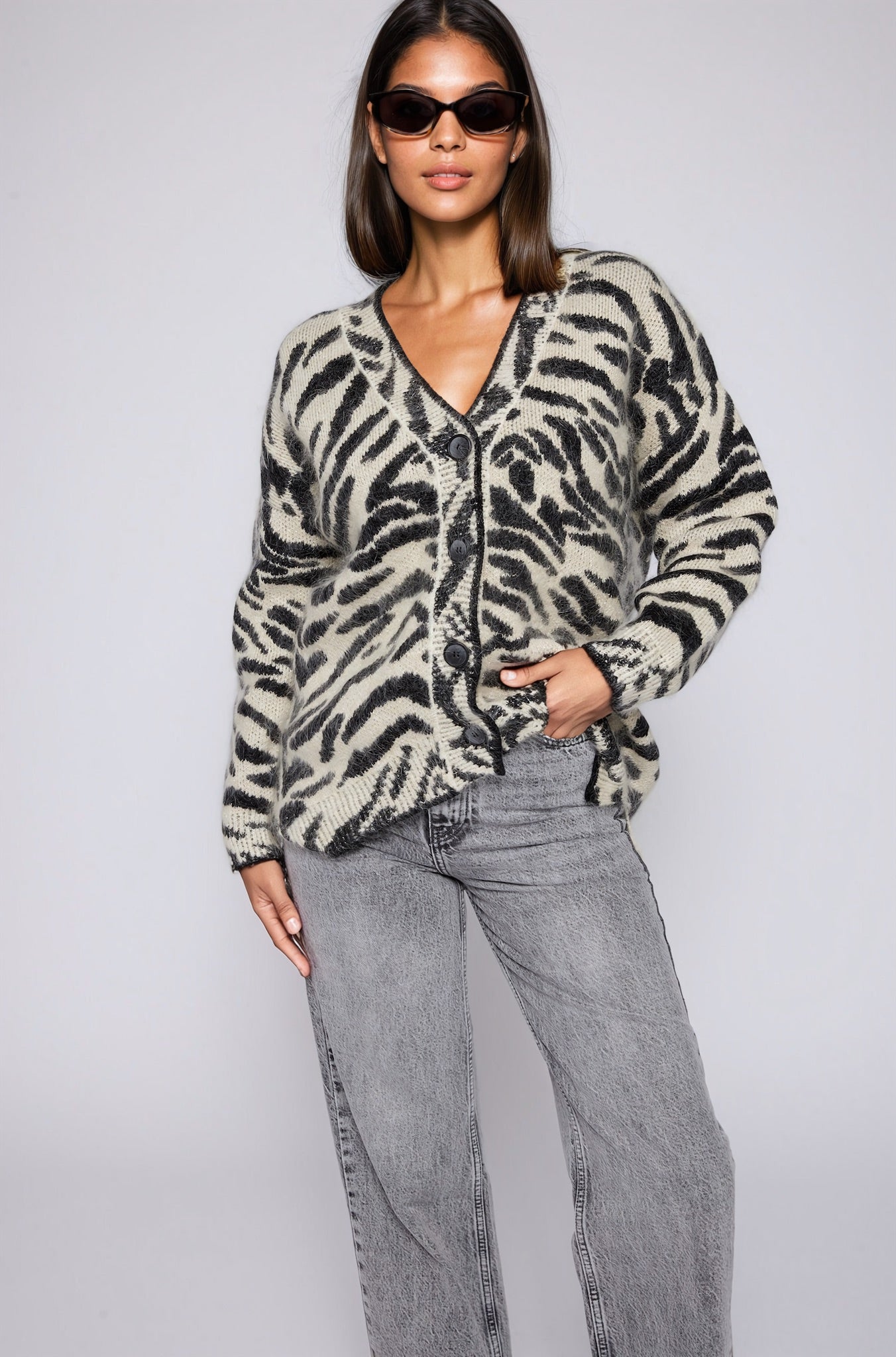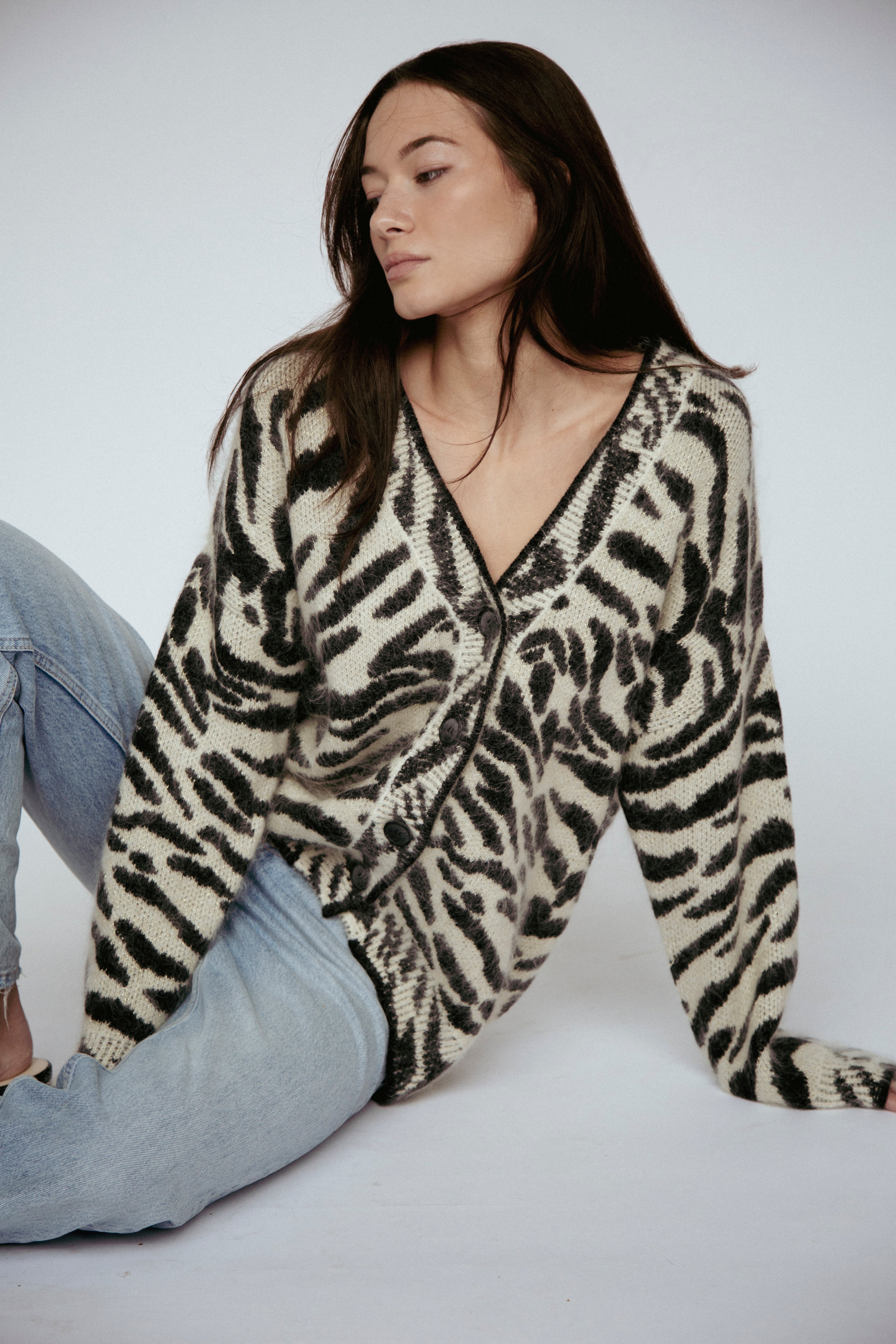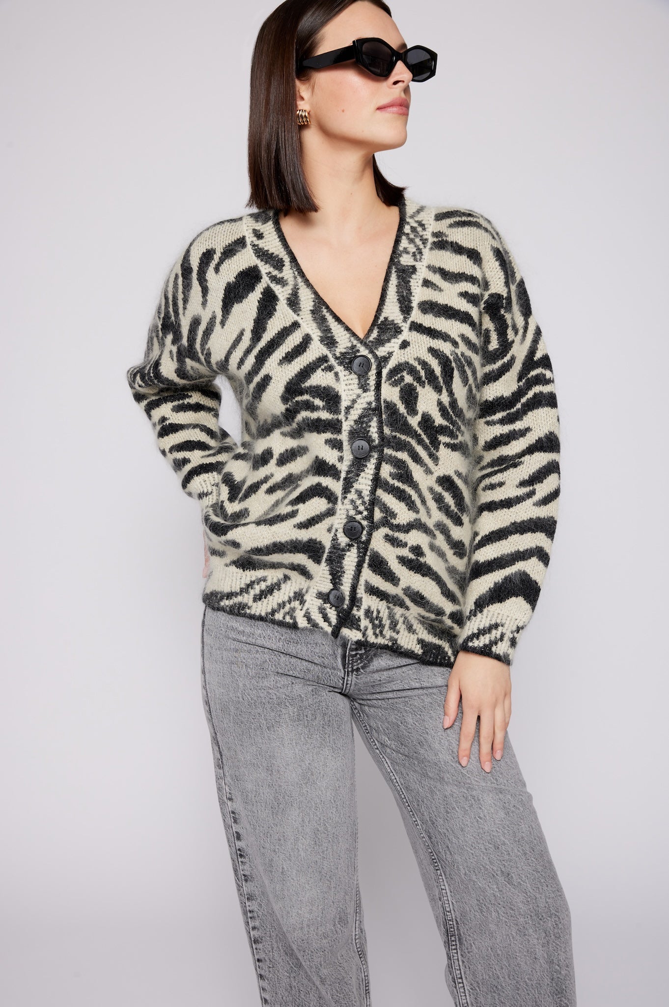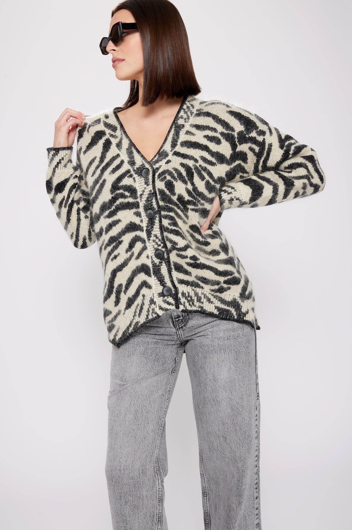 Indulge in luxury with our couture-quality Mohair blend cardigan. This incredibly soft and cozy piece features a subtle metallic shine woven into the pattern, adding a touch of elegance to this knit. This statement-print cardigan boasts a button front, a relaxed easy to wear fit, and a slightly longer back for a sophisticated silhouette. Warm and refined, this cardigan is the perfect blend of comfort and style for cool days.