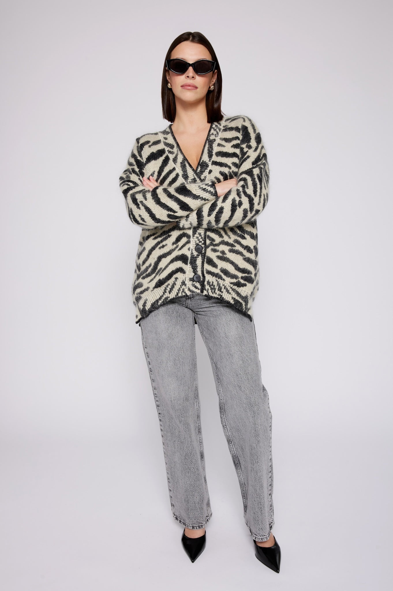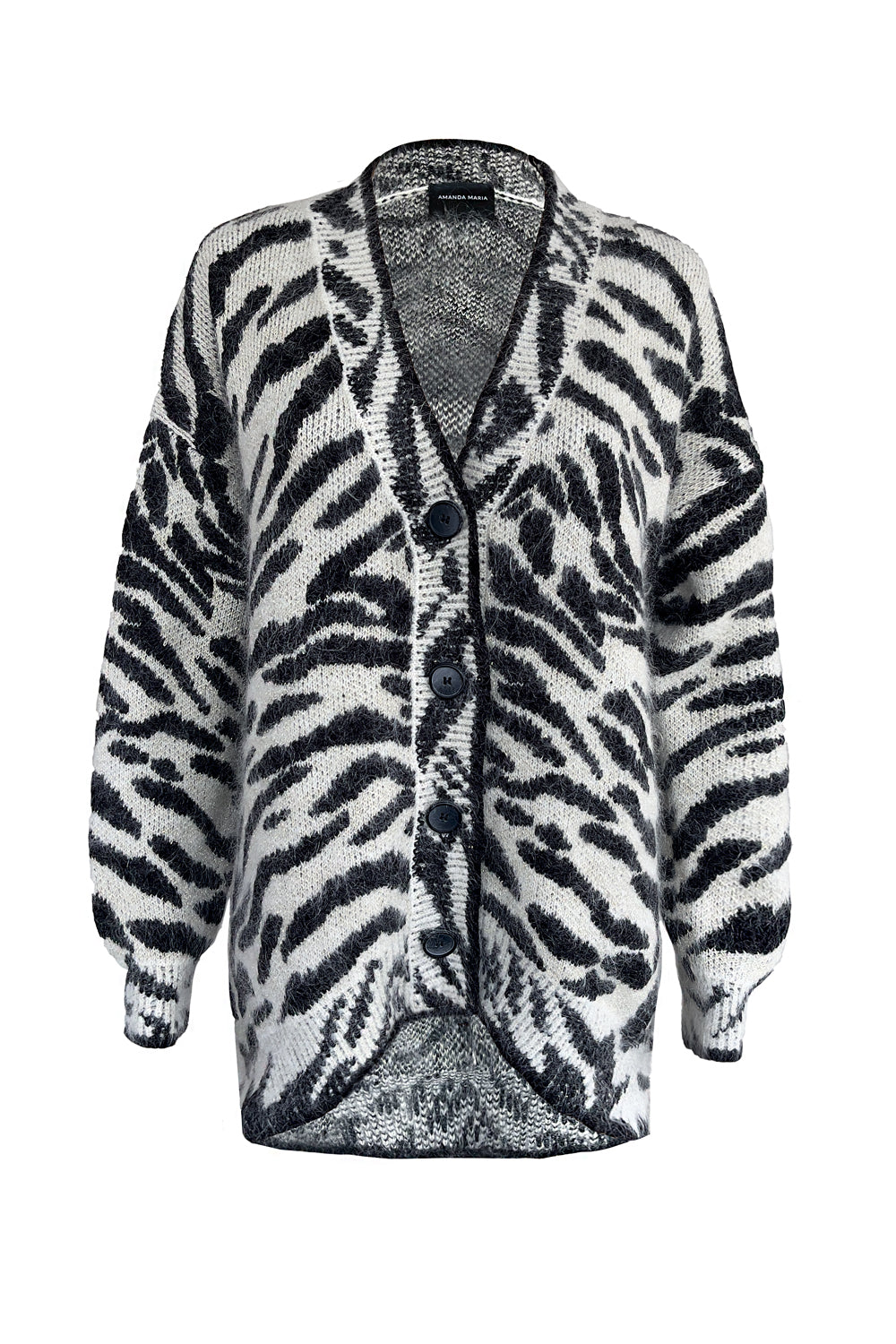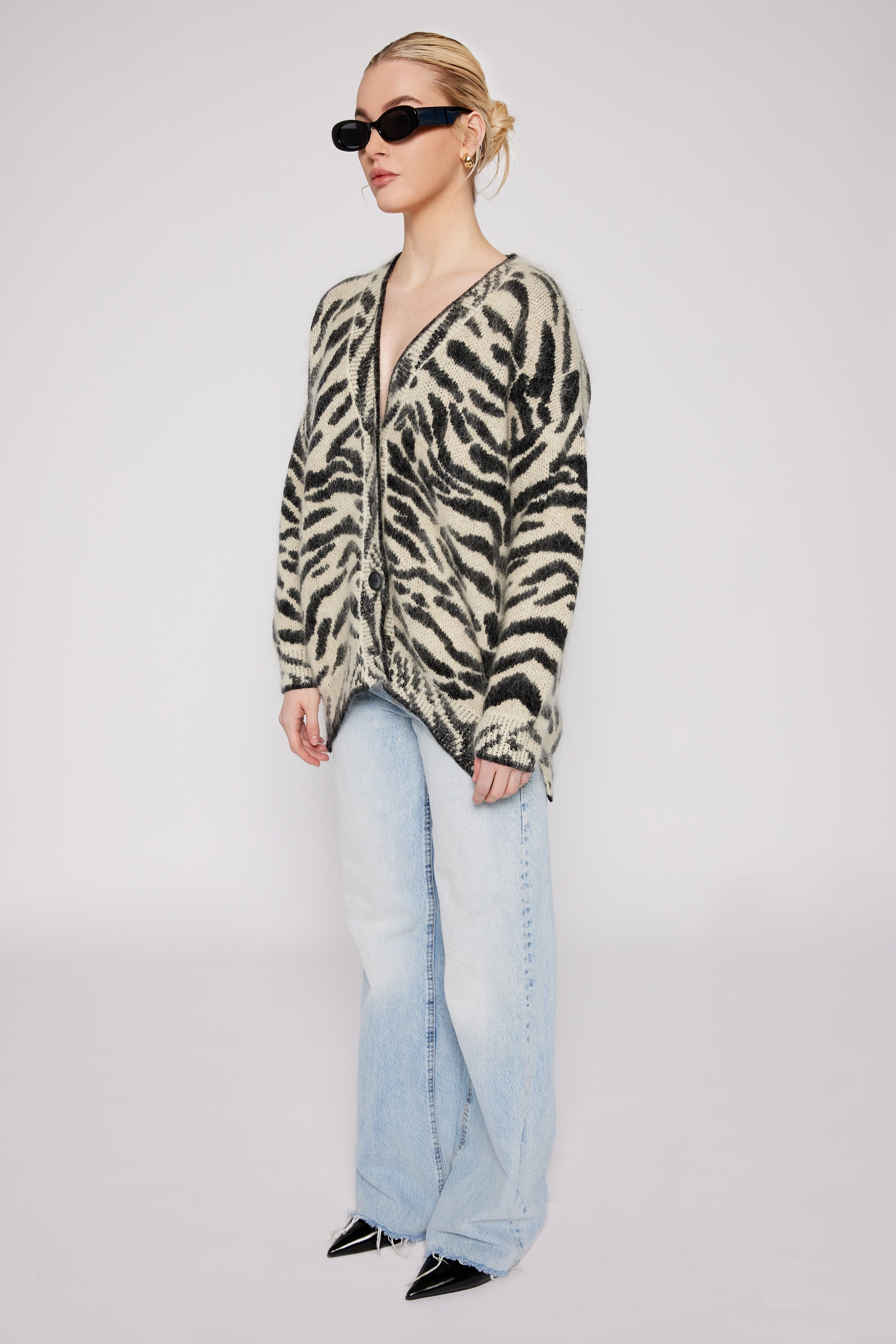 Indulge in luxury with our couture-quality Mohair blend cardigan. This incredibly soft and cozy piece features a subtle metallic shine woven into the pattern, adding a touch of elegance to this knit. This statement-print cardigan boasts a button front, a relaxed easy to wear fit, and a slightly longer back for a sophisticated silhouette. Warm and refined, this cardigan is the perfect blend of comfort and style for cool days.