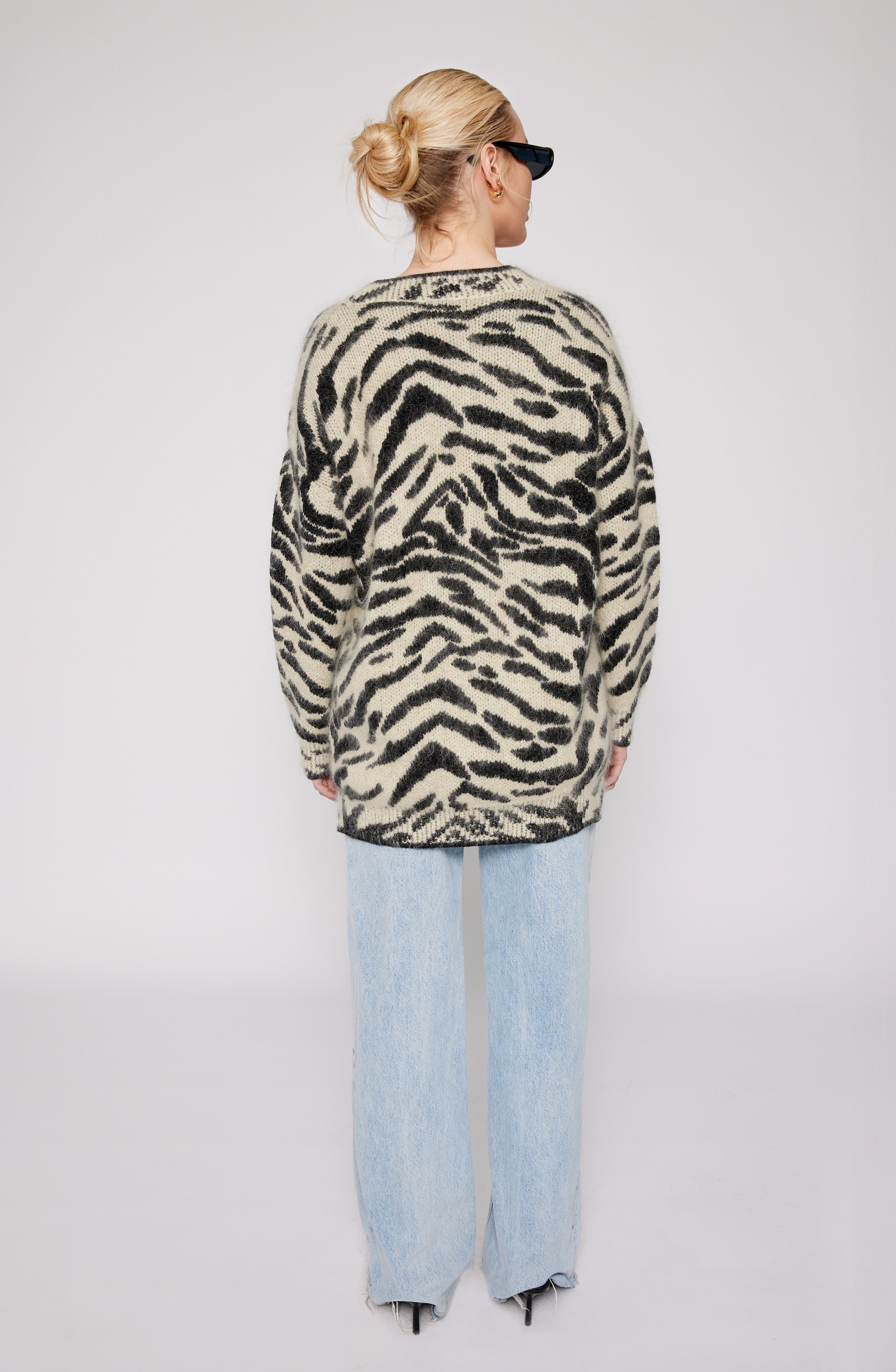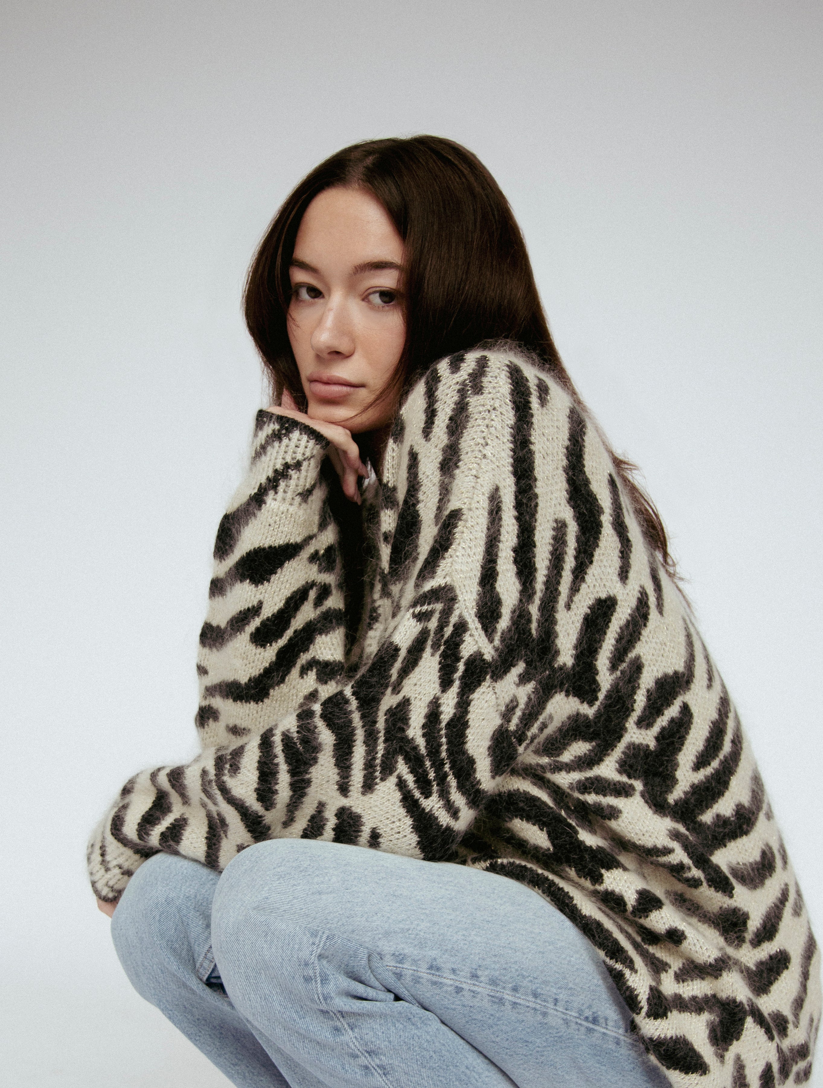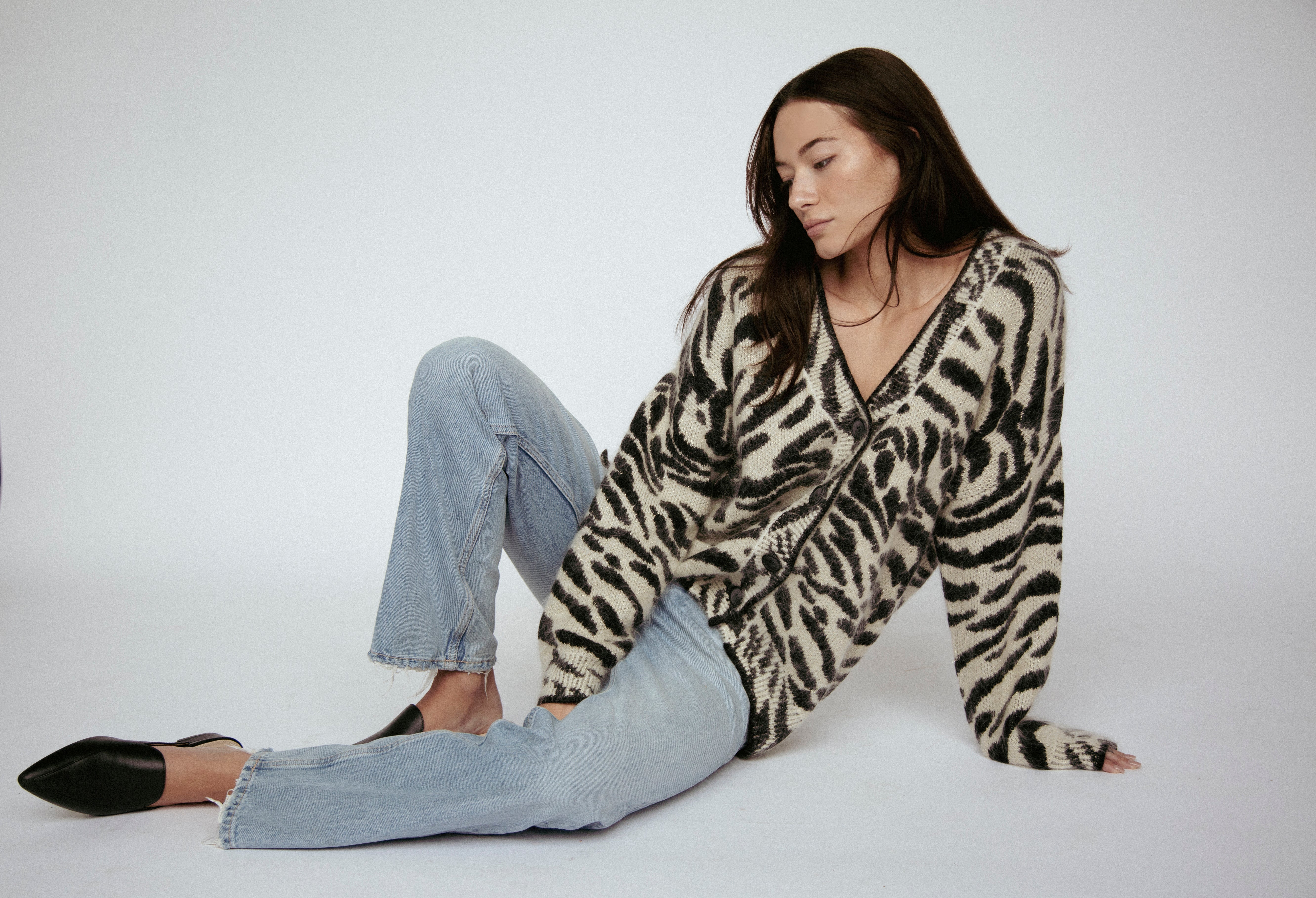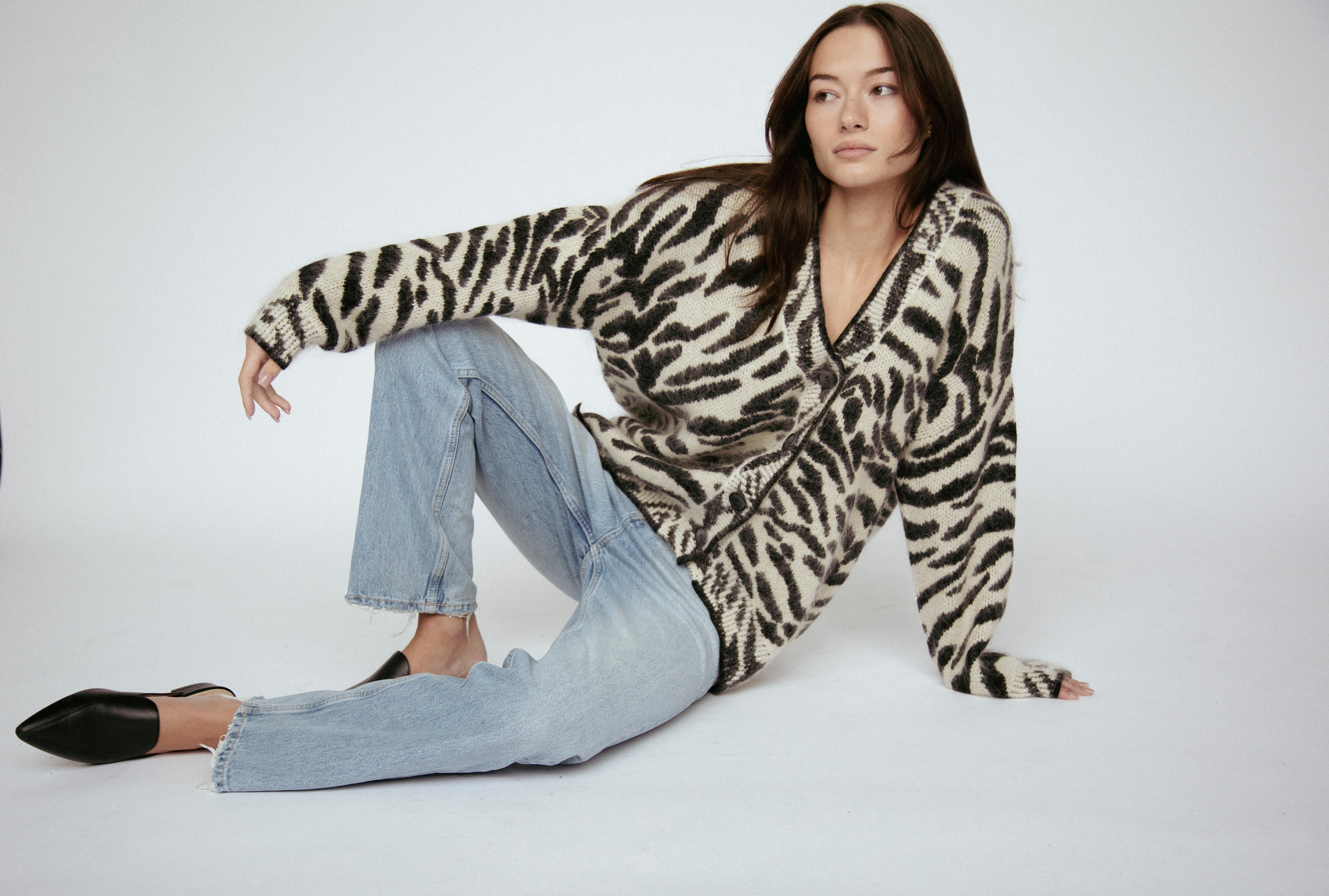 Indulge in luxury with our couture-quality Mohair blend cardigan. This incredibly soft and cozy piece features a subtle metallic shine woven into the pattern, adding a touch of elegance to this knit. This statement-print cardigan boasts a button front, a relaxed easy to wear fit, and a slightly longer back for a sophisticated silhouette. Warm and refined, this cardigan is the perfect blend of comfort and style for cool days.