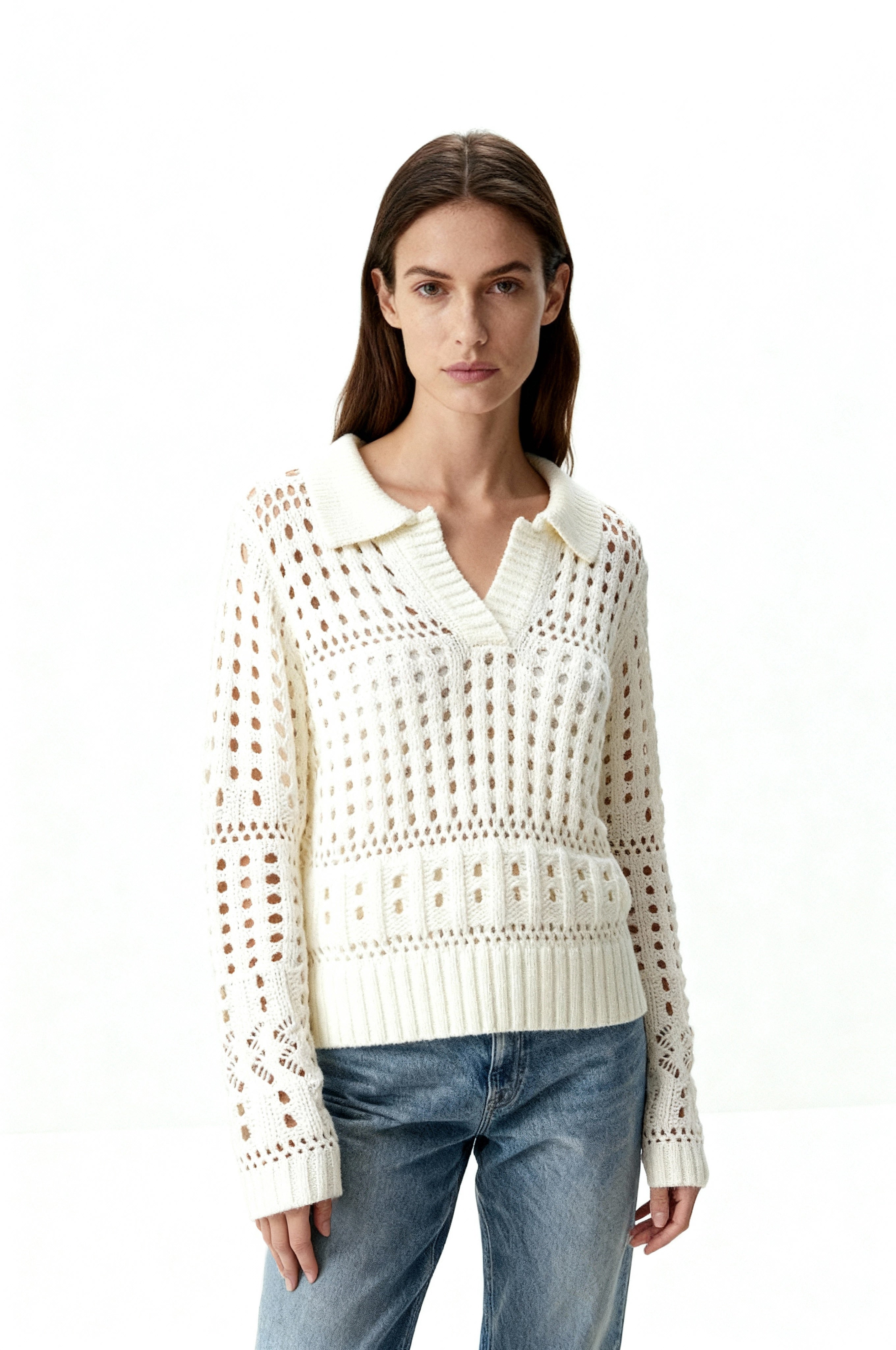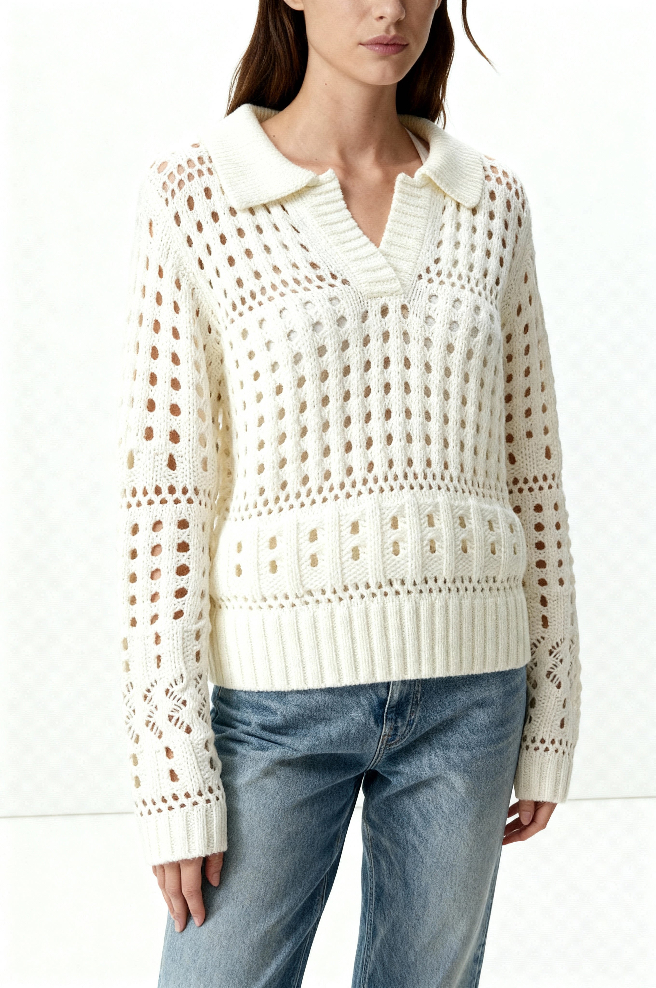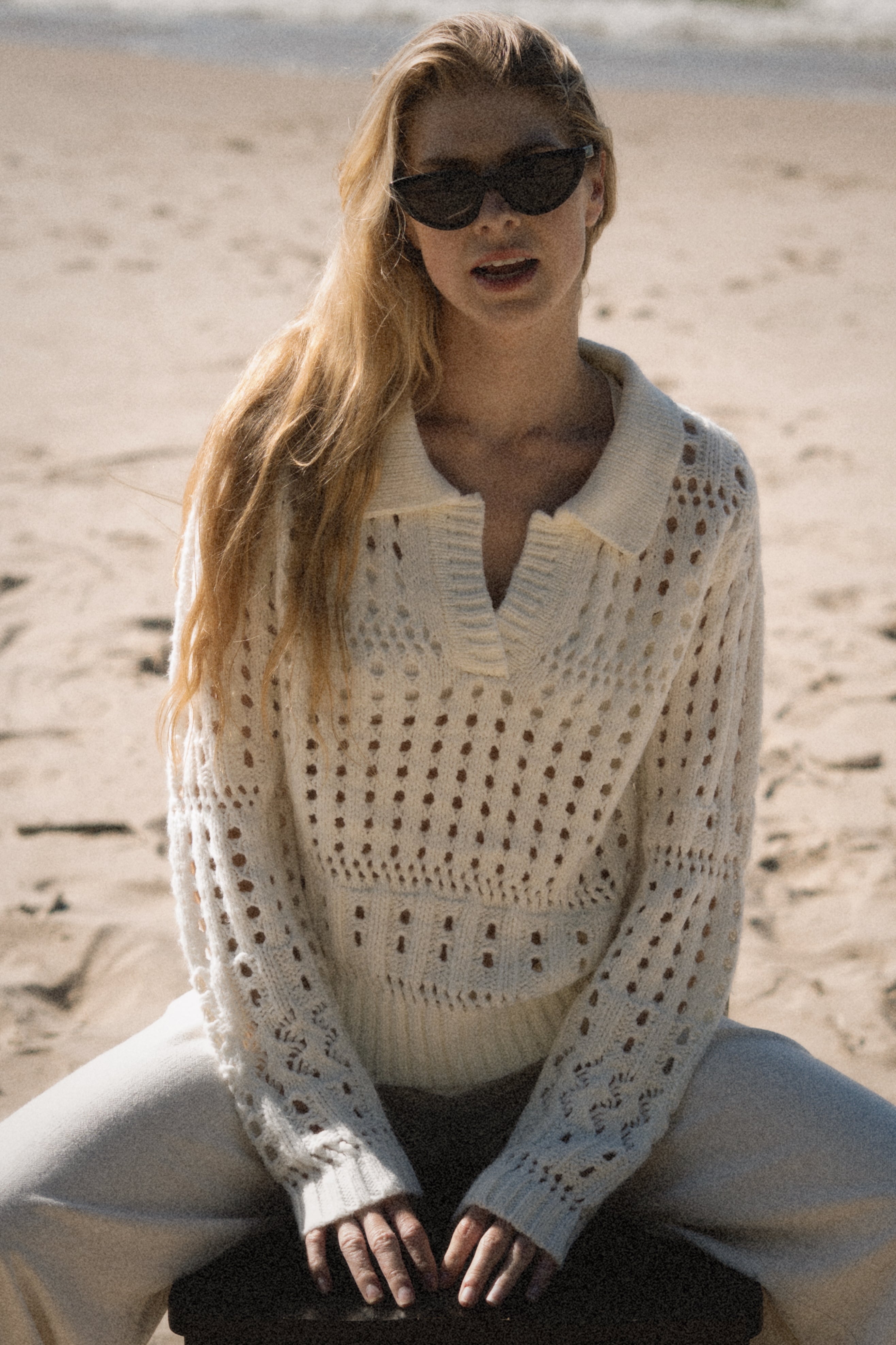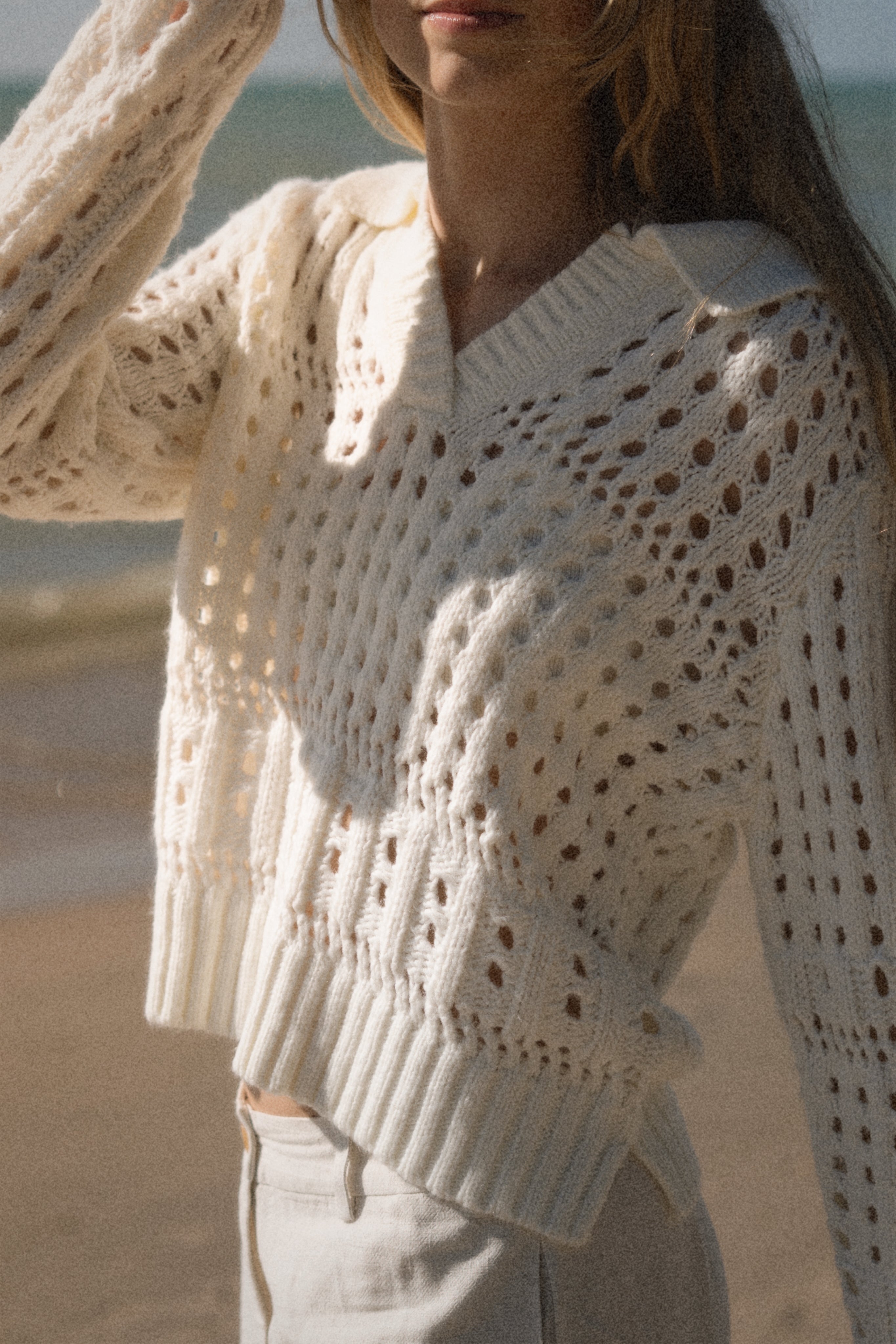 Soft and airy, this collared sweater is crafted in a plush open weave that mimics the look of fine crochet. Perfect for transitional weather, it balances cozy texture with breathable ease—making it the ideal layer for the beach, spring, or fall when you want comfort without heavy warmth