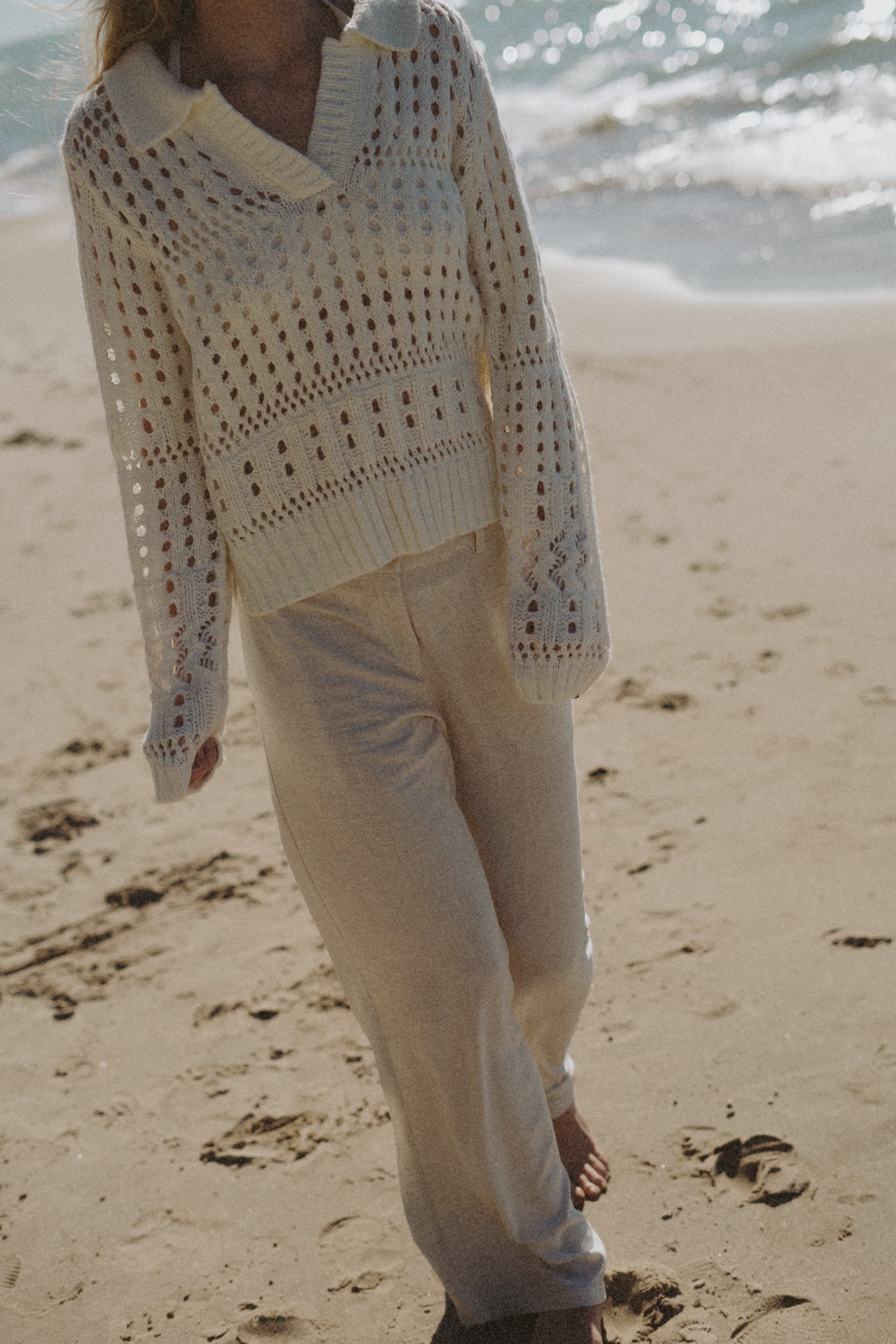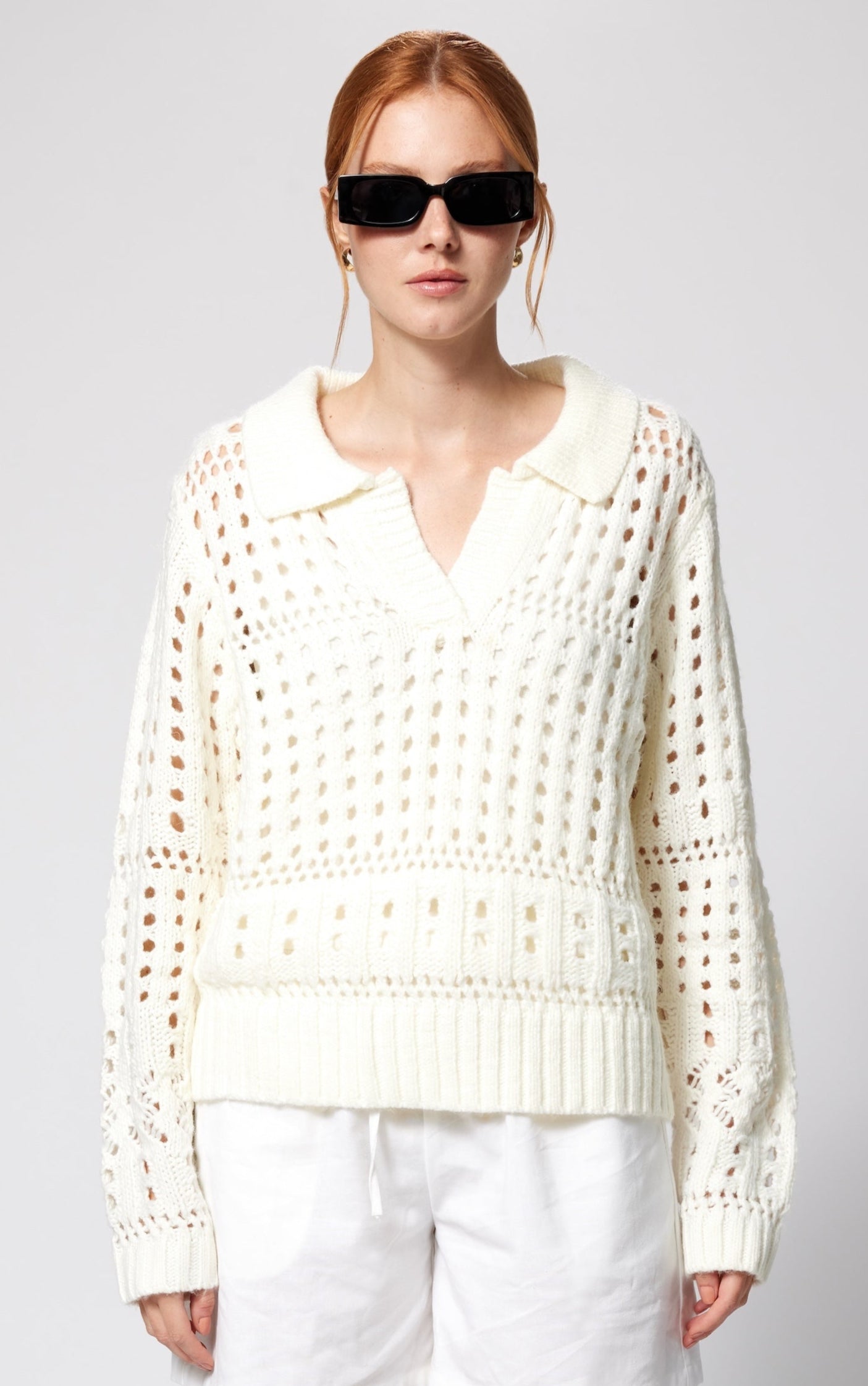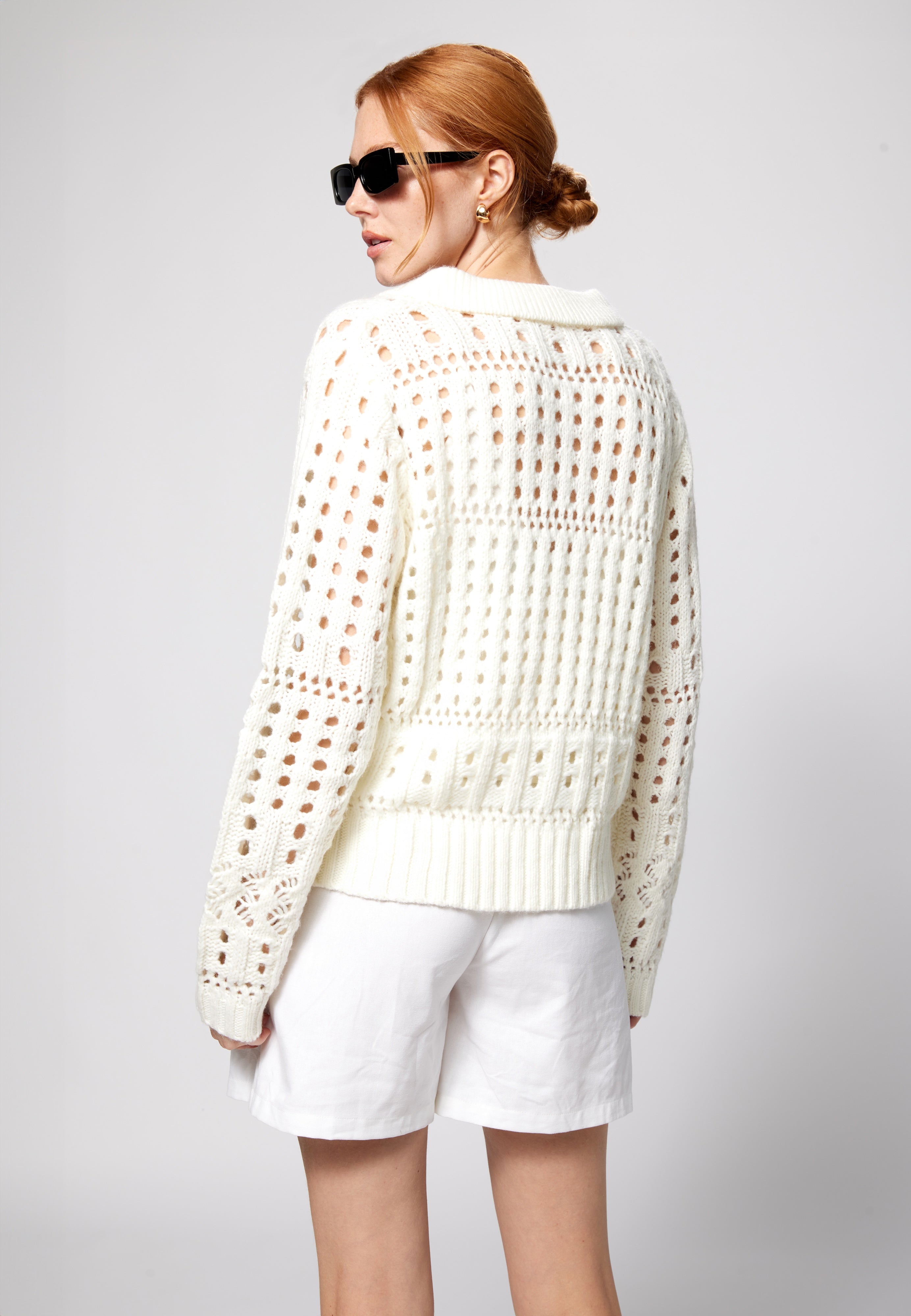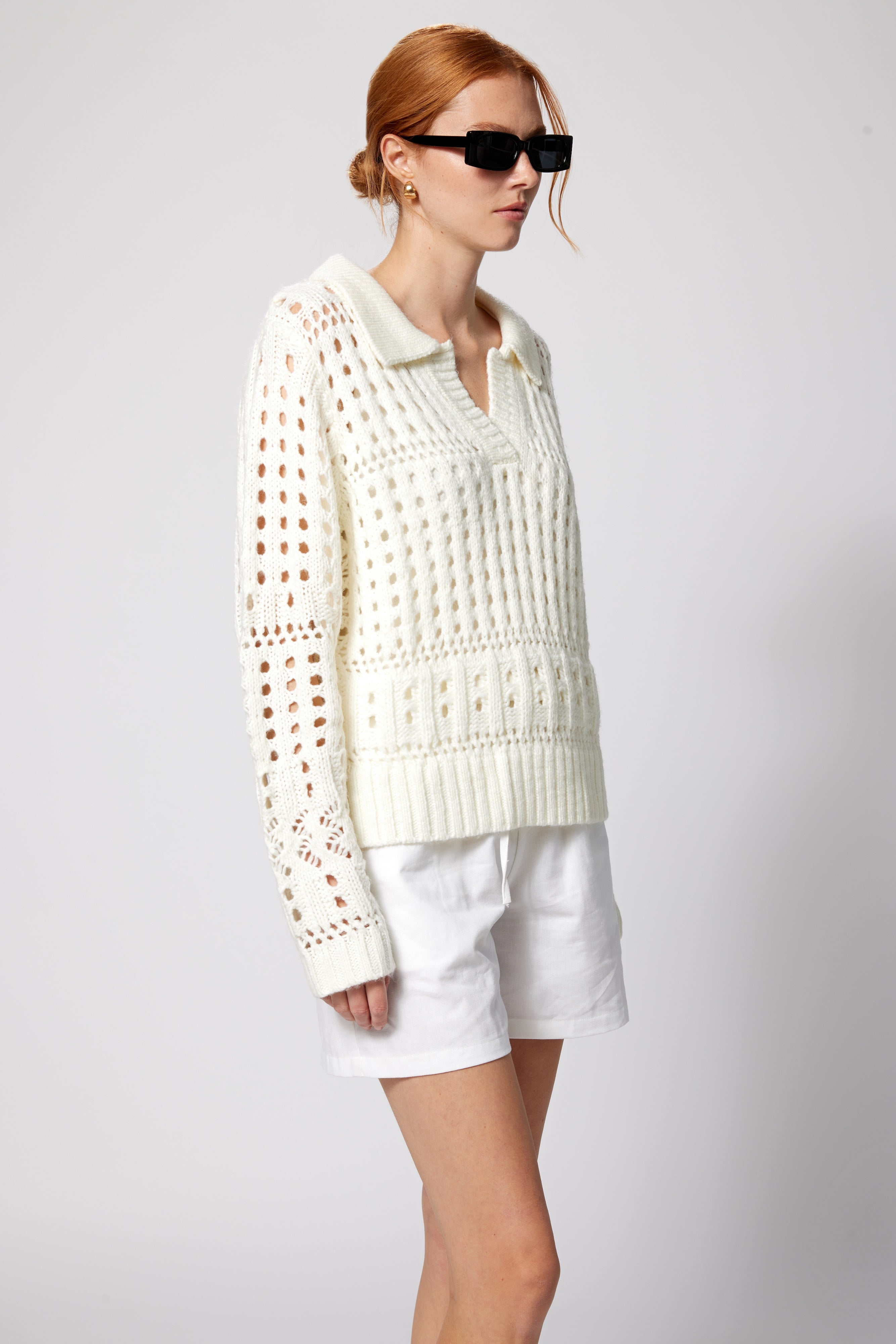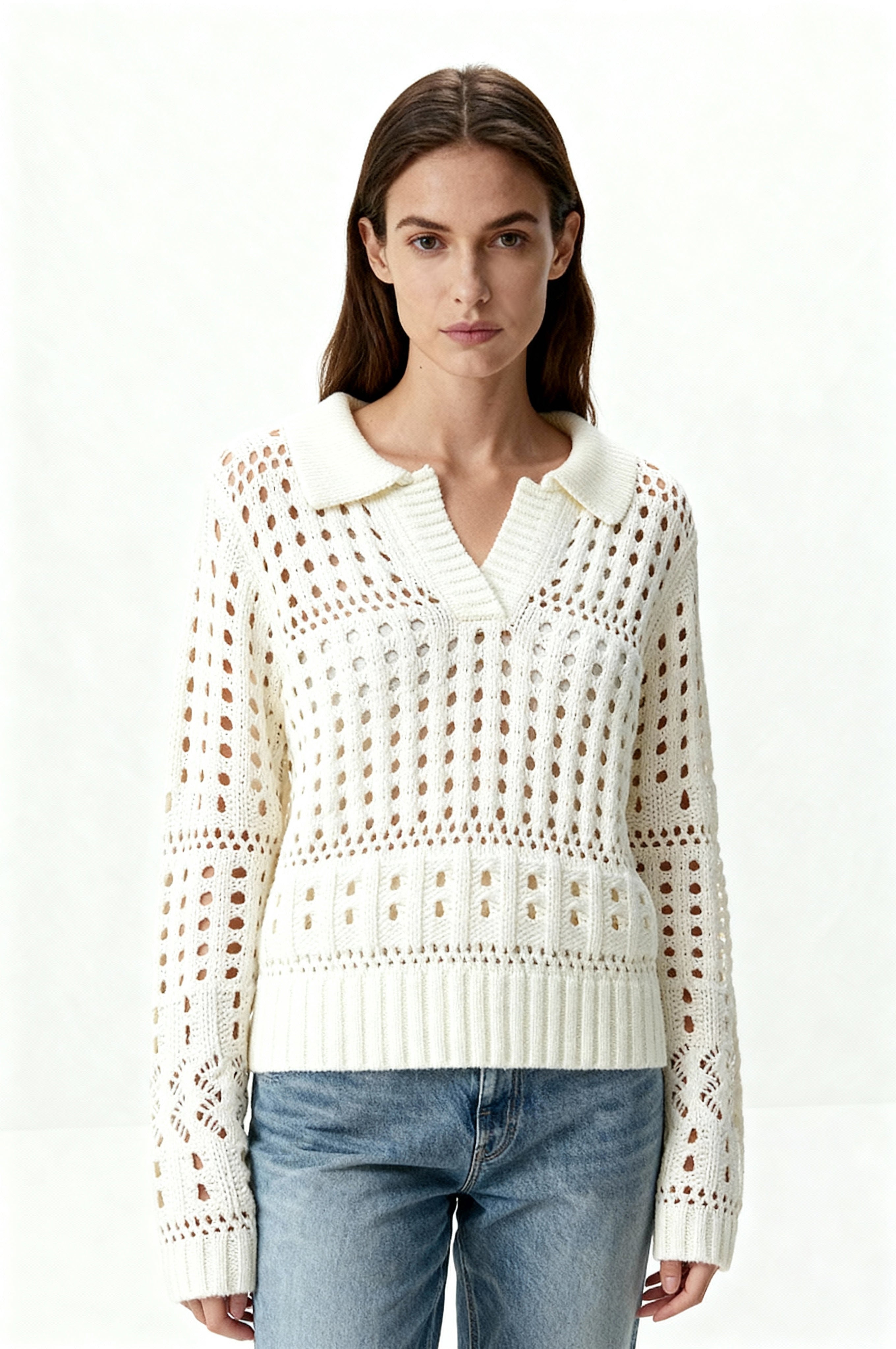 Soft and airy, this collared sweater is crafted in a plush open weave that mimics the look of fine crochet. Perfect for transitional weather, it balances cozy texture with breathable ease—making it the ideal layer for the beach, spring, or fall when you want comfort without heavy warmth