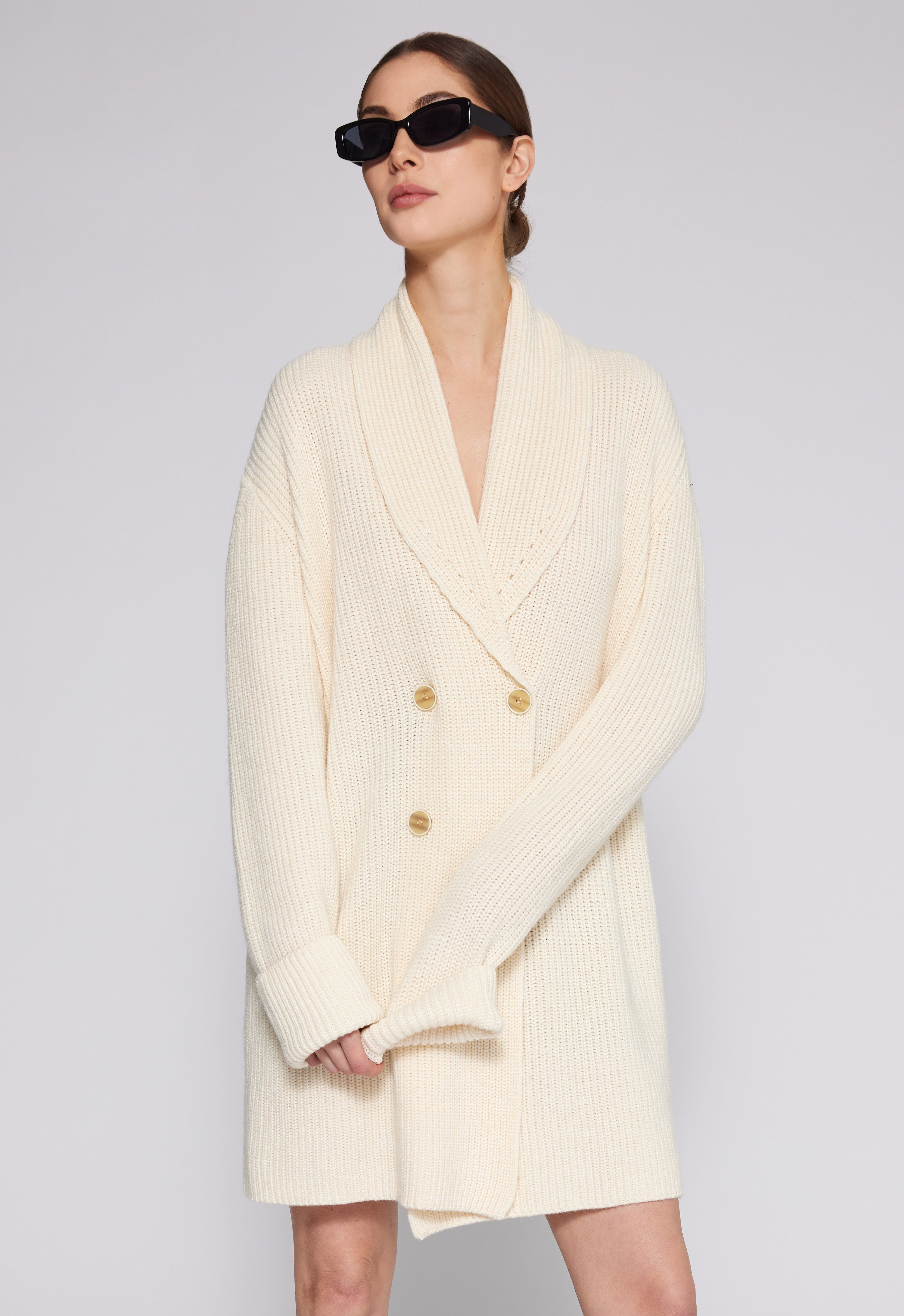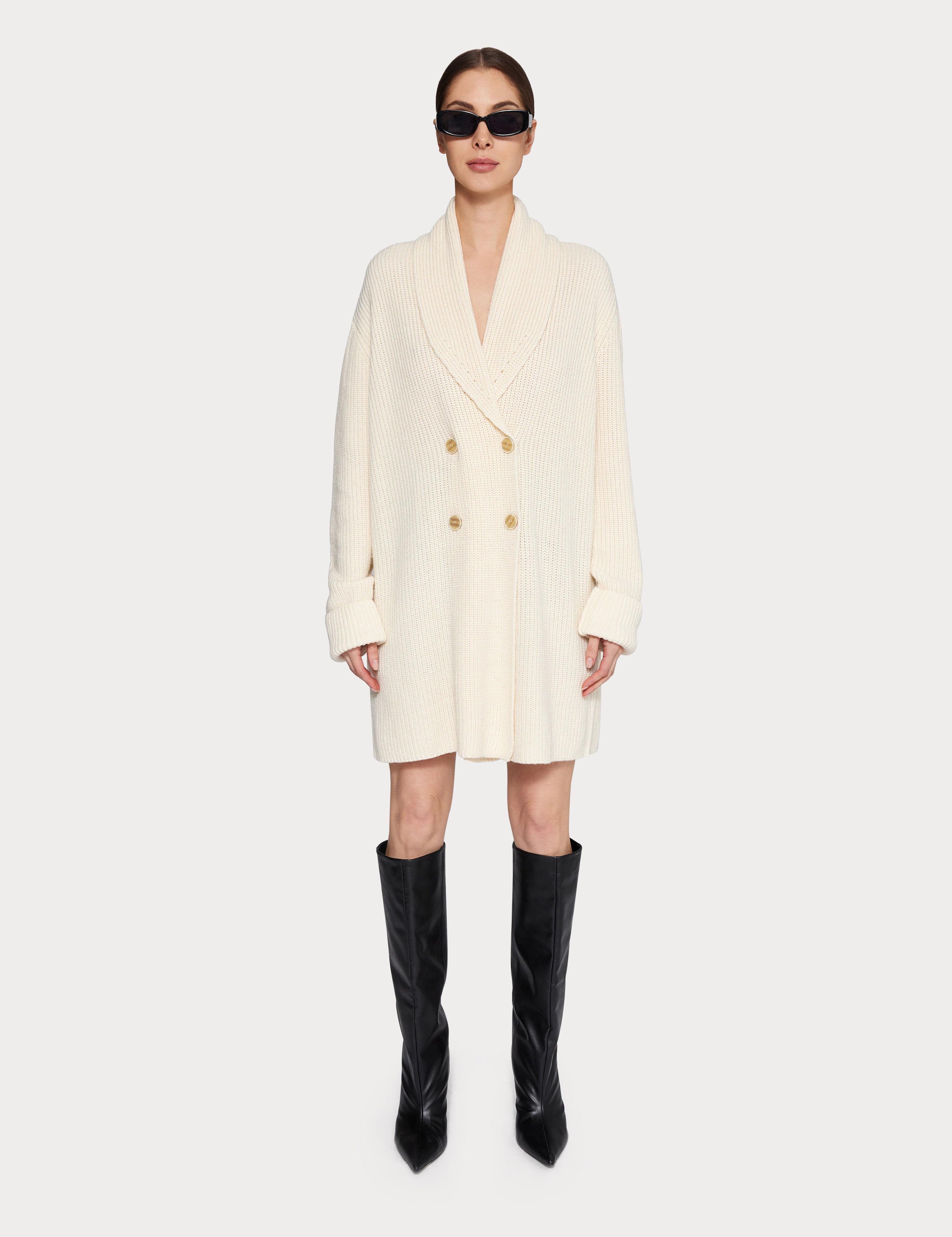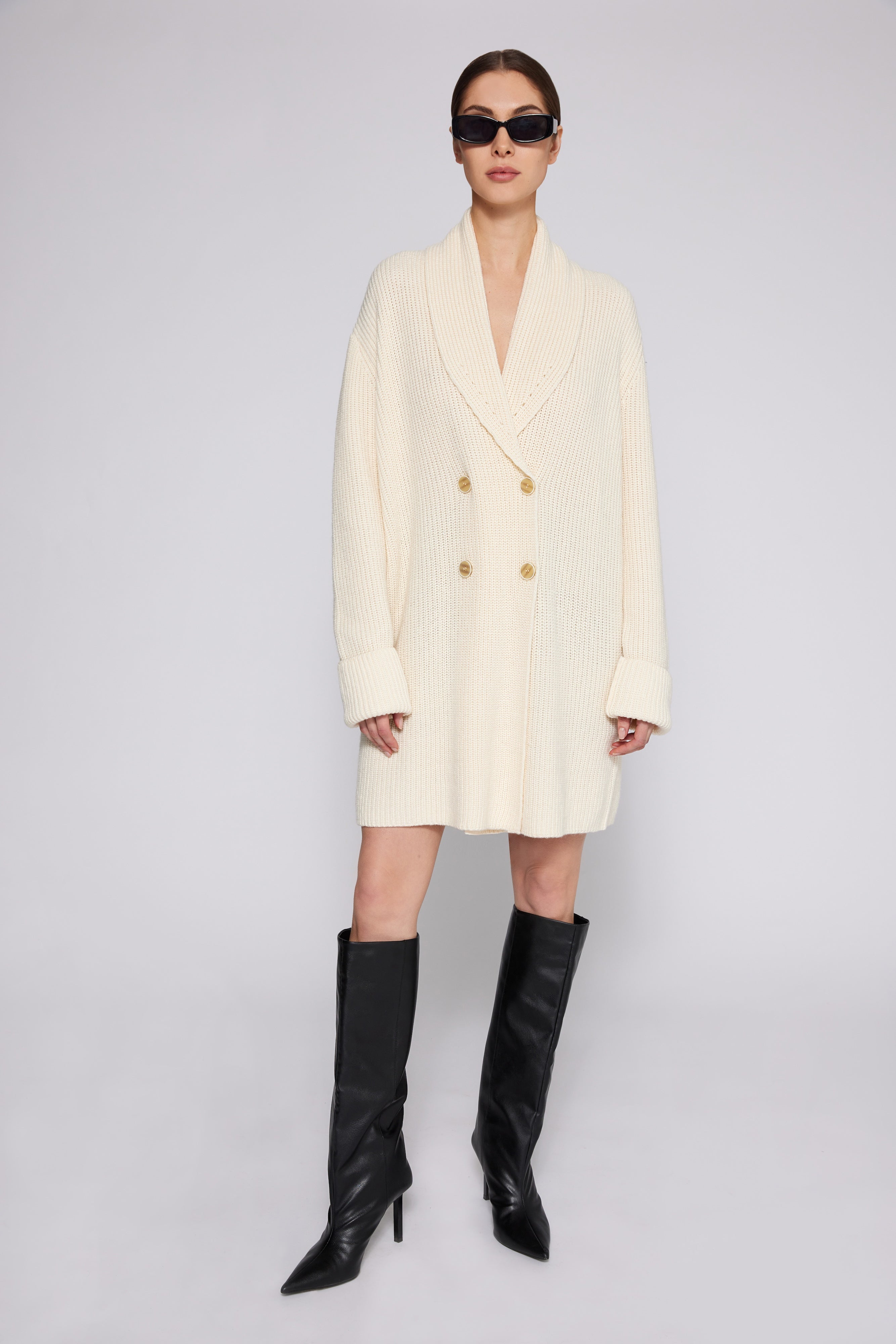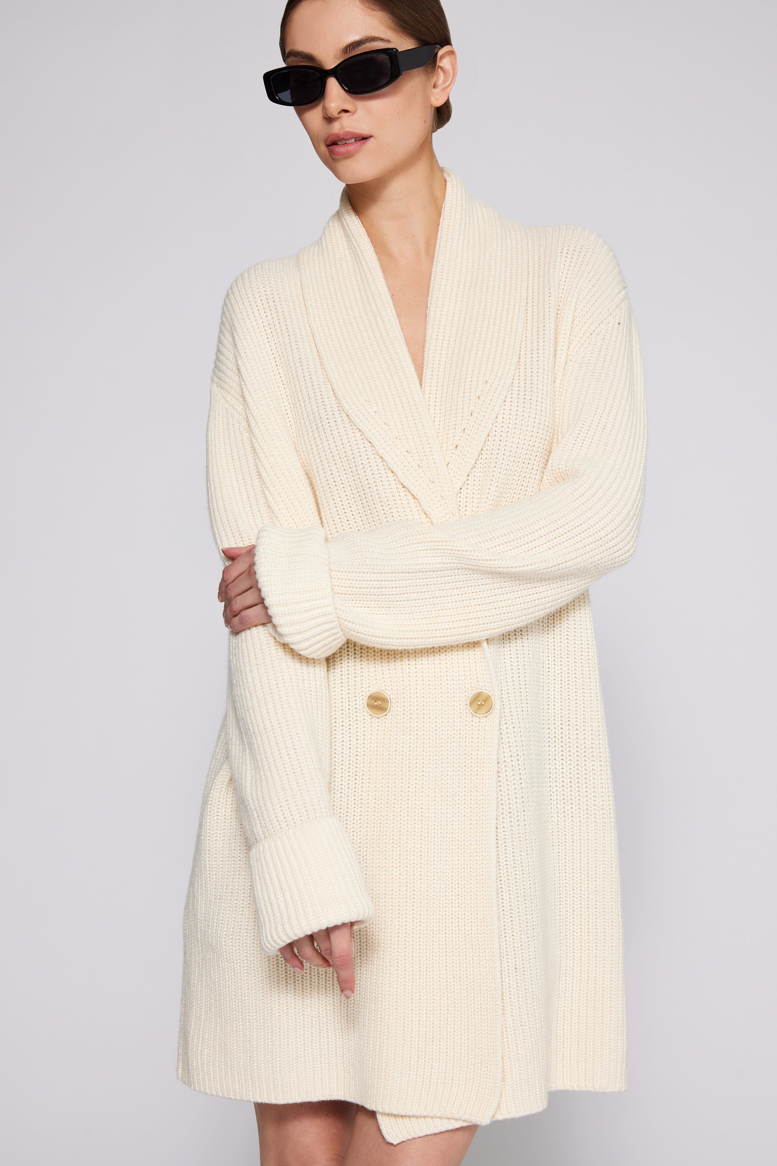 Embrace luxury with the Aspen Sweater, a cozy statement piece with endless styling possibilities. Designer Amanda Maria’s favourite, this sweater is crafted from an incredibly soft, lightweight cashmere blend, elevating cozy cottage chic to a new level. The relaxed yet chic fit is complemented by a sophisticated shawl collar with an intricate knit pattern. Featuring a double-breasted button detail, the Aspen Sweater effortlessly transitions from casual to dressed-up. Its longer length offers versatile styling options, whether worn as a sweater dress with mini skirts or layered with your favourite pants for added warmth.