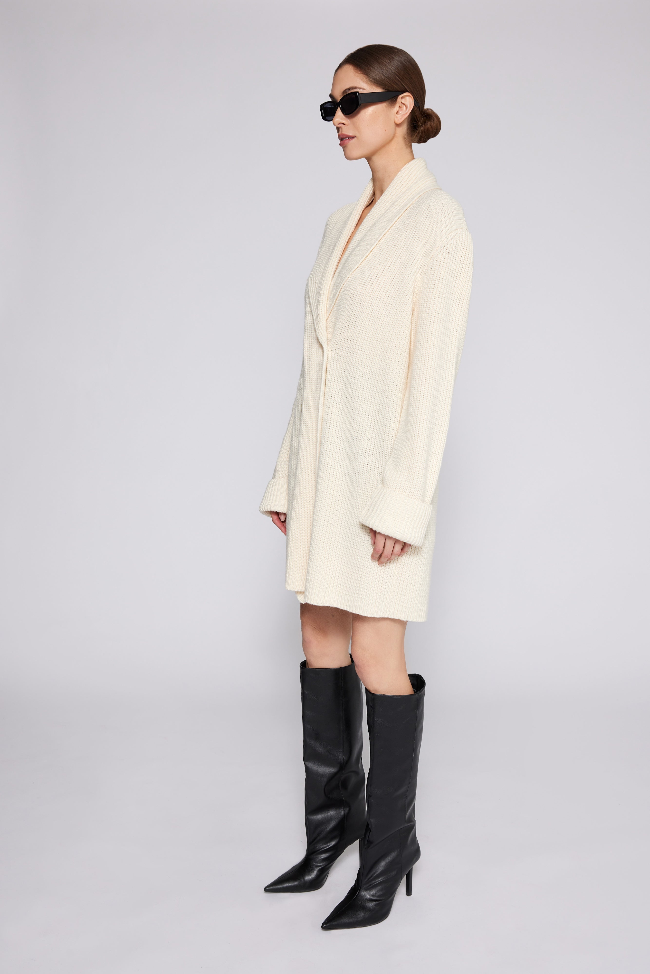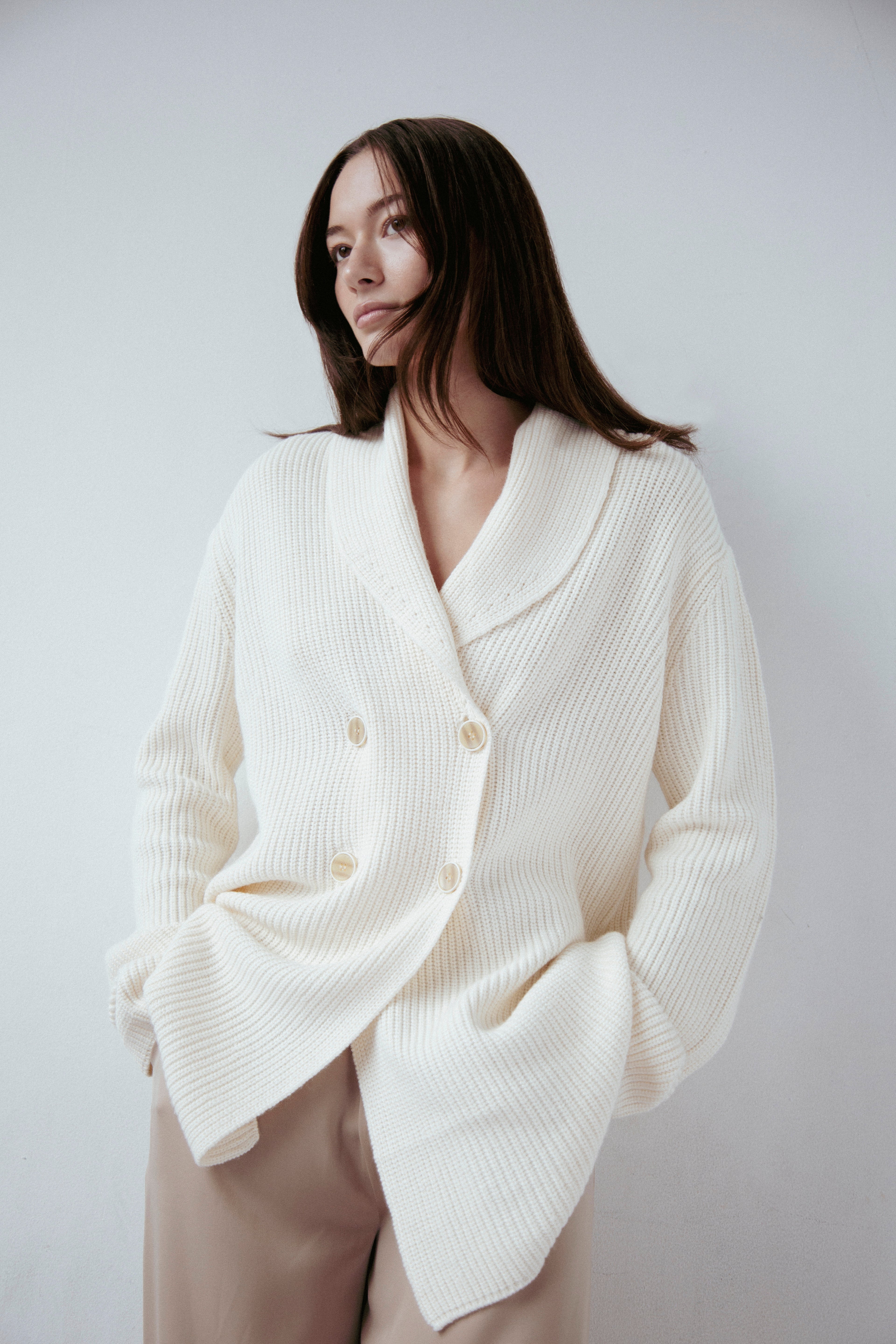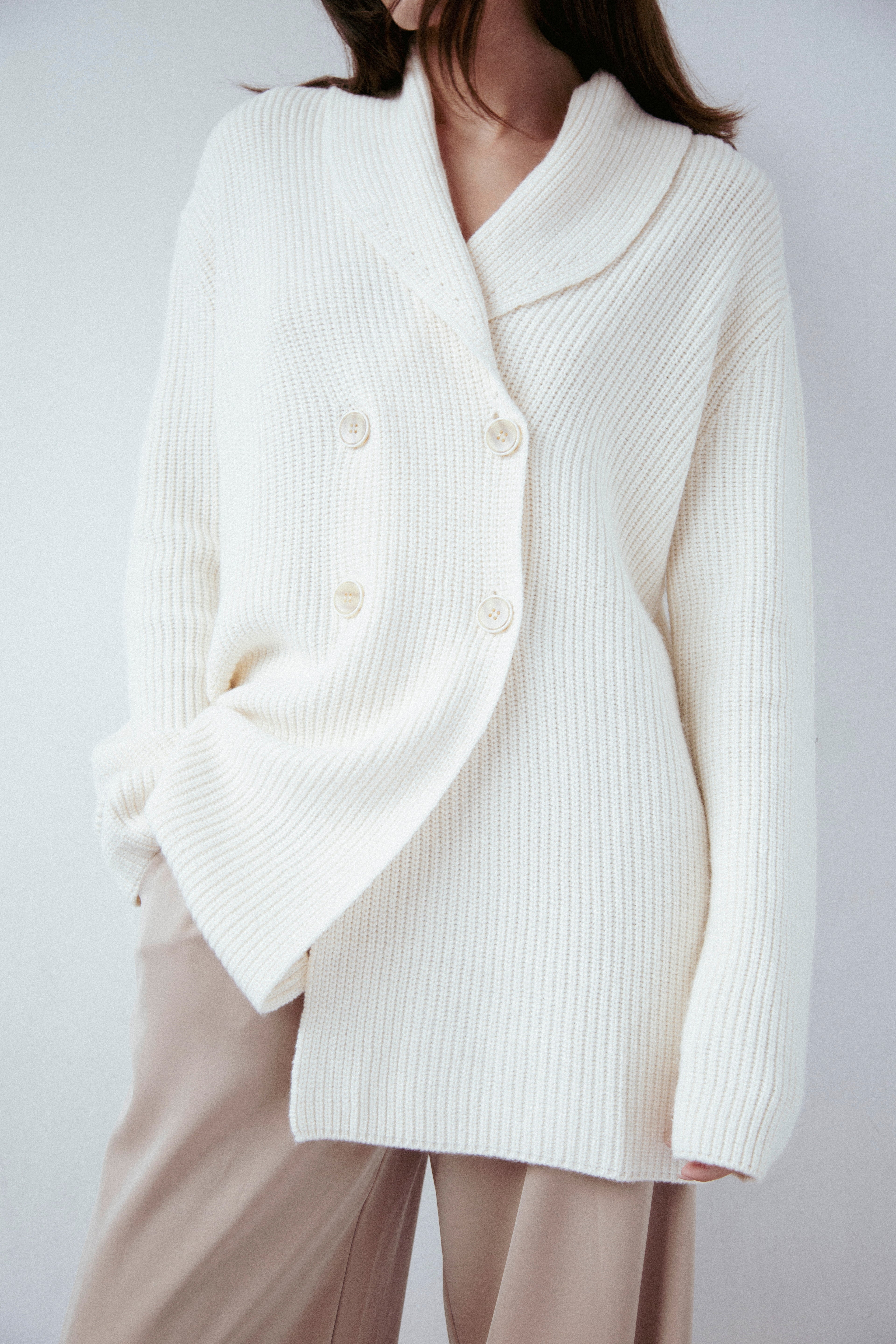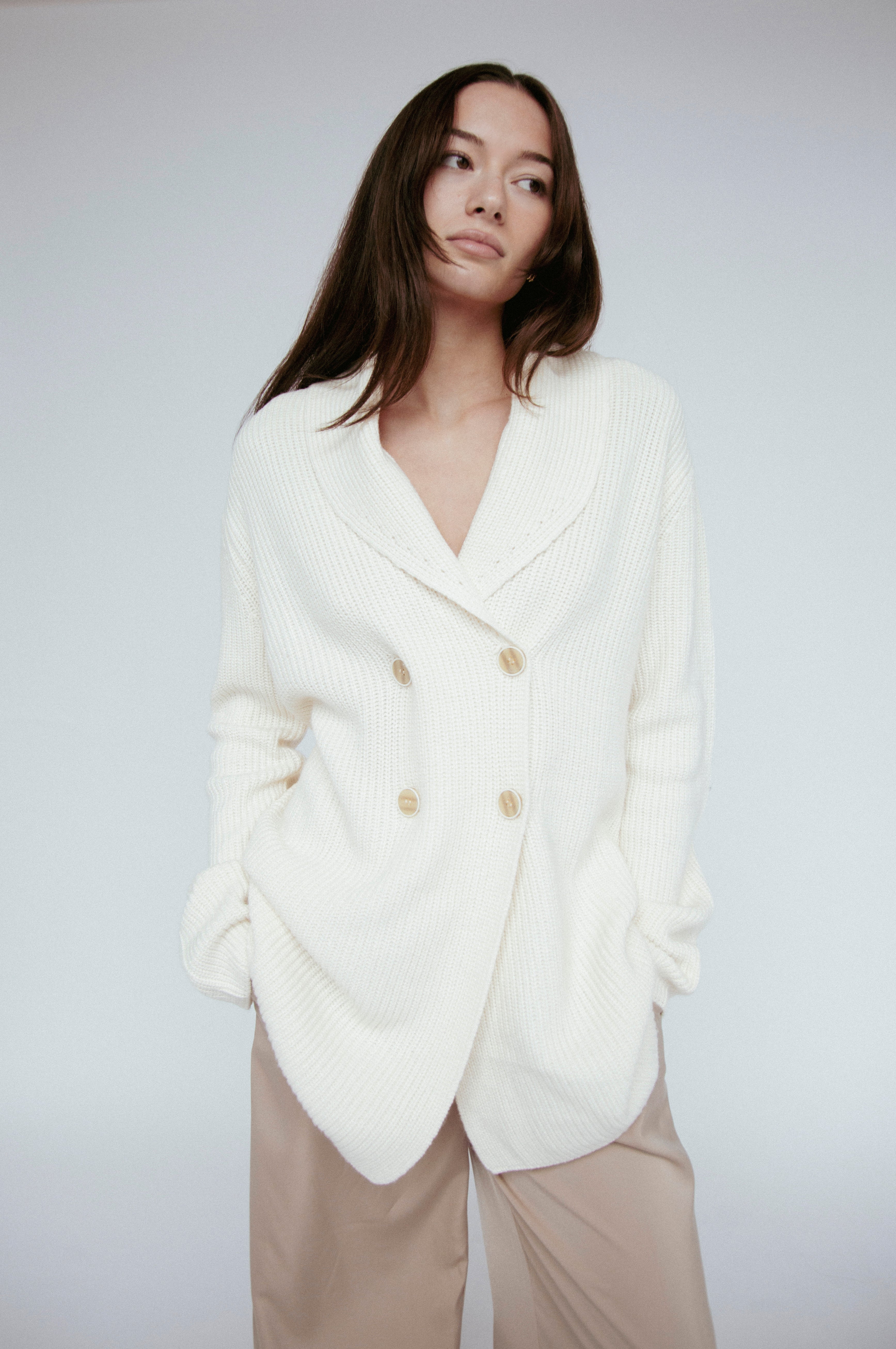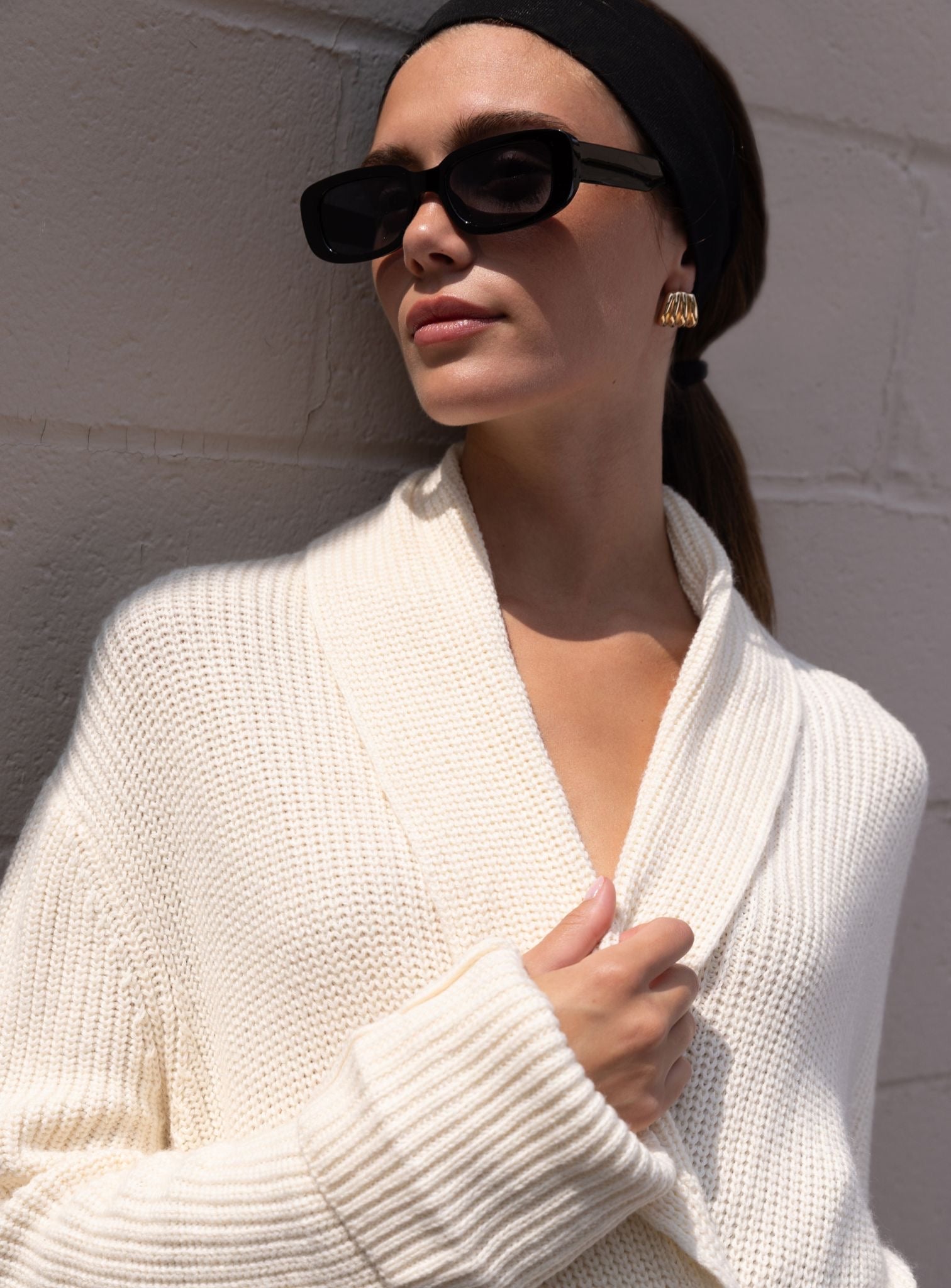 Embrace luxury with the Aspen Sweater, a cozy statement piece with endless styling possibilities. Designer Amanda Maria’s favourite, this sweater is crafted from an incredibly soft, lightweight cashmere blend, elevating cozy cottage chic to a new level. The relaxed yet chic fit is complemented by a sophisticated shawl collar with an intricate knit pattern. Featuring a double-breasted button detail, the Aspen Sweater effortlessly transitions from casual to dressed-up. Its longer length offers versatile styling options, whether worn as a sweater dress with mini skirts or layered with your favourite pants for added warmth.