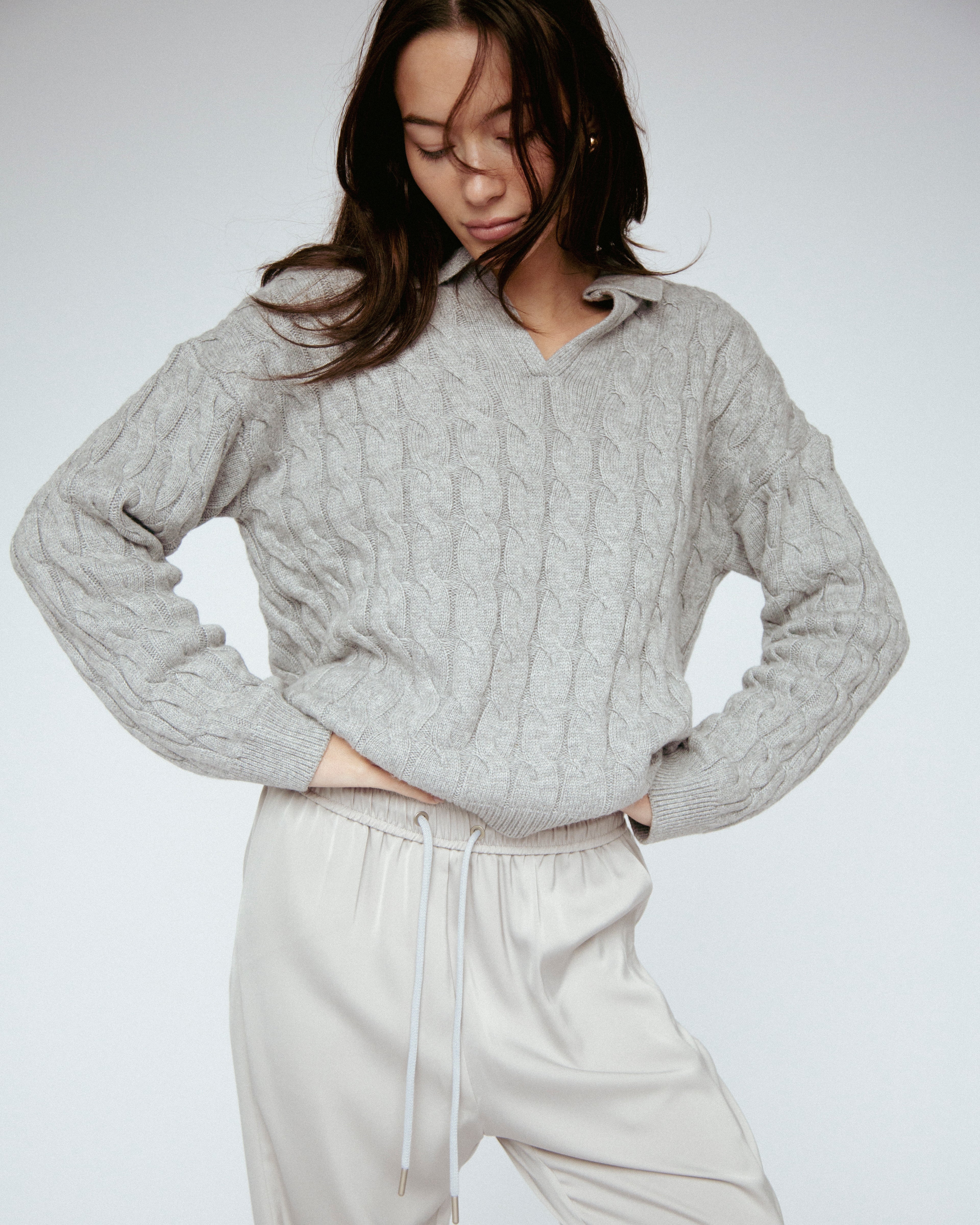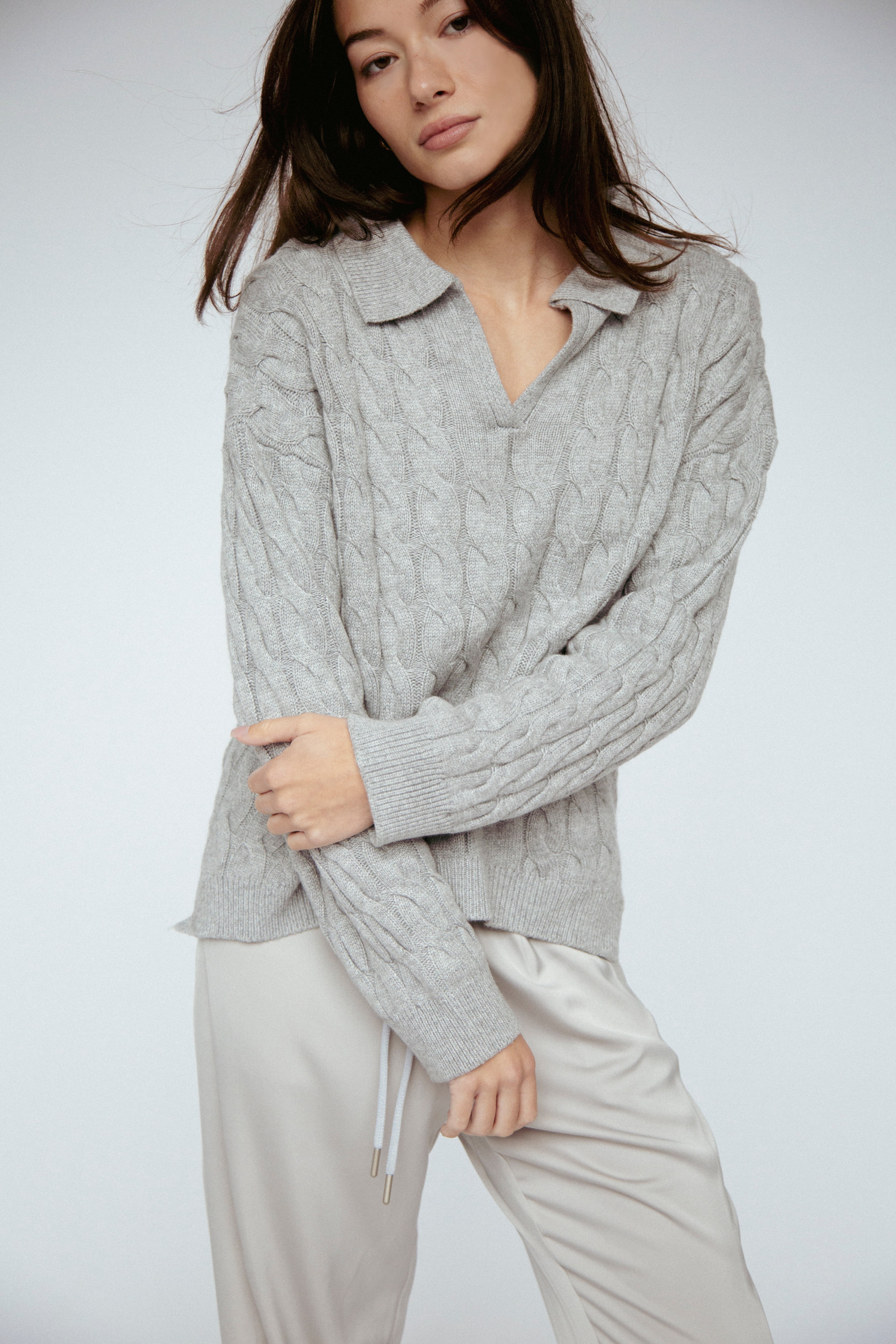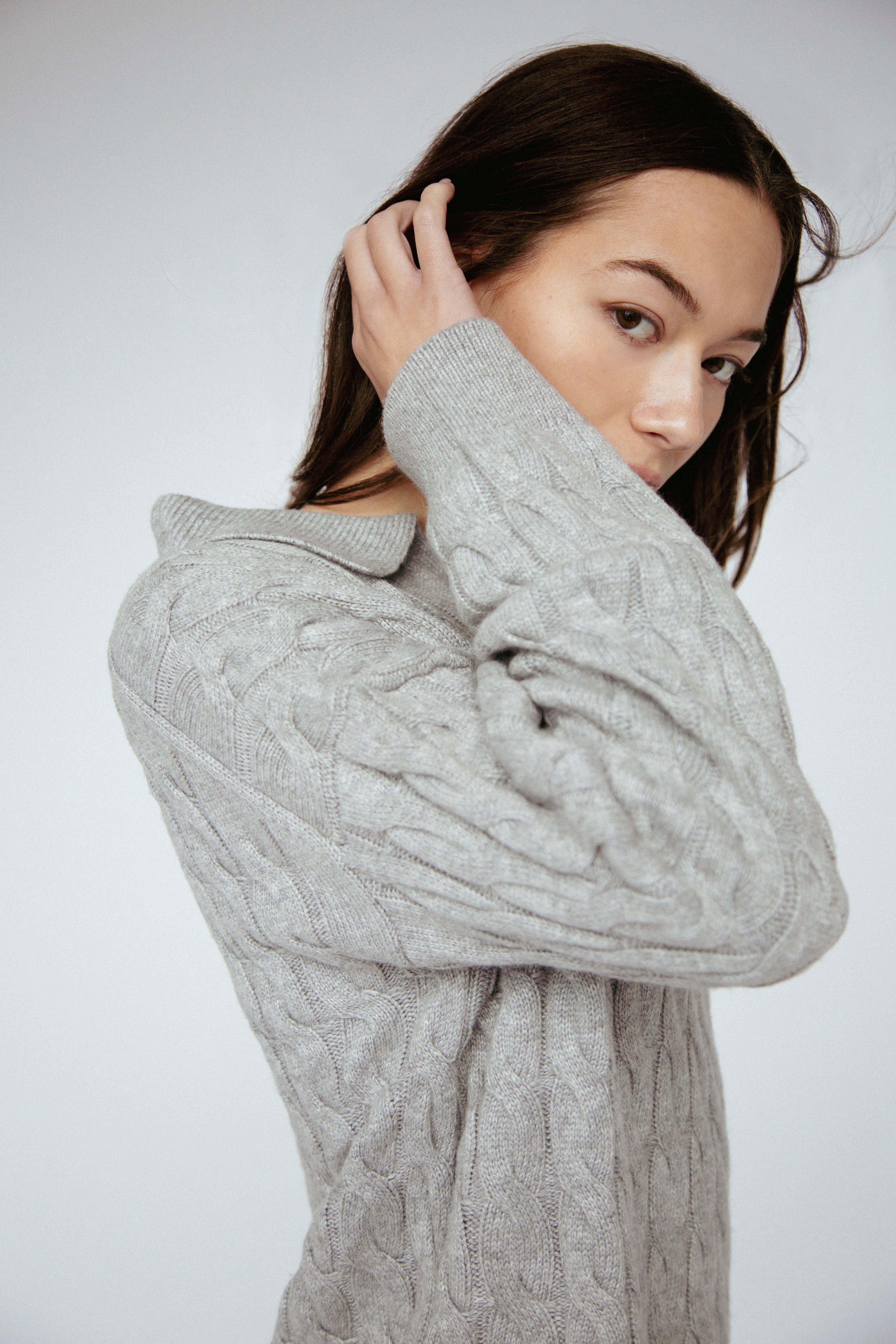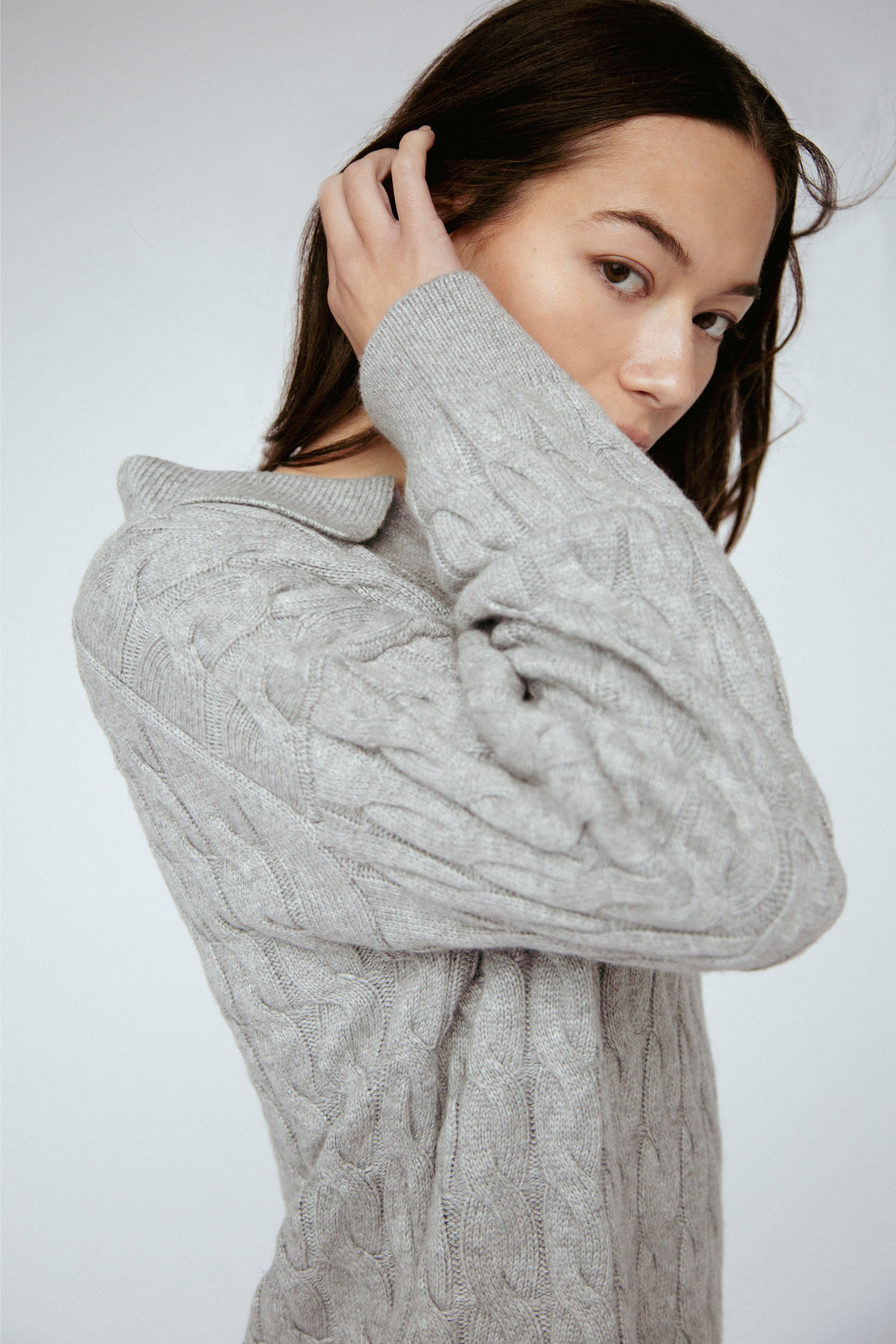Elevate your wardrobe with our cozy chic cashmere blend polo sweater. Crafted from premium cashmere blend yarn, this incredibly soft sweater features a sophisticated textured braided pattern and a curved hem for a touch of luxury. The back is slightly longer than the front, with side slits adding a modern twist. Ribbed sleeve hems, collar, and bodice finish the look with a polished touch. Lightweight yet warm, this versatile knit transitions seamlessly through seasons. Style it casually for lounge days or dress it up for cooler evenings out.