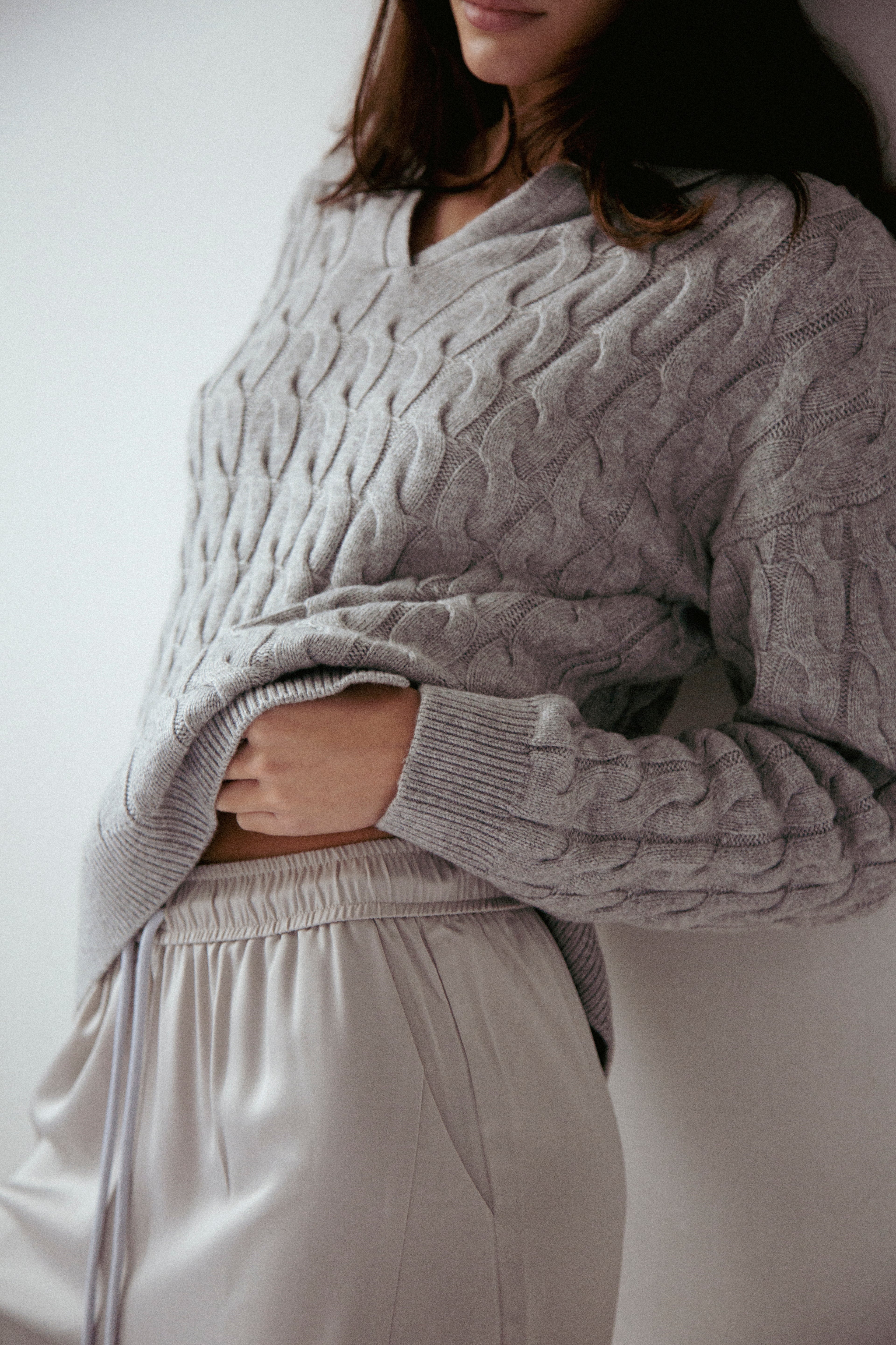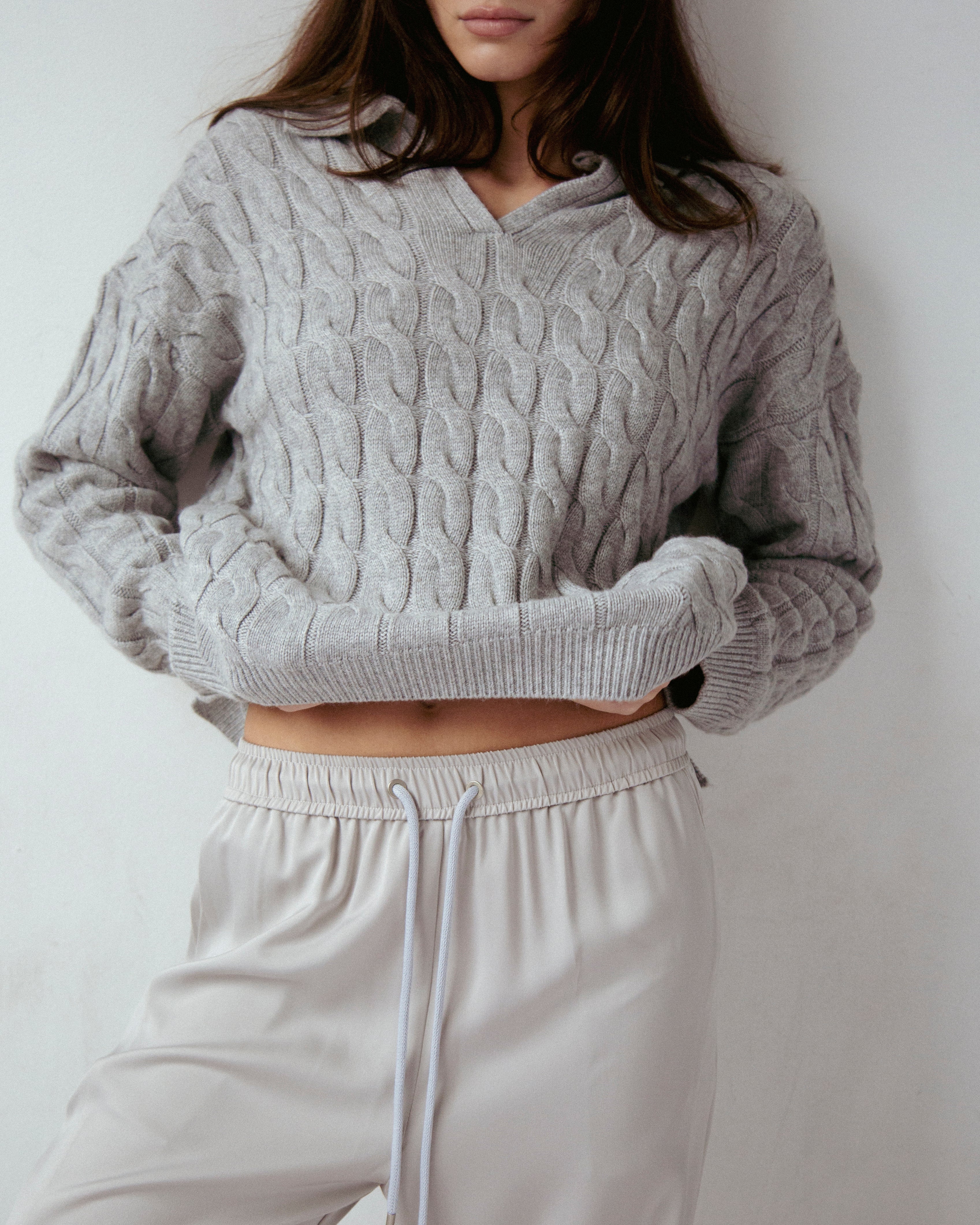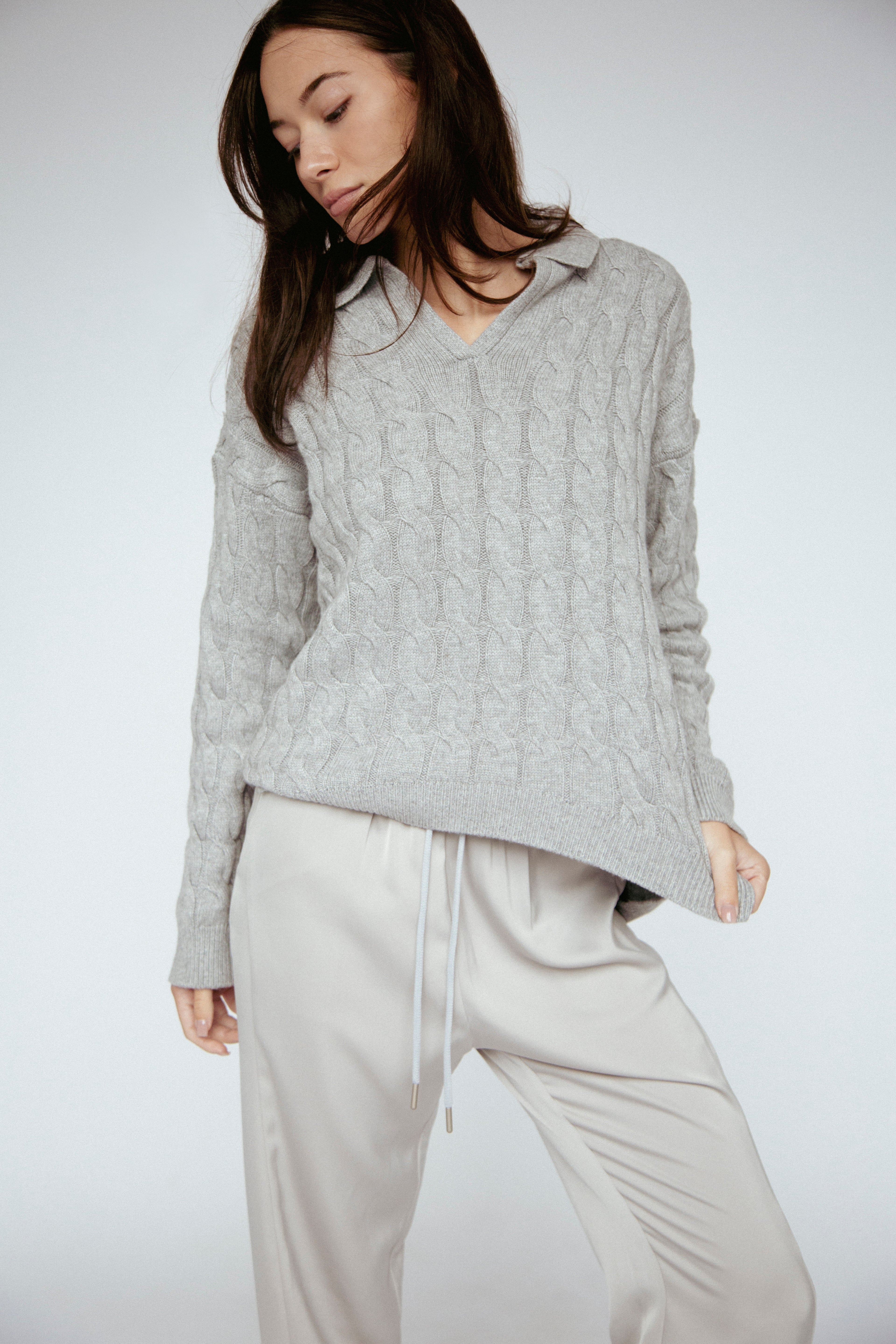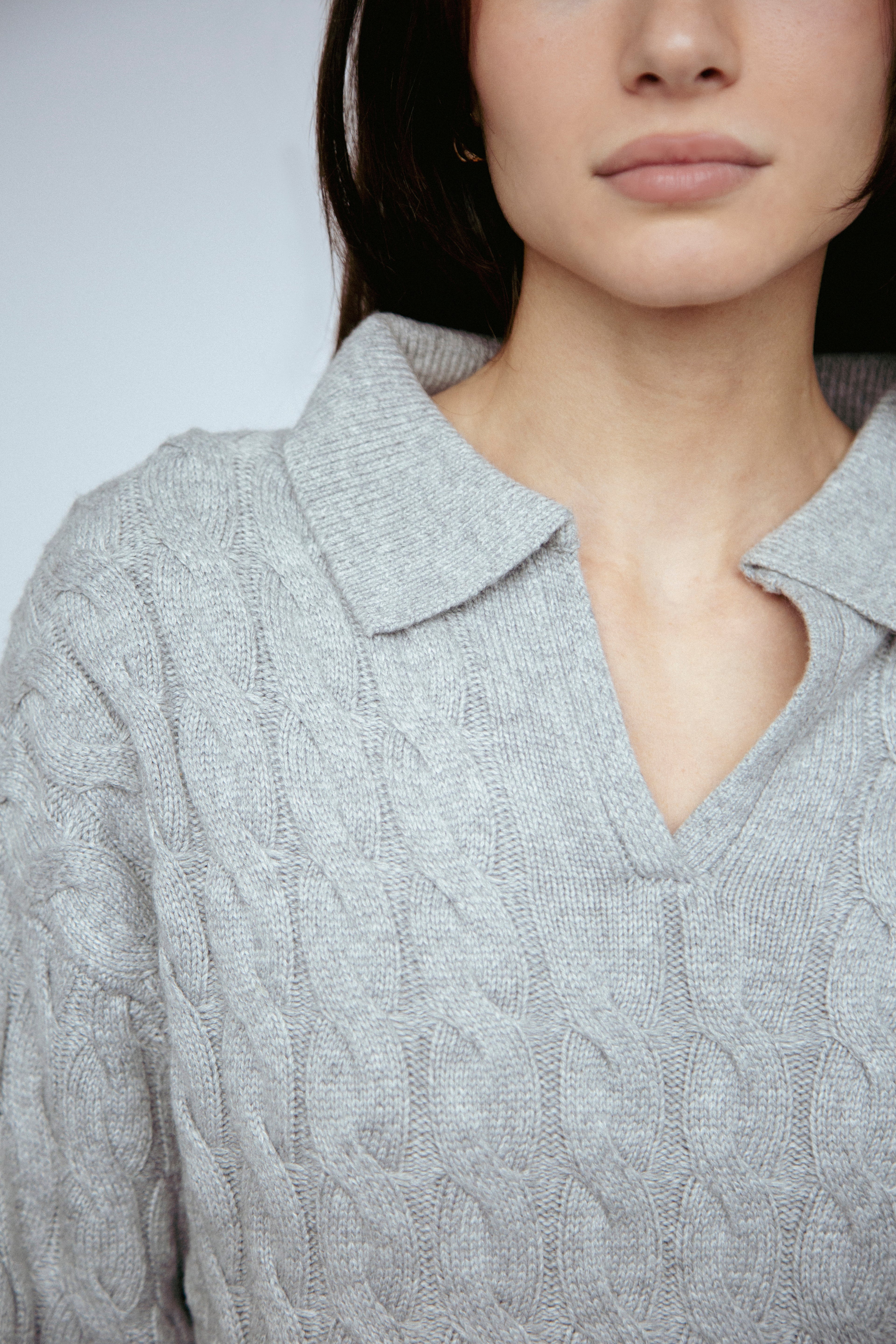 Elevate your wardrobe with our cozy chic cashmere blend polo sweater. Crafted from premium cashmere blend yarn, this incredibly soft sweater features a sophisticated textured braided pattern and a curved hem for a touch of luxury. The back is slightly longer than the front, with side slits adding a modern twist. Ribbed sleeve hems, collar, and bodice finish the look with a polished touch. Lightweight yet warm, this versatile knit transitions seamlessly through seasons. Style it casually for lounge days or dress it up for cooler evenings out.
