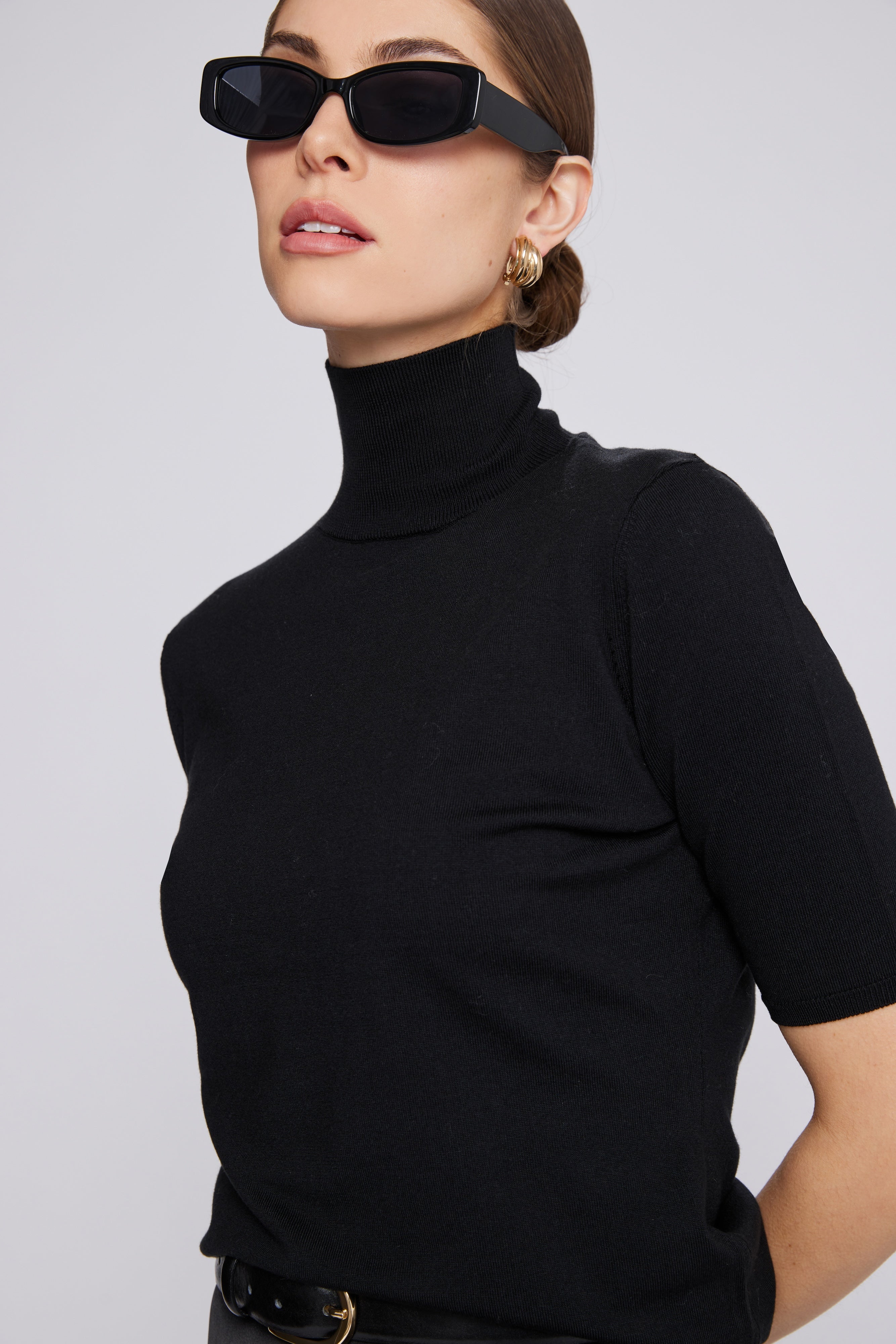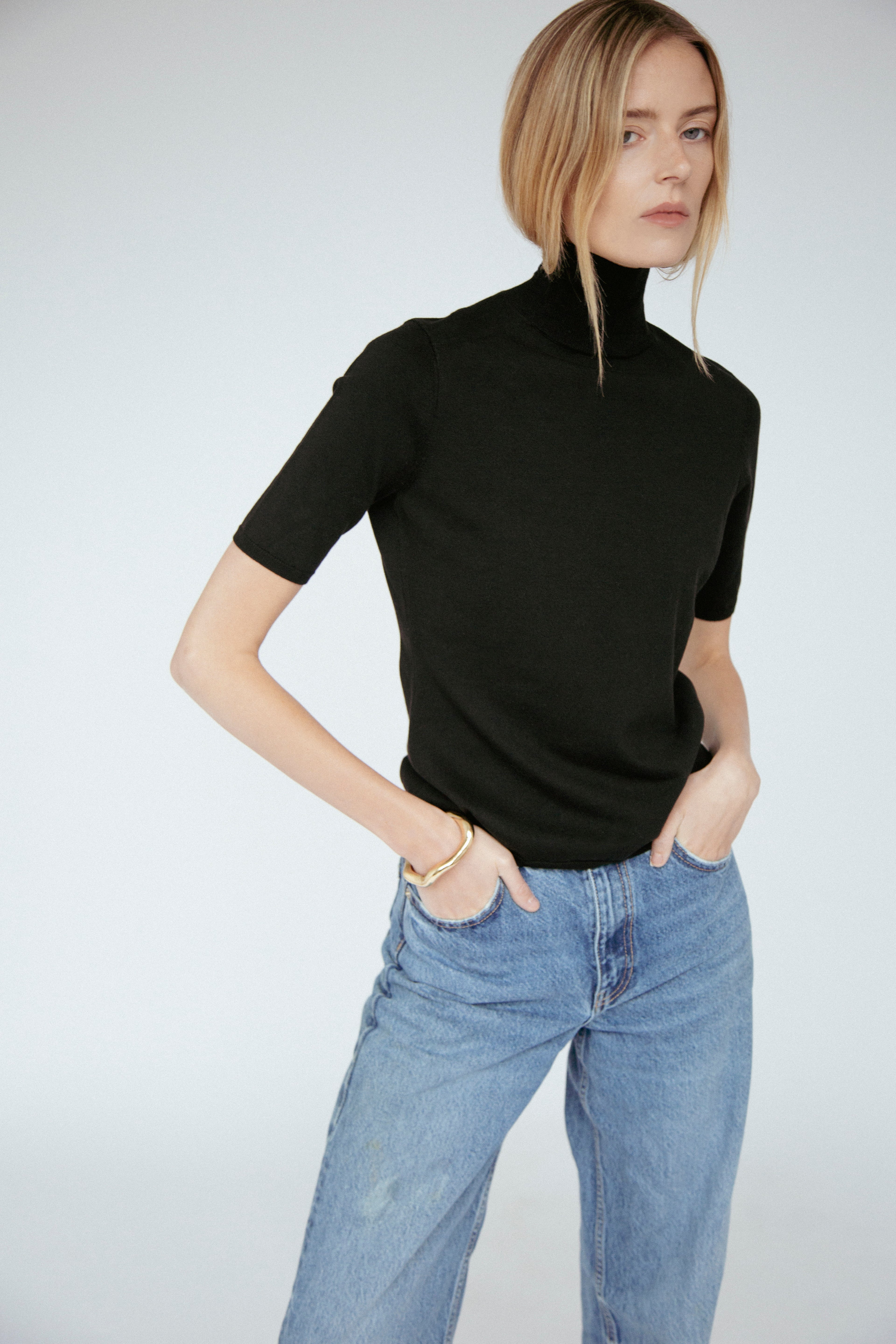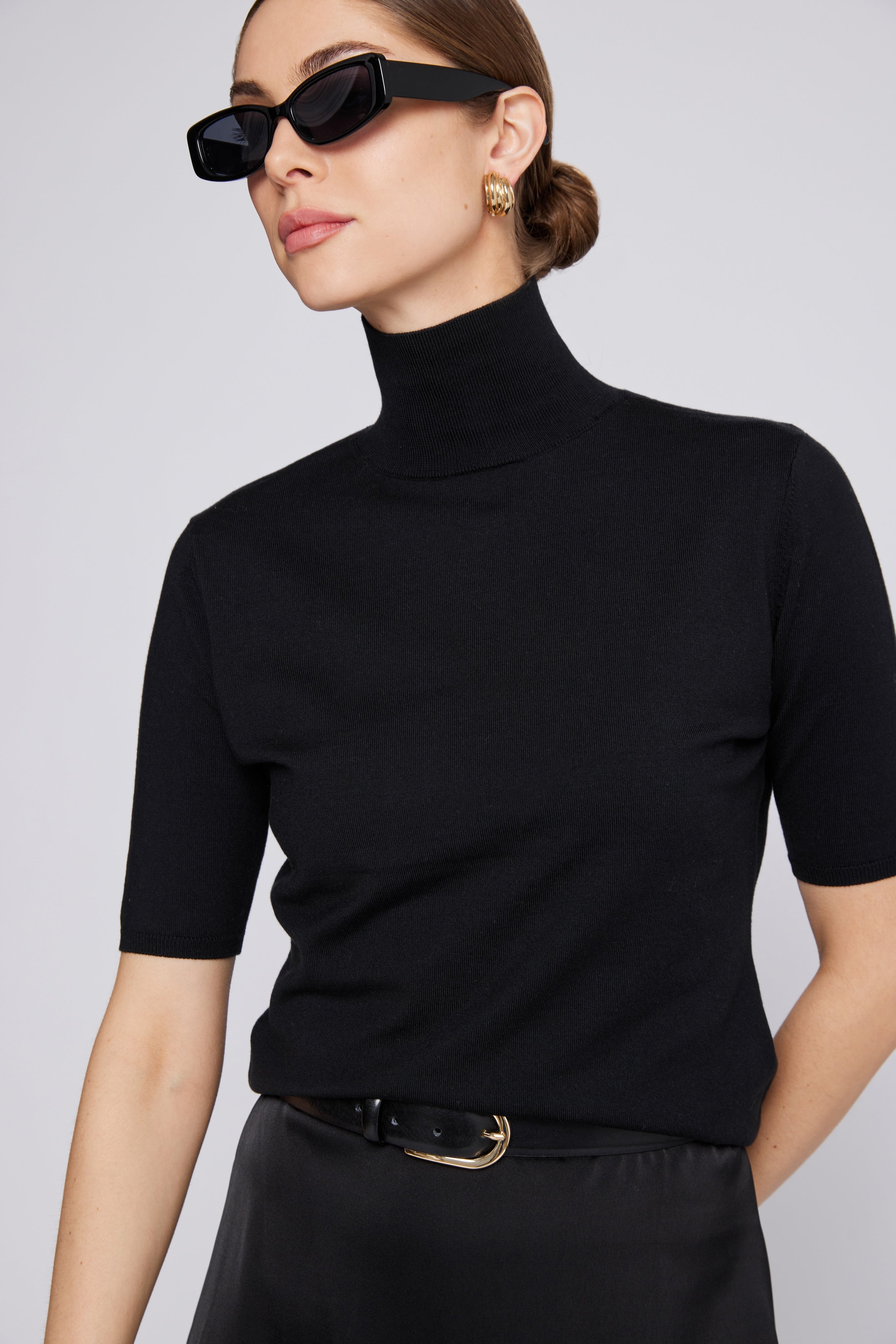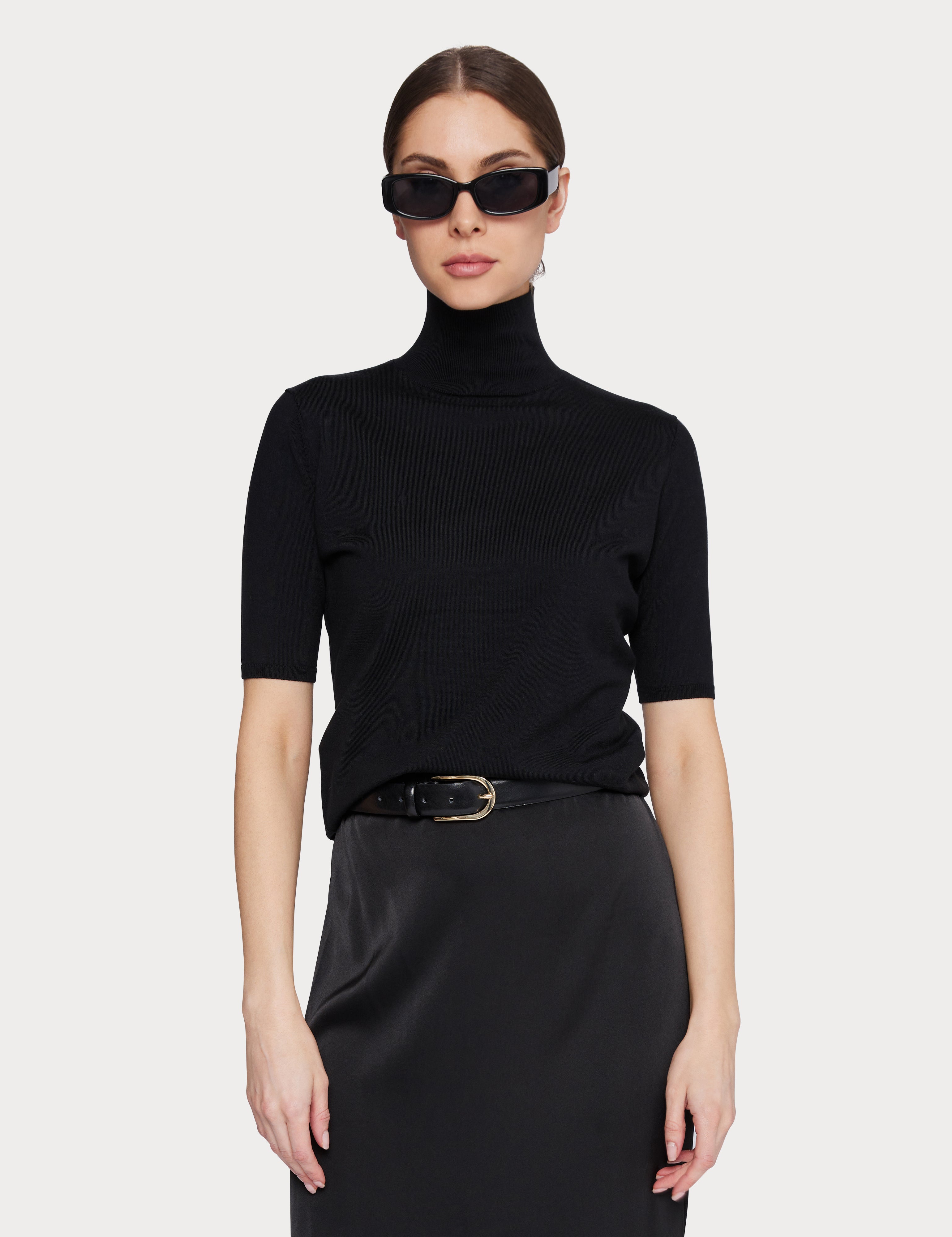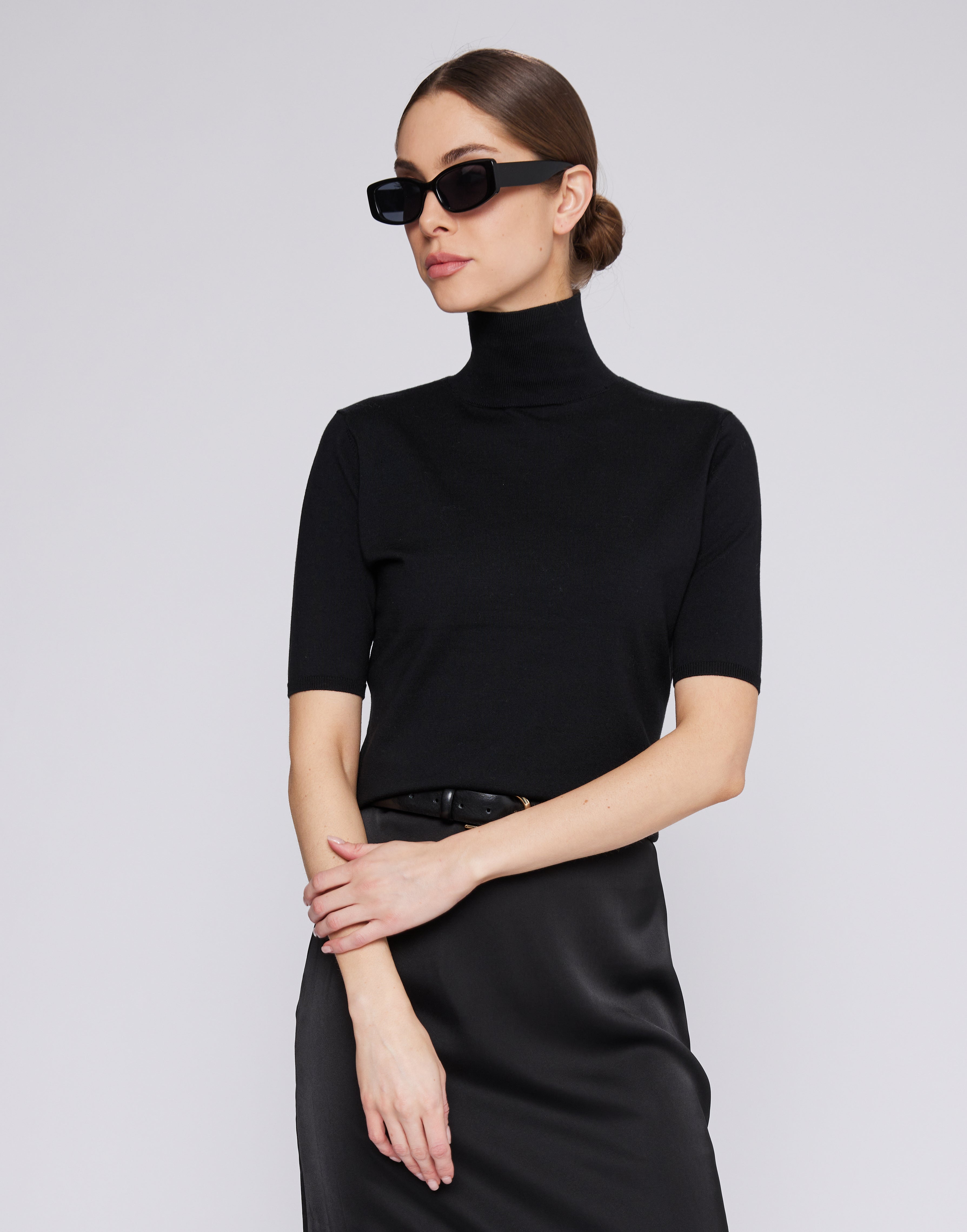 Turtleneck, 3/4 sleeves, straight bodice fit, stretch.