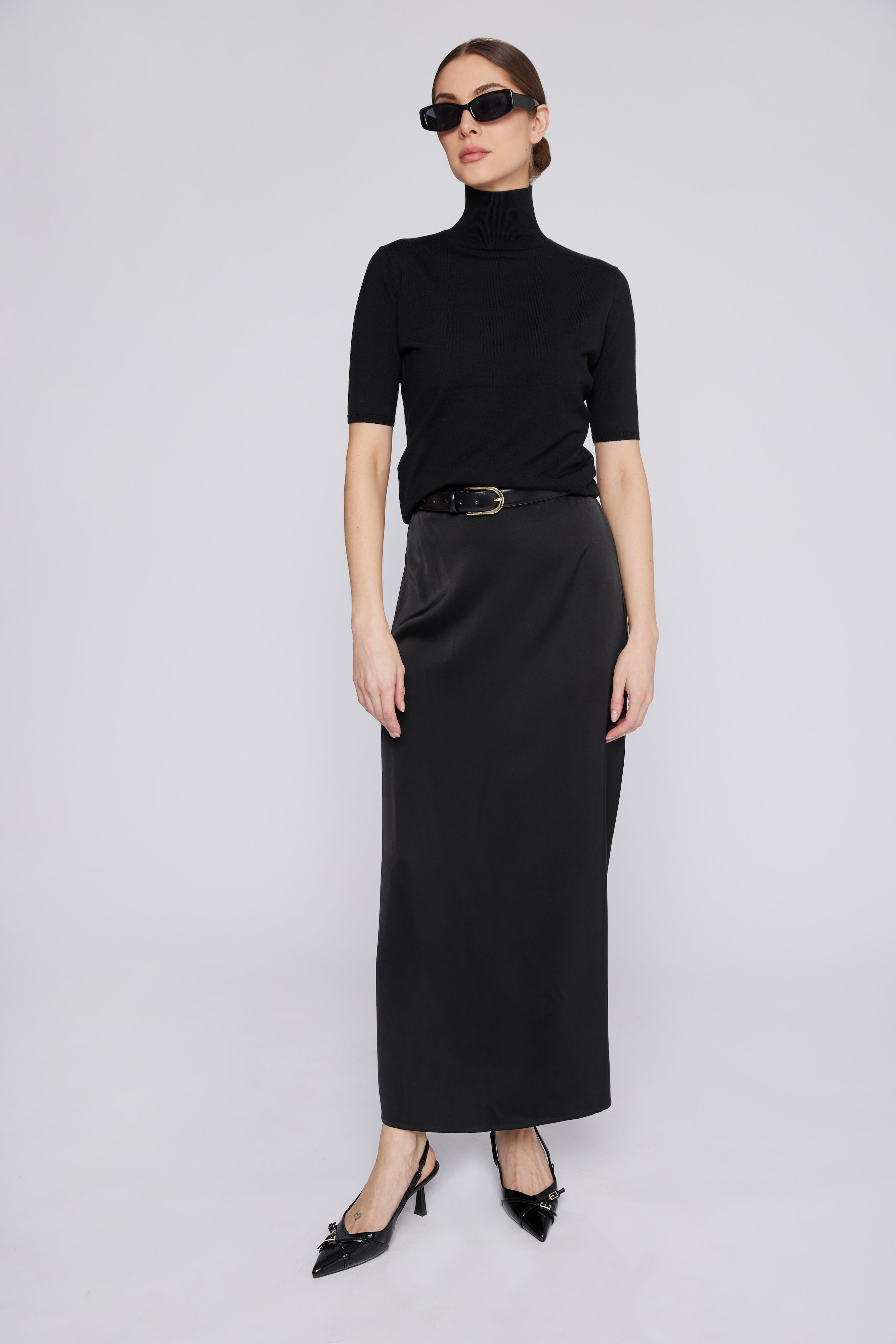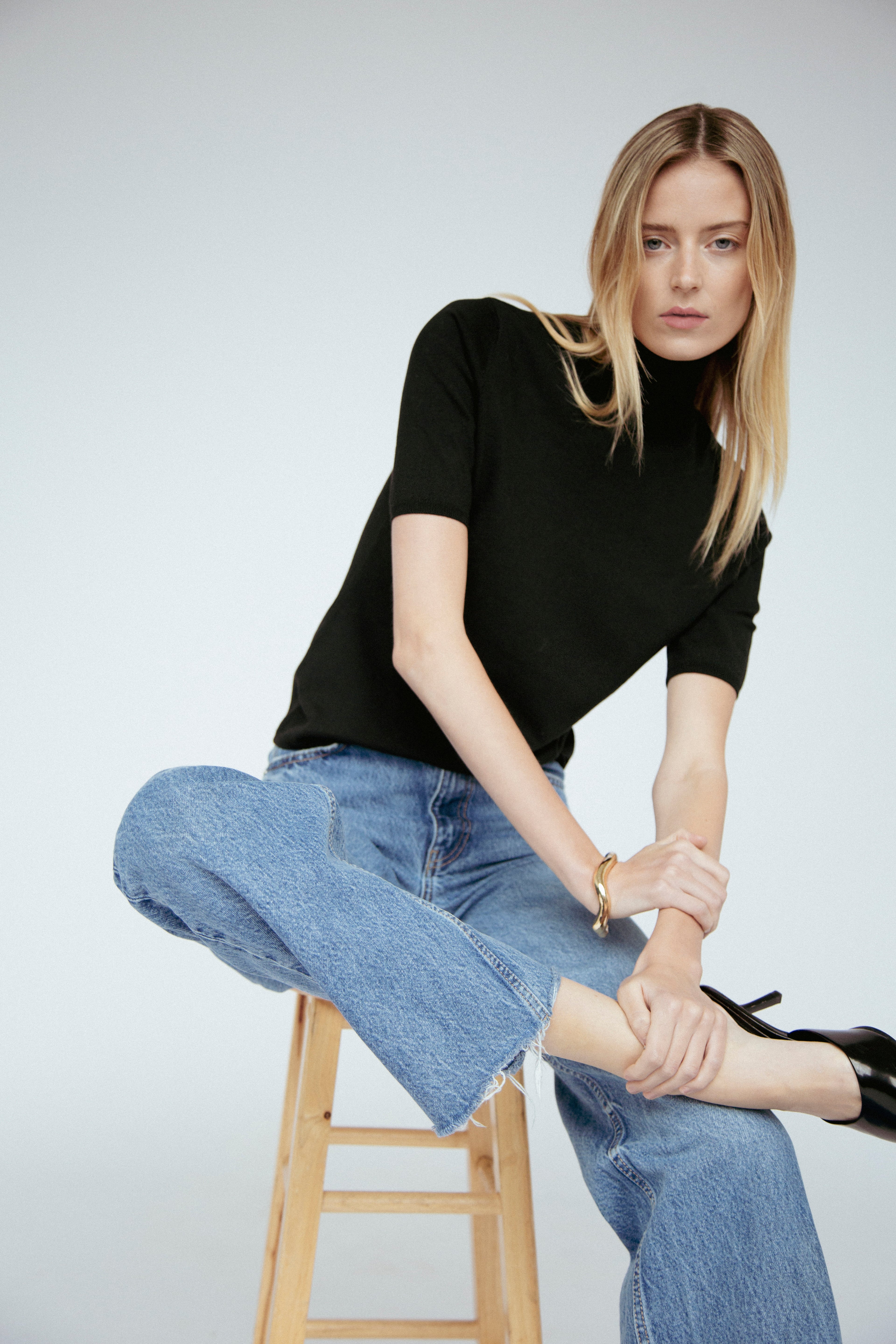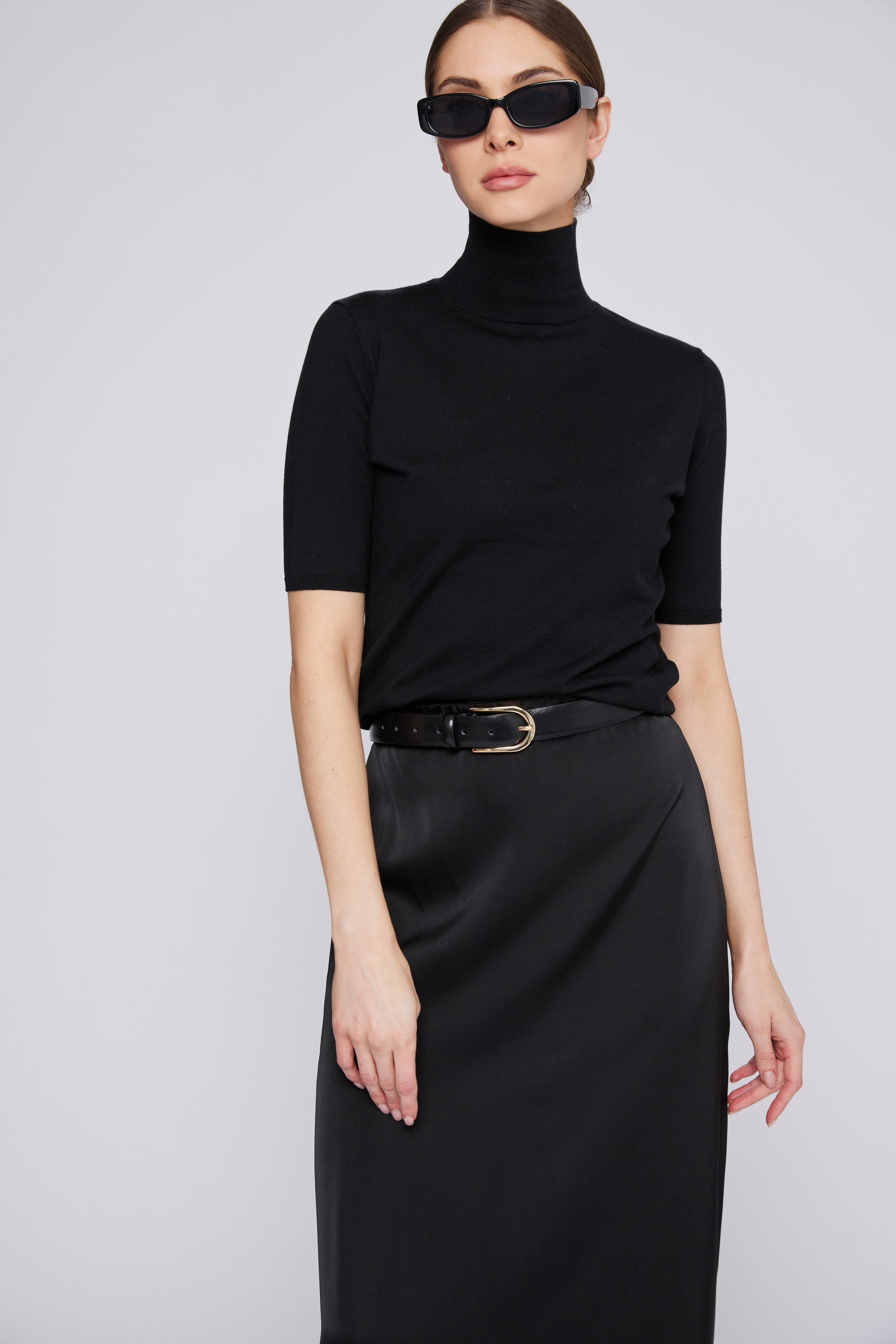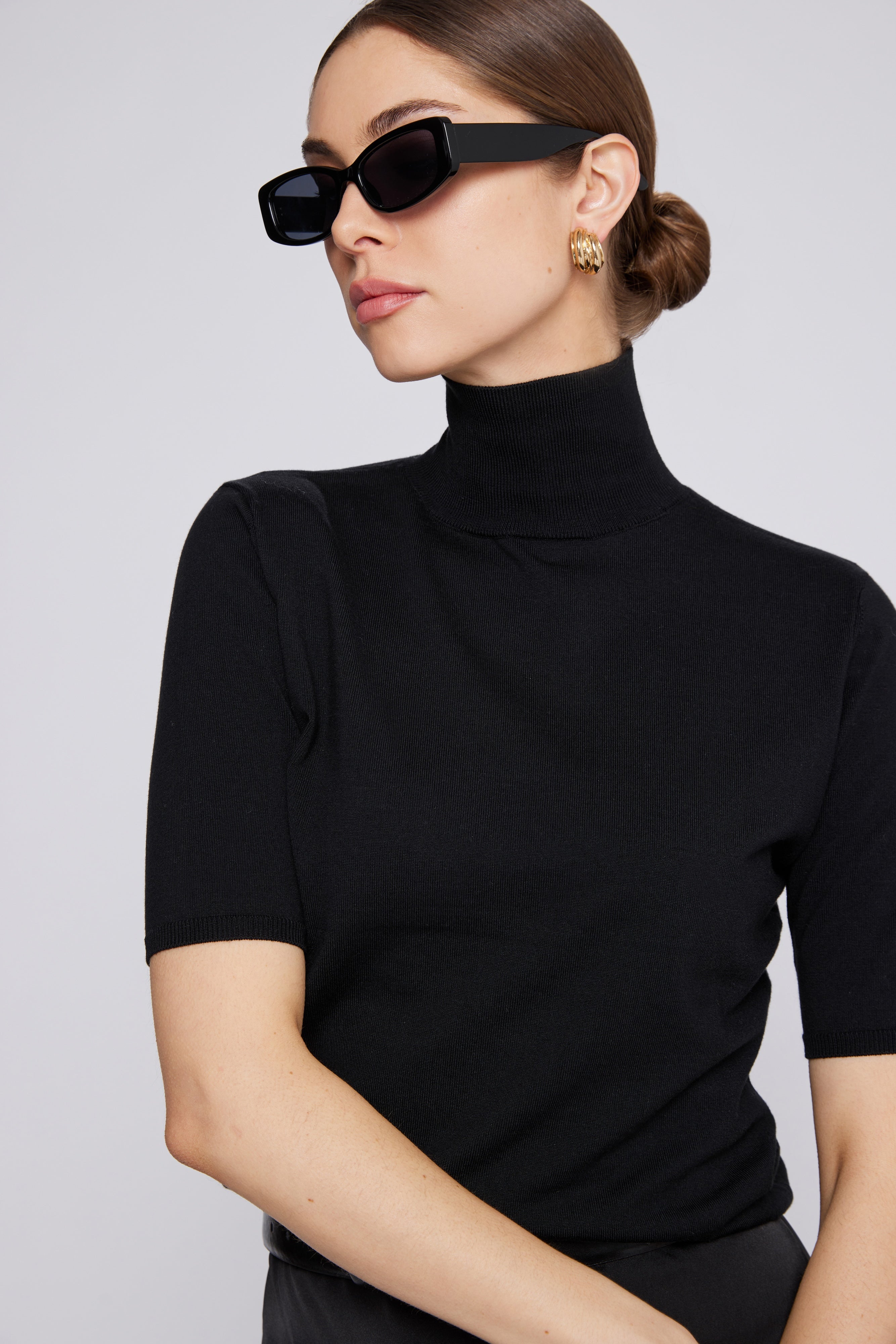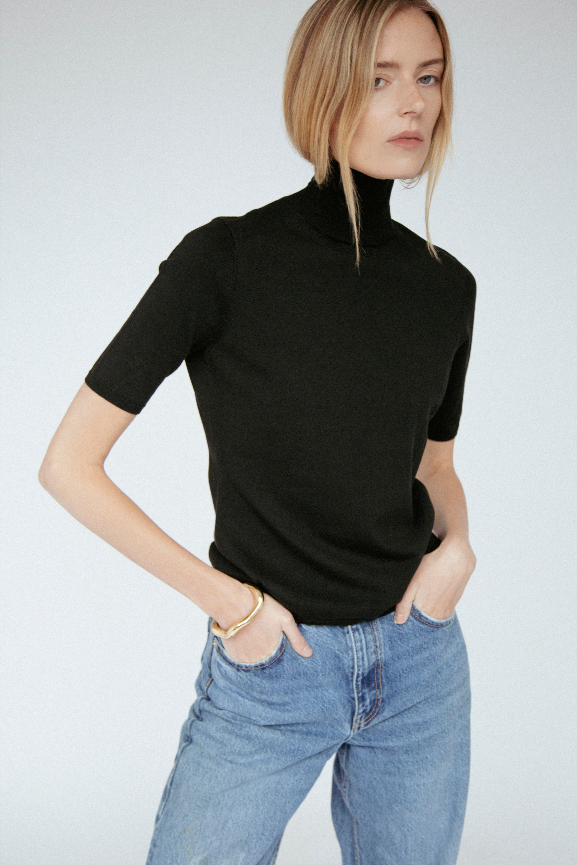 Turtleneck, 3/4 sleeves, straight bodice fit, stretch.