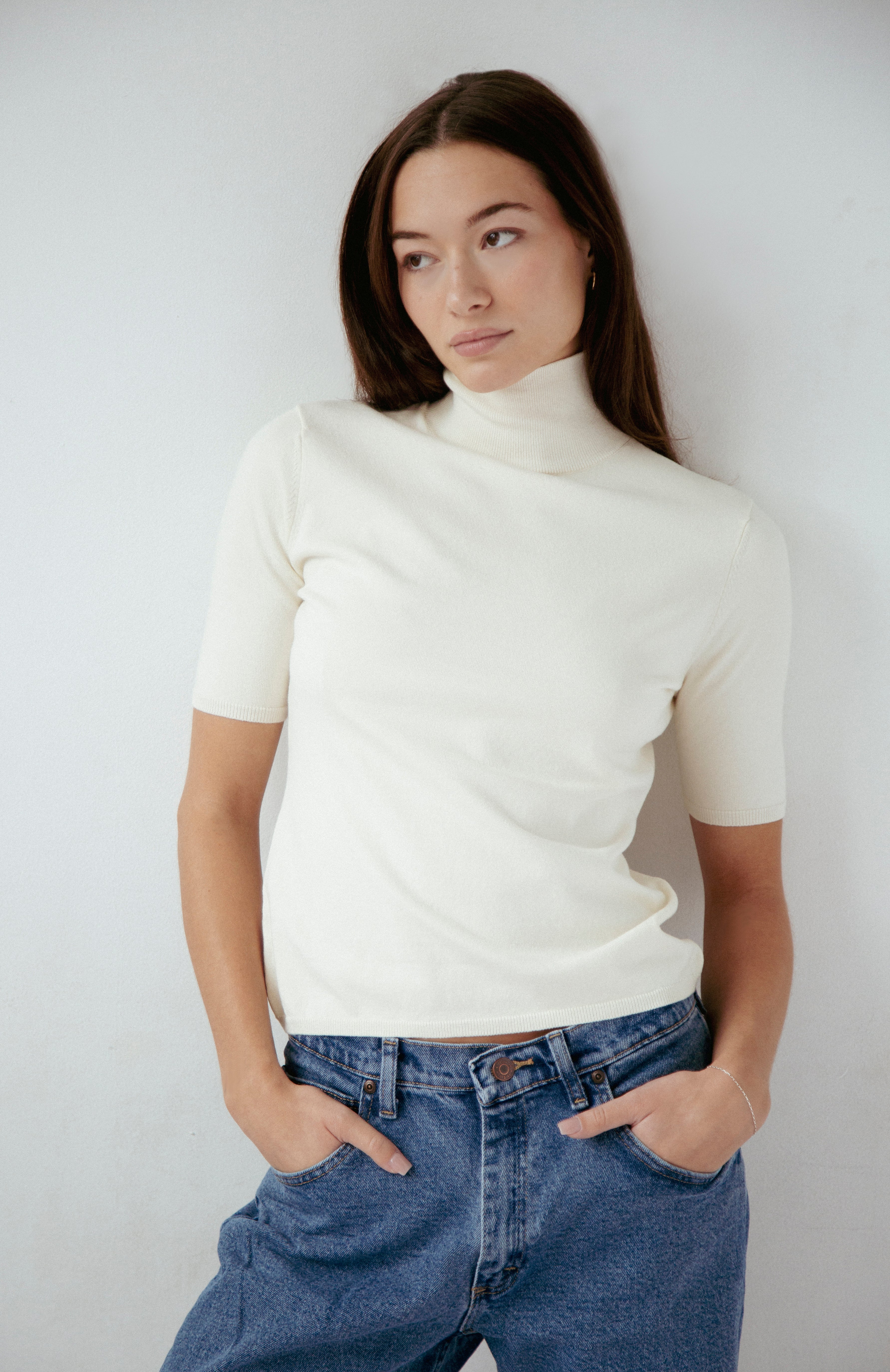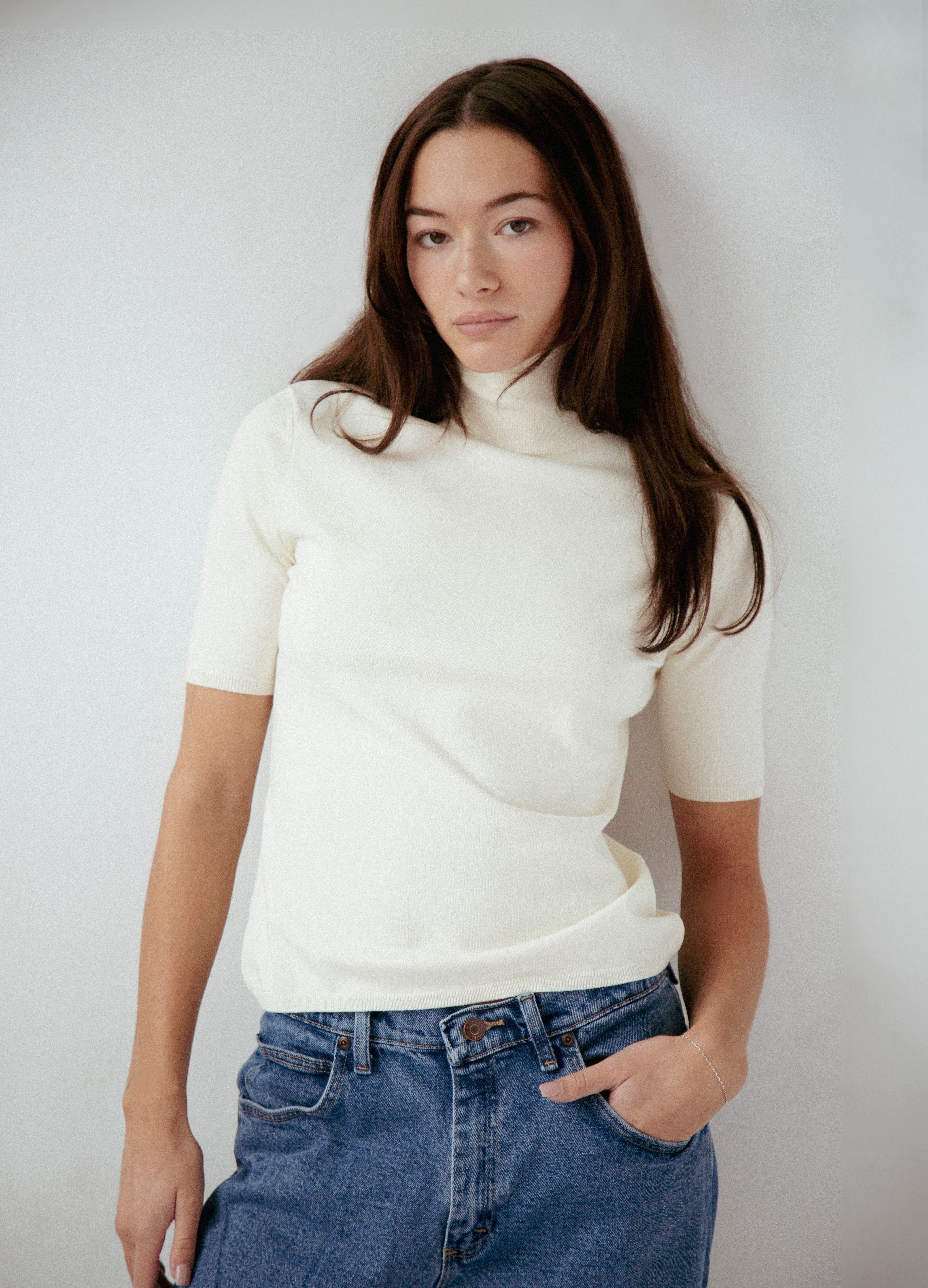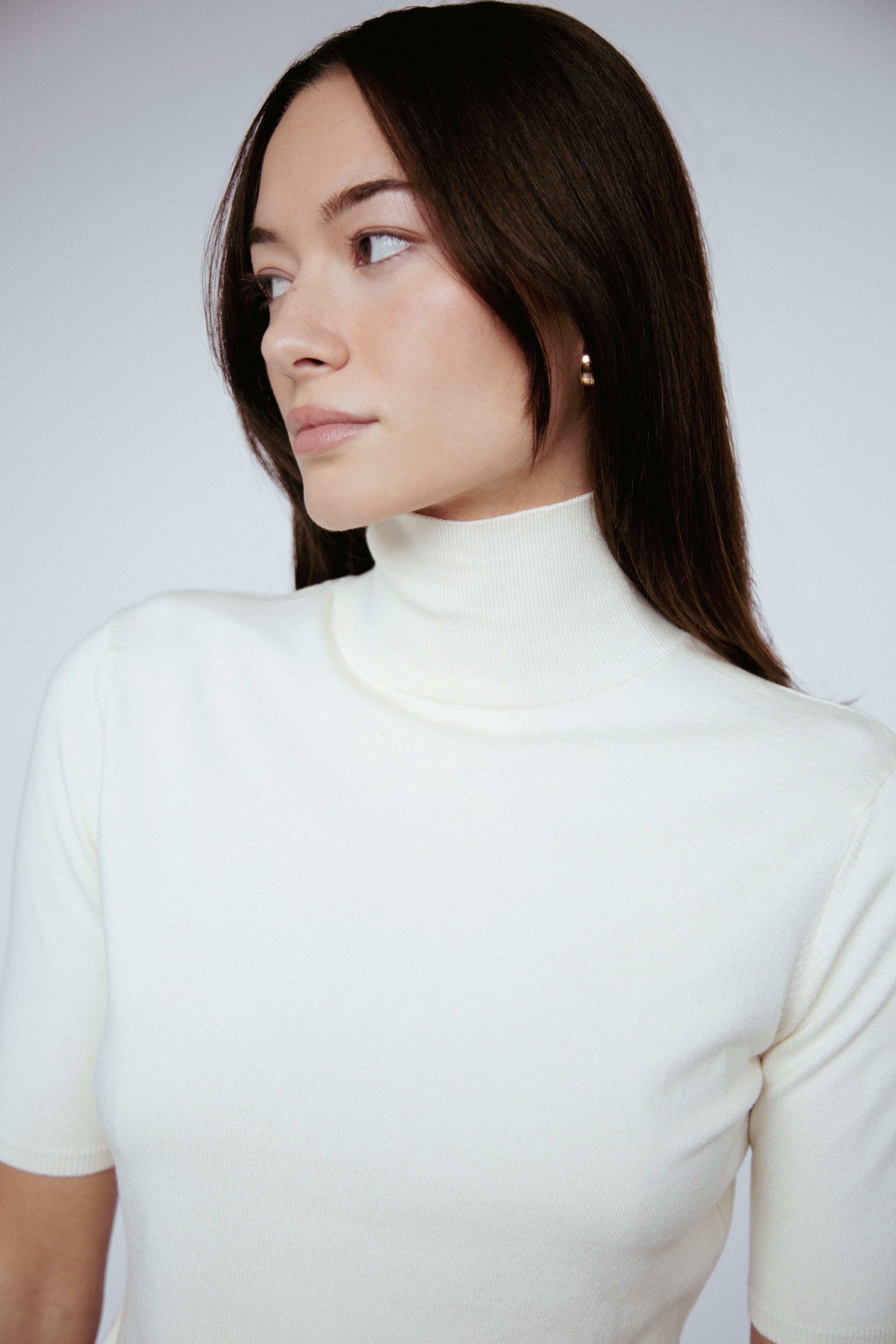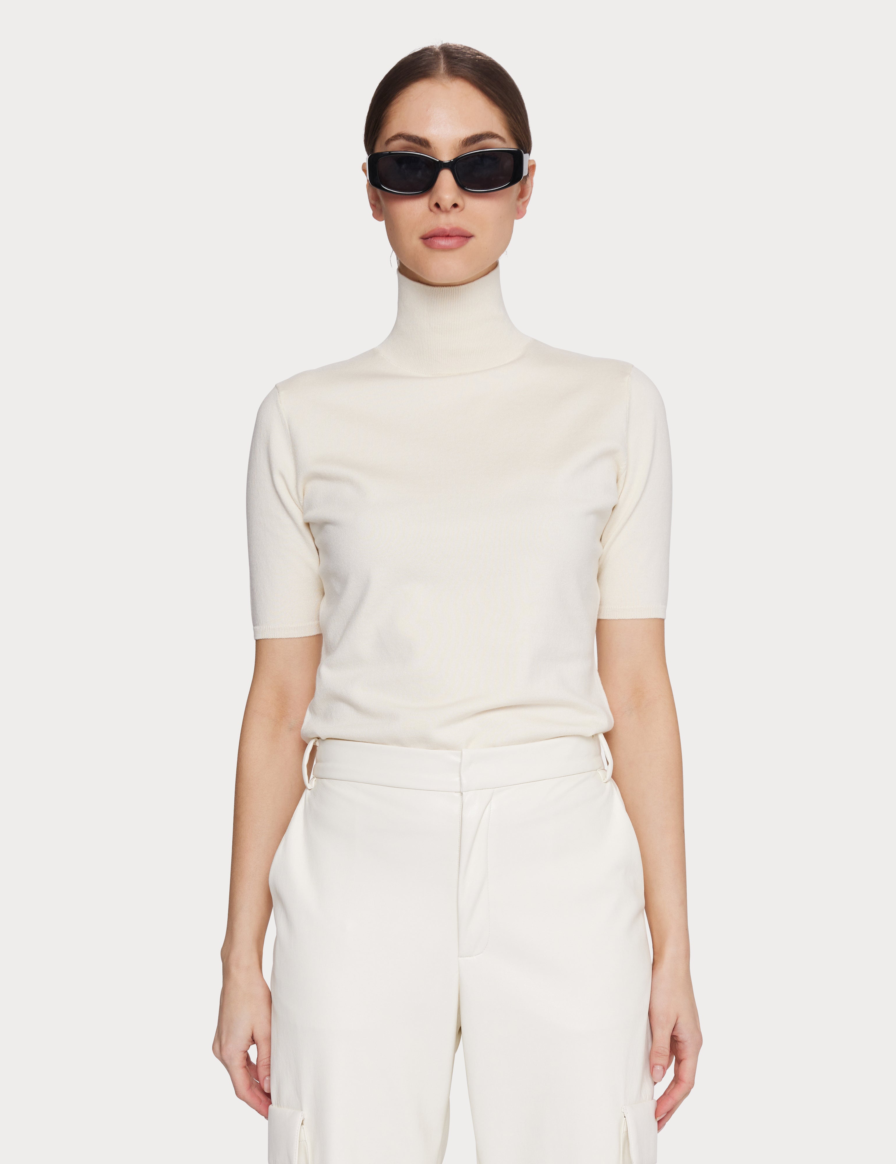 Turtleneck, 3/4 sleeves, straight bodice fit, stretch.