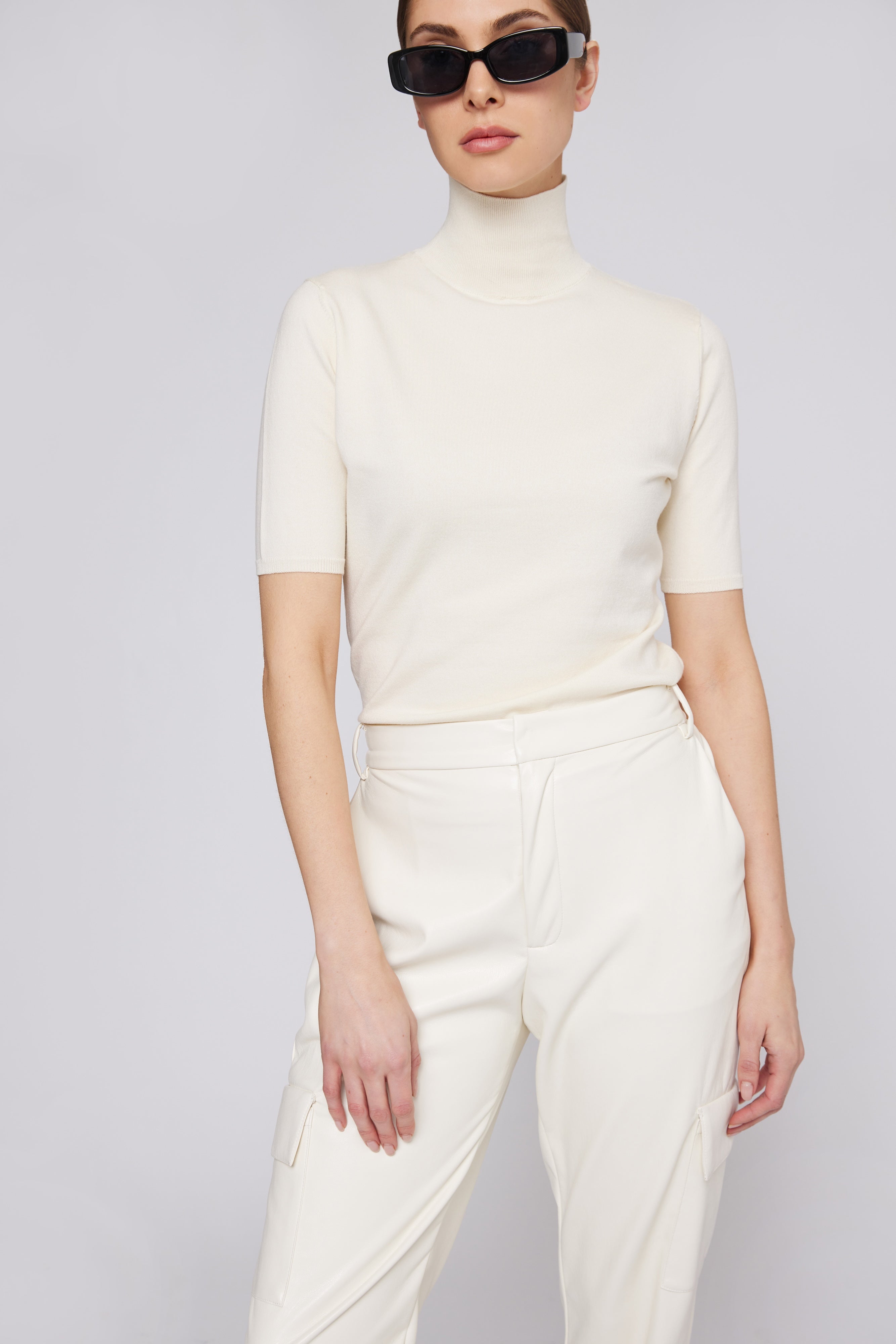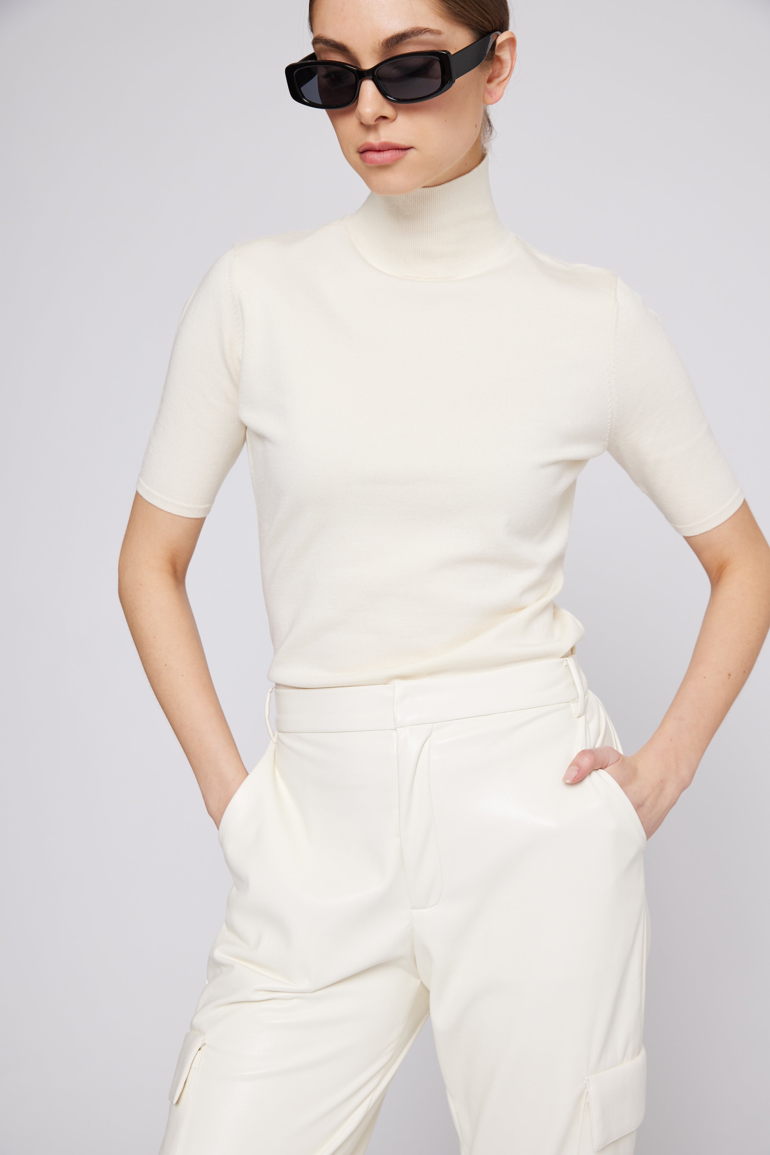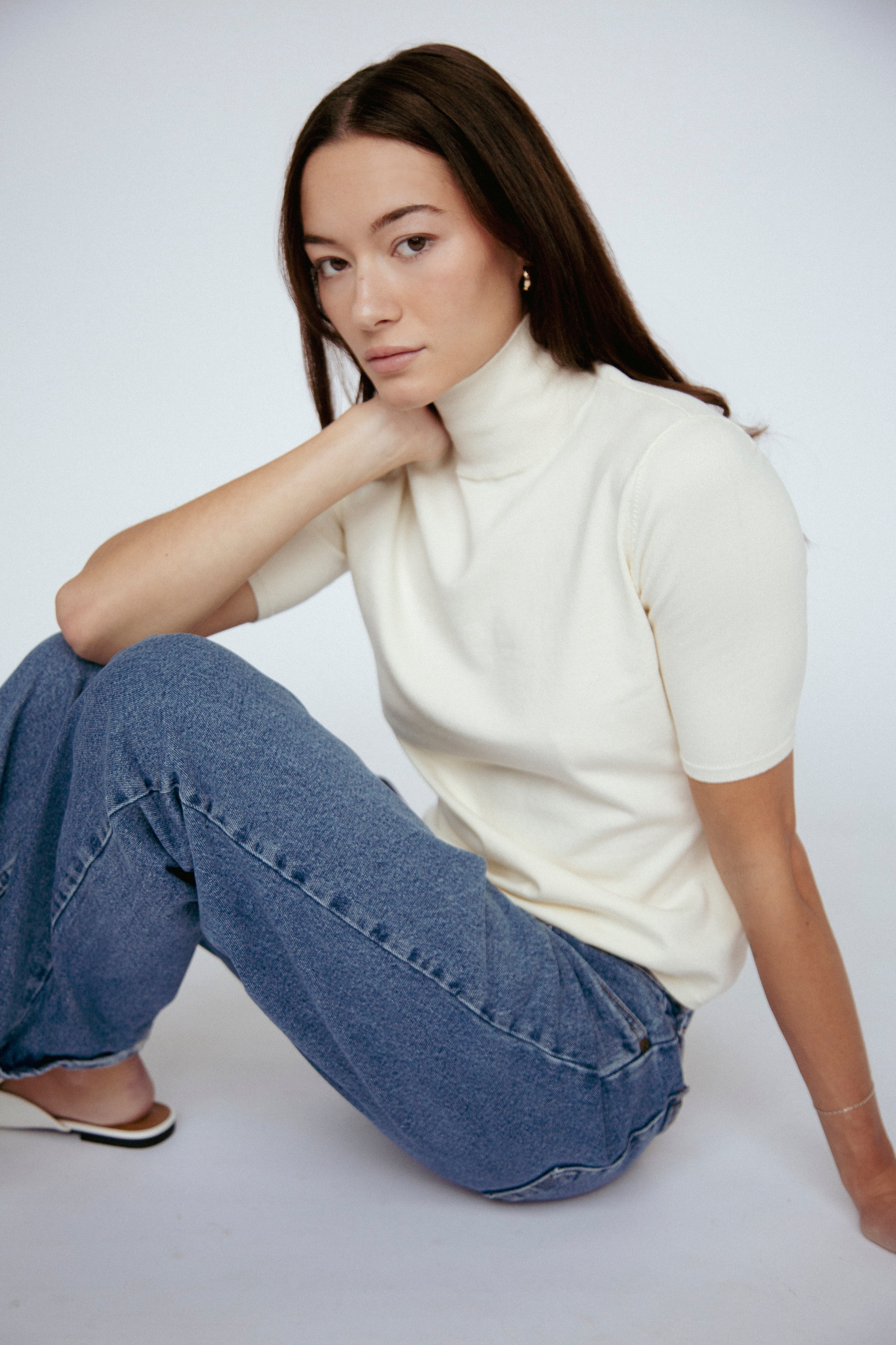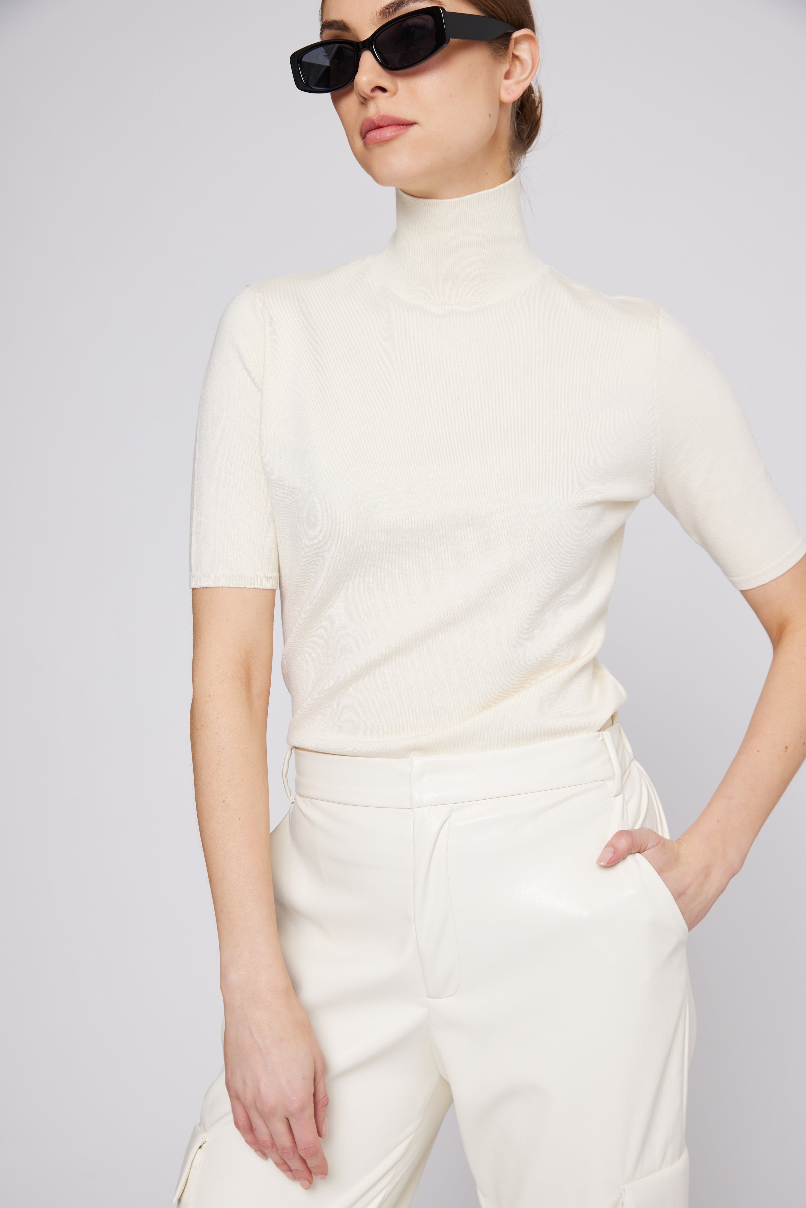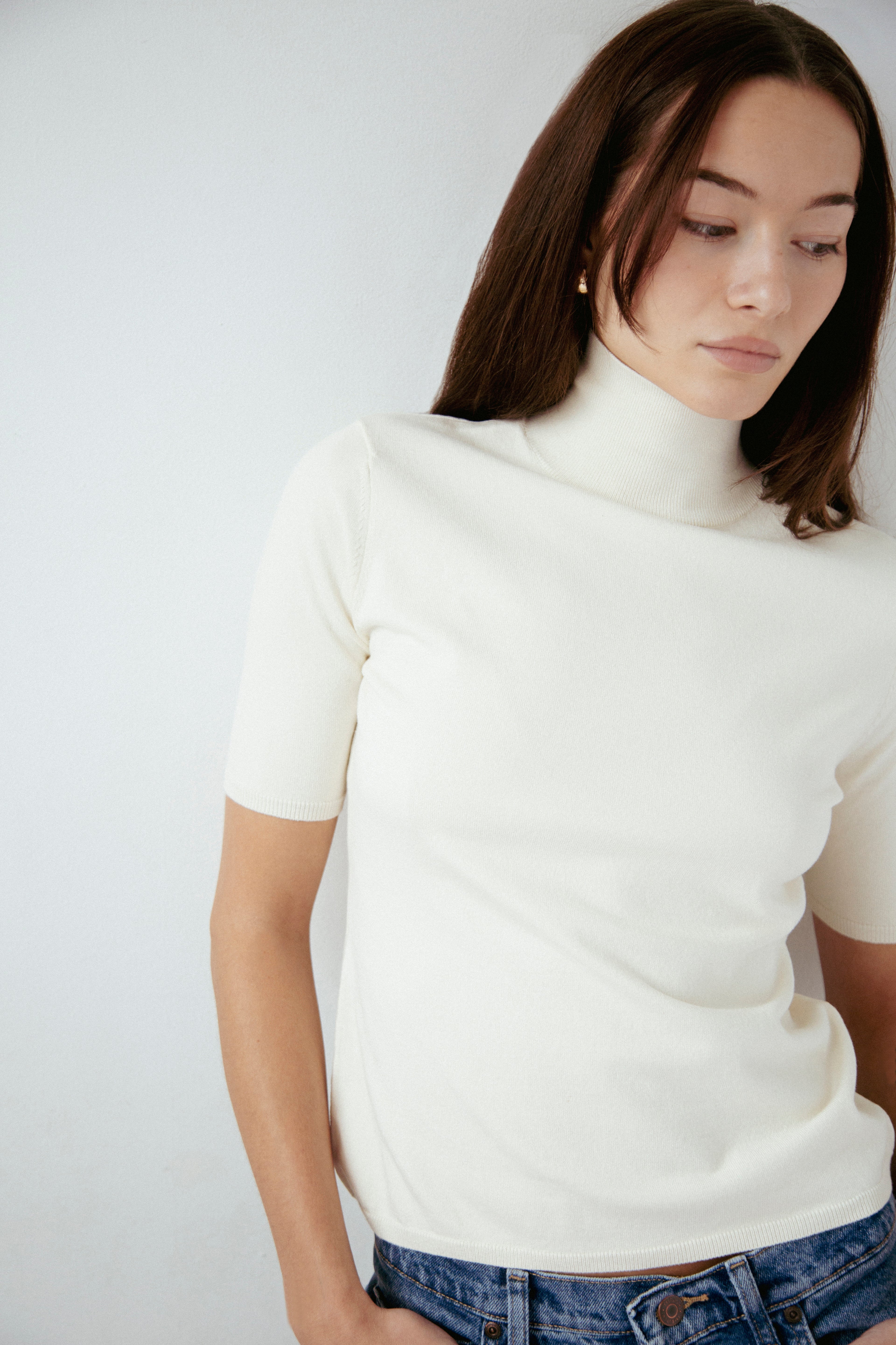 Turtleneck, 3/4 sleeves, straight bodice fit, stretch.