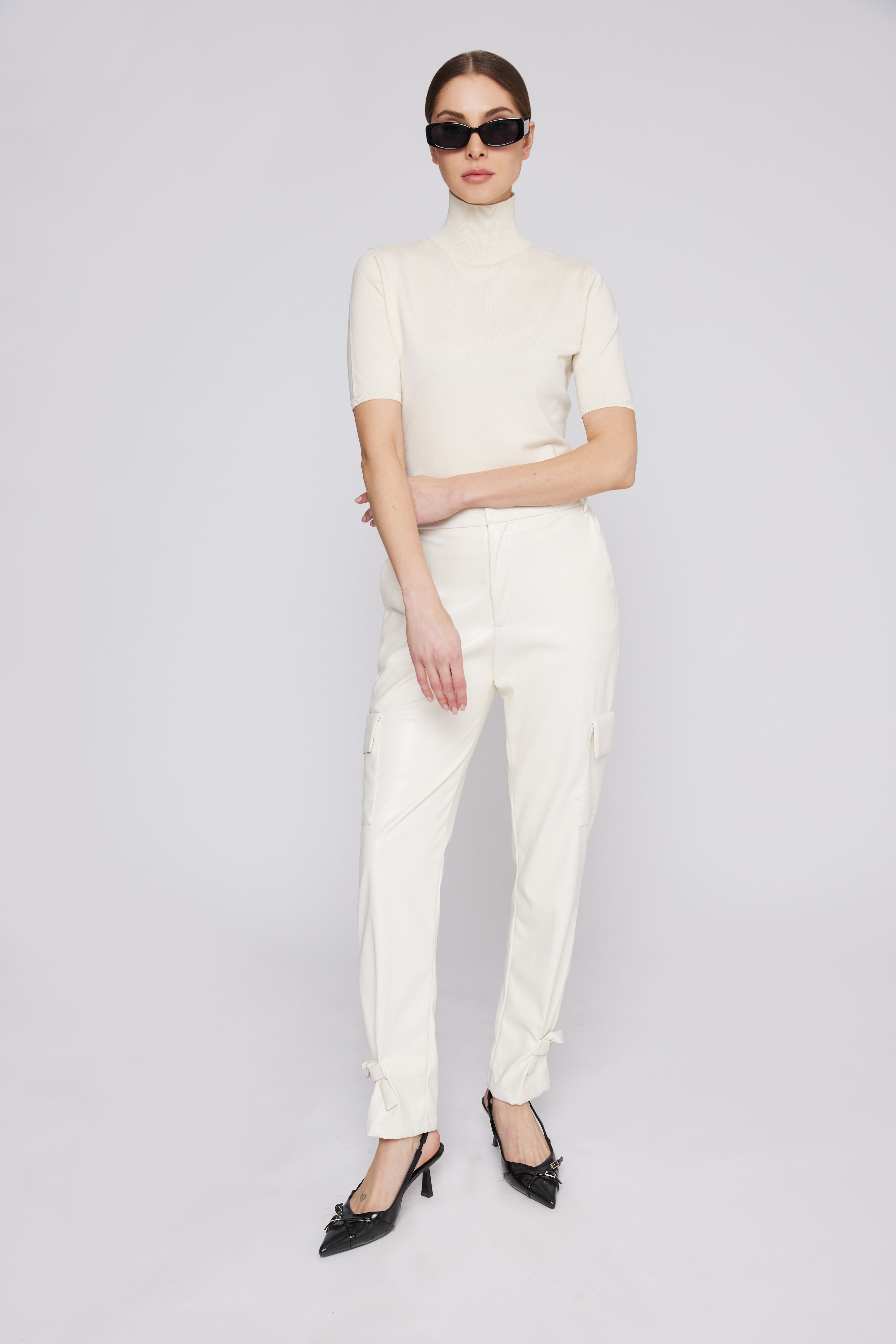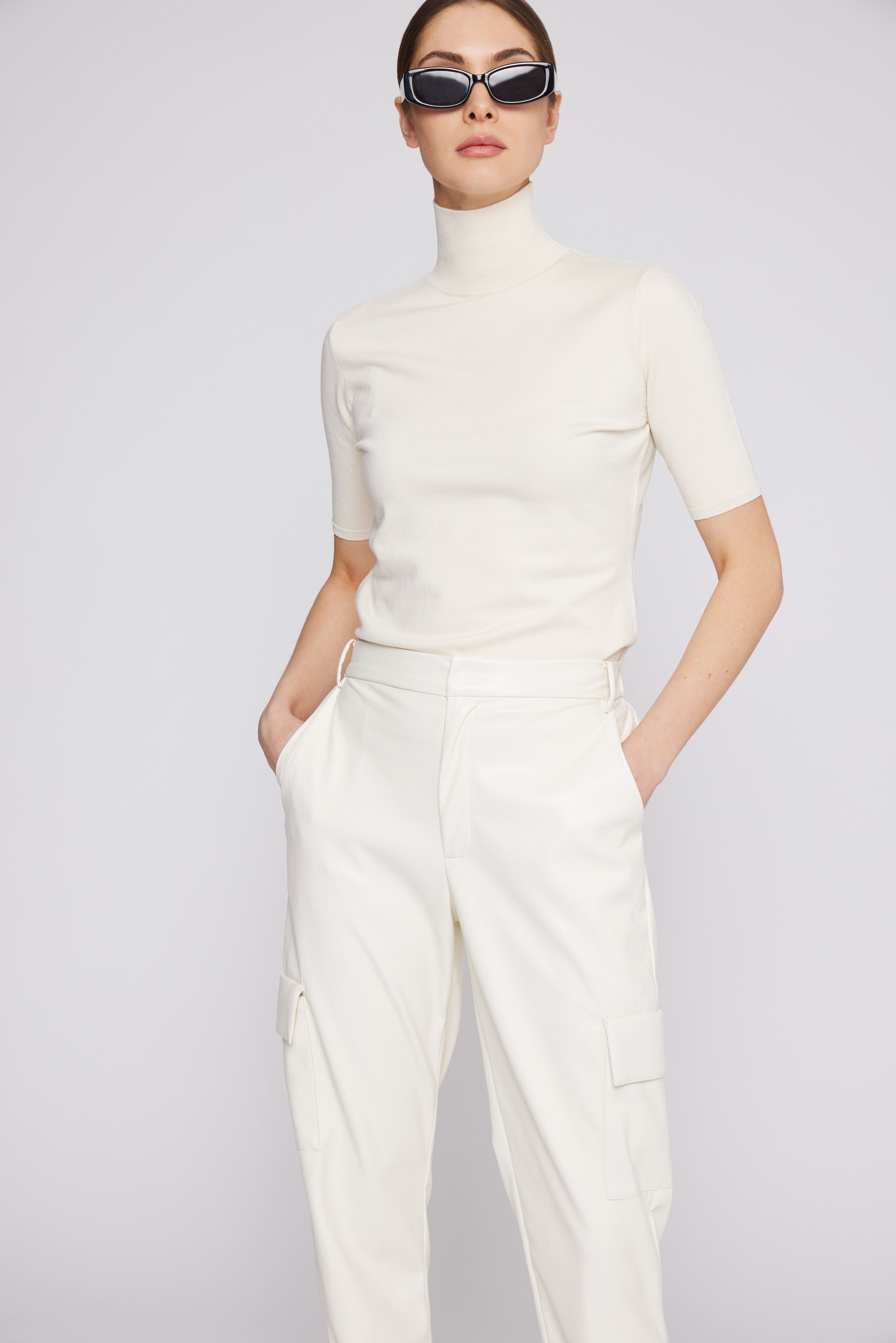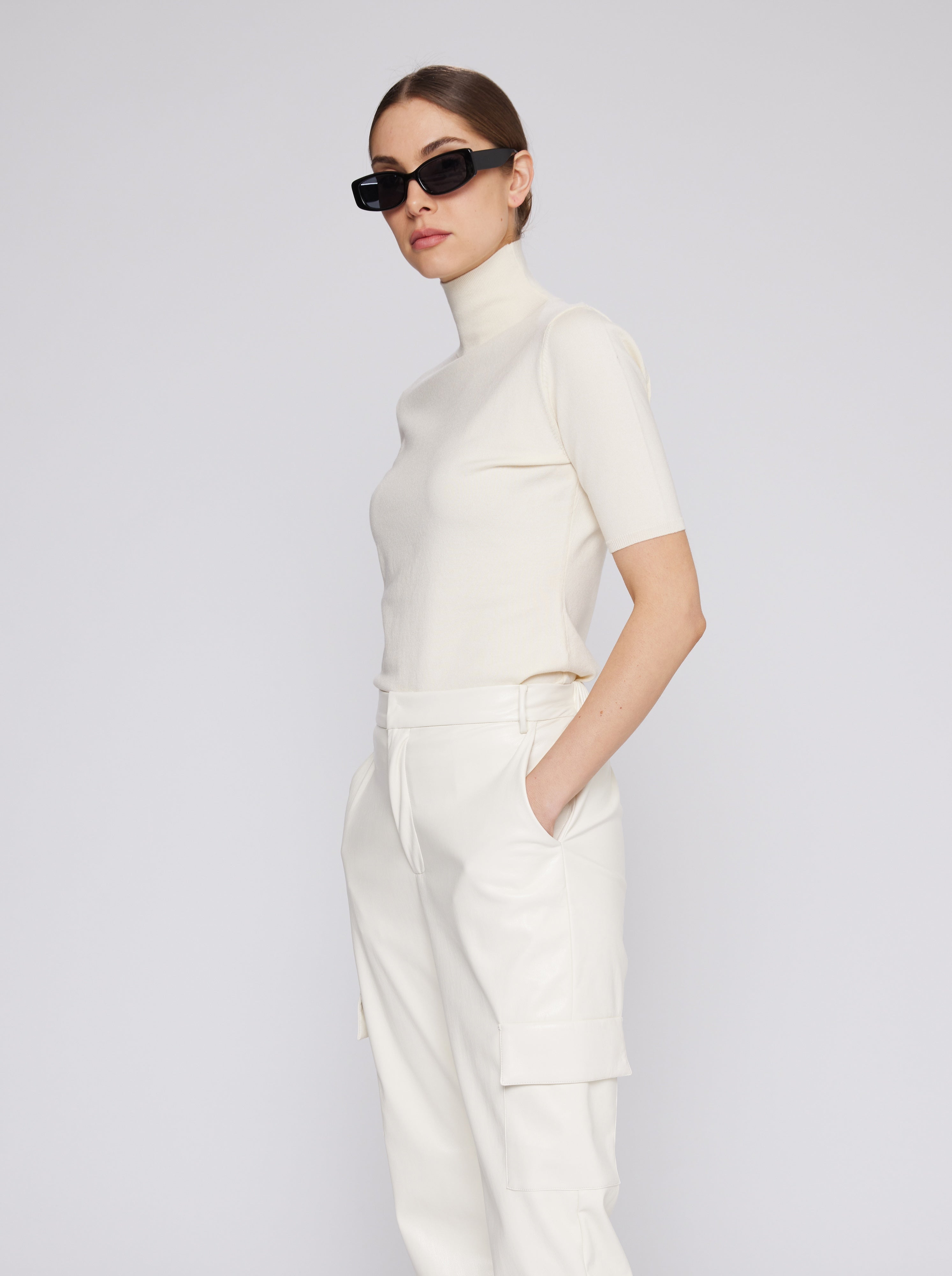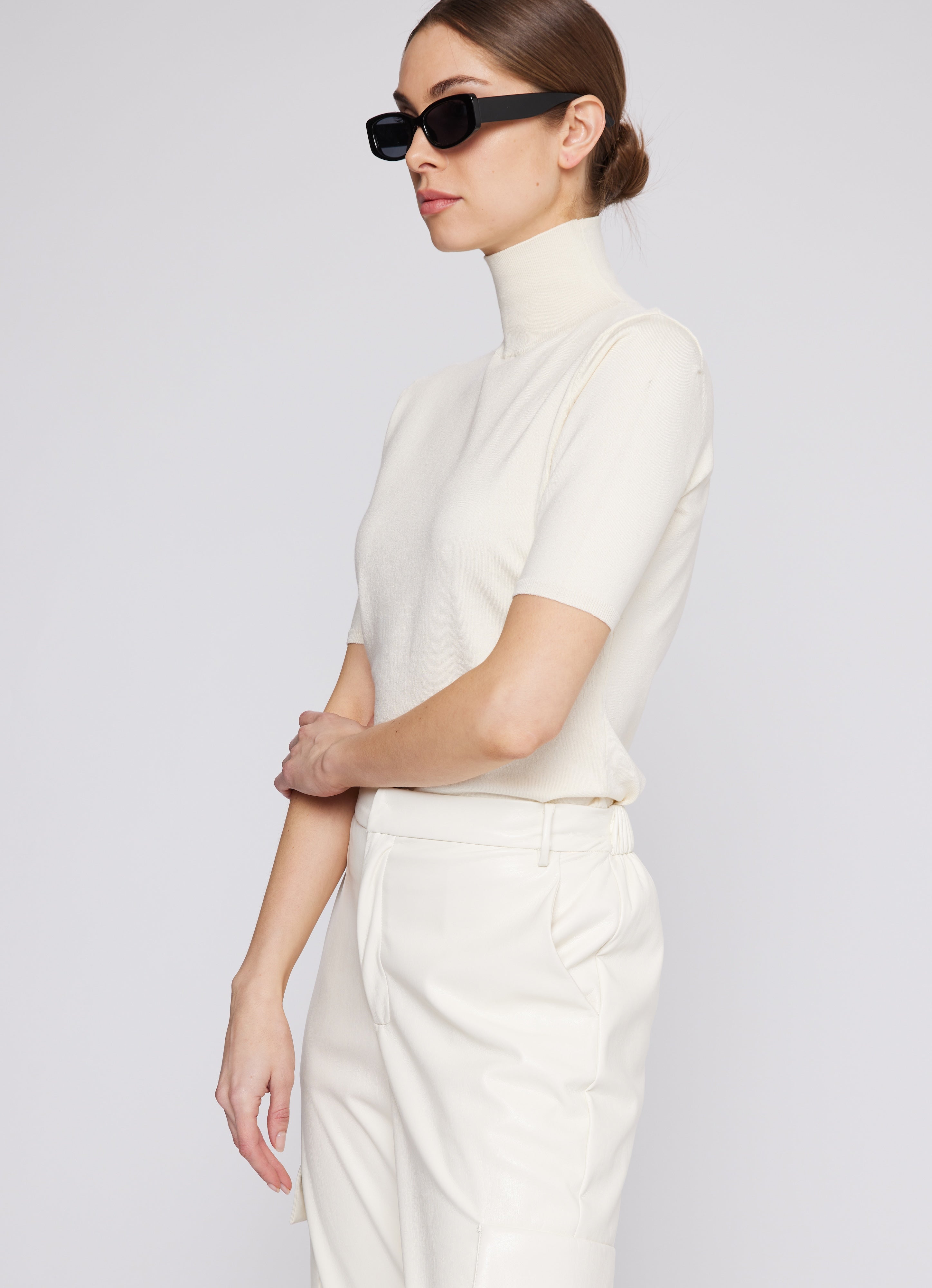 Turtleneck, 3/4 sleeves, straight bodice fit, stretch.