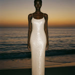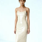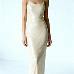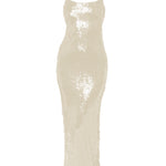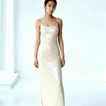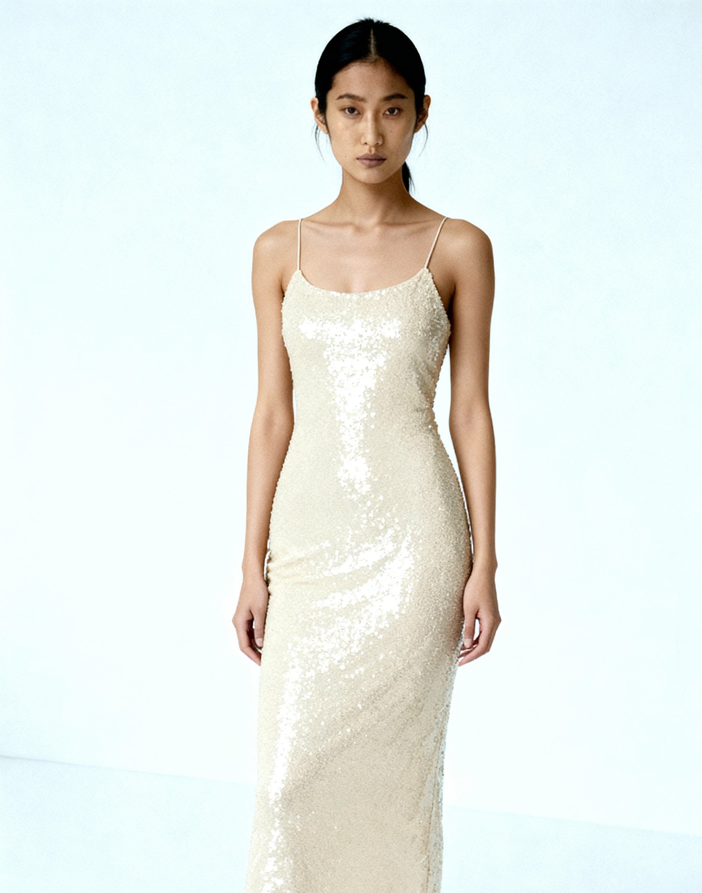 A study in quiet glamour. This creamy Ivory column gown is hand-finished in rich, light-catching sequins that subtly shift with every movement. Designed with barely-there straps and a softly sculpted silhouette, it skims the body with ease, thanks to a silky stretch-jersey interior that offers unexpected comfort beneath the surface.