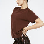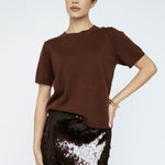 Designed to captivate, this sequin skirt shimmers in a deep mahogany brown, offering a rich and refined take on evening glamour. Cut to a flattering midi length with a straight silhouette, it’s finished with a side slit for subtle movement. An elastic waistband and slinky stretch jersey lining ensure ease and comfort without compromising its elevated allure.
