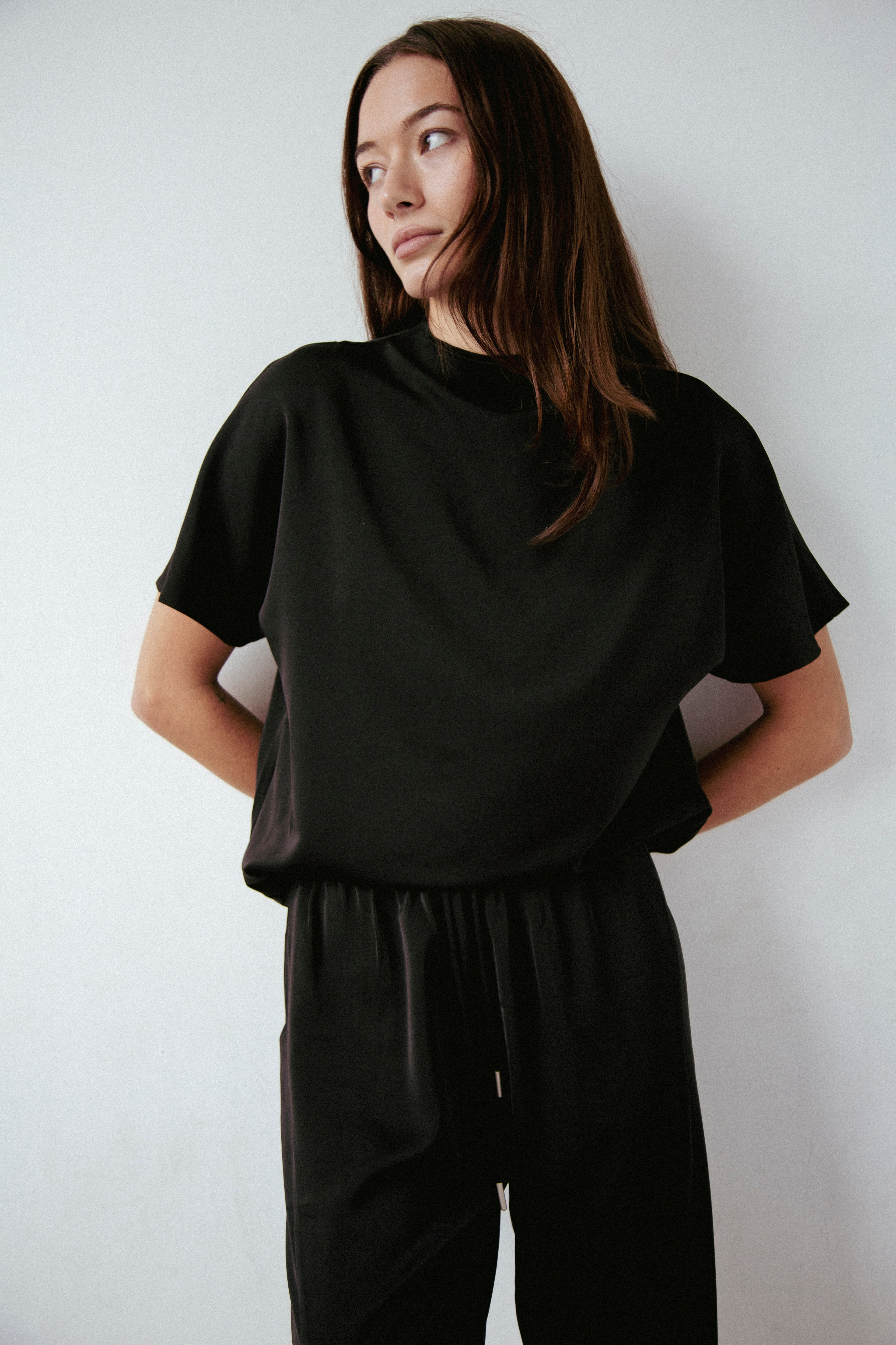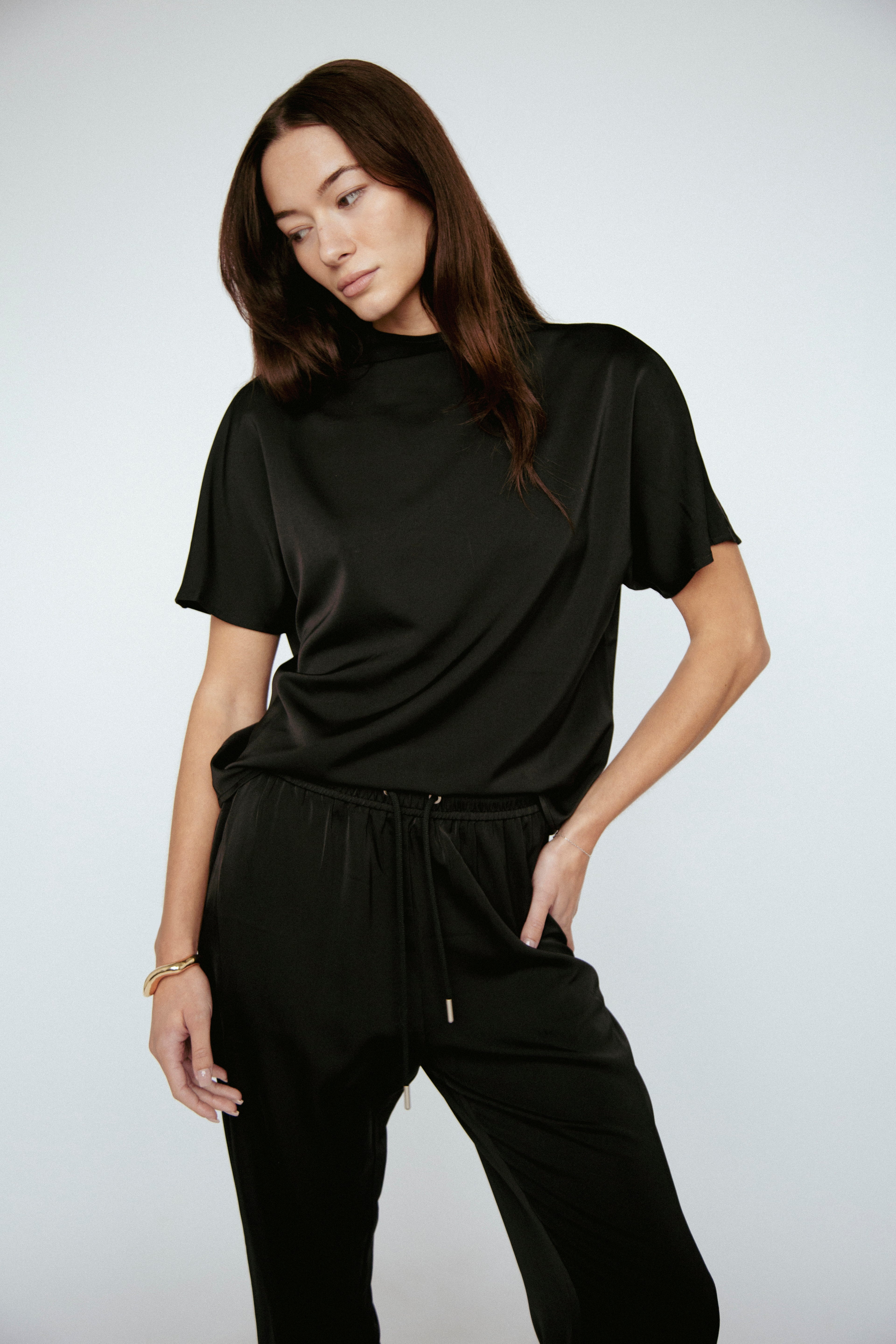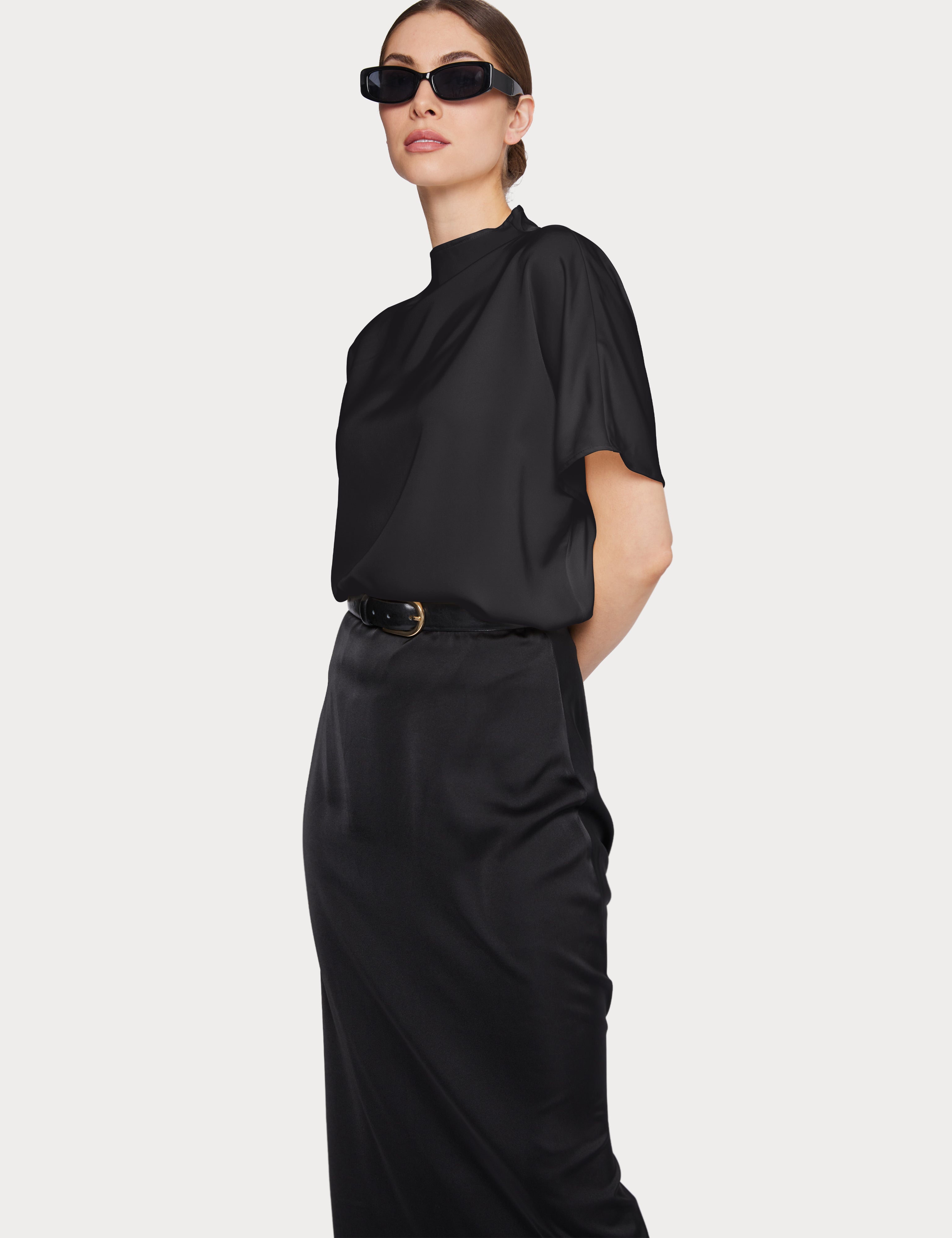 Elevate your wardrobe with our batwing satin top, crafted from buttery, silky-soft satin. This effortlessly chic tee features a beautiful weight that flows and drapes gracefully, catching the light with every movement. The relaxed fit offers versatility, making it ideal for pairing with denim, dress pants, or skirts for a sophisticated look. A mock neck adds elegant drape, while the loose batwing sleeves create a beautifully flowing, relaxed easy to wear silhouette. For an hourglass effect, style it tucked in. Finished with a discreet back zipper closure, this top combines comfort with refinement.