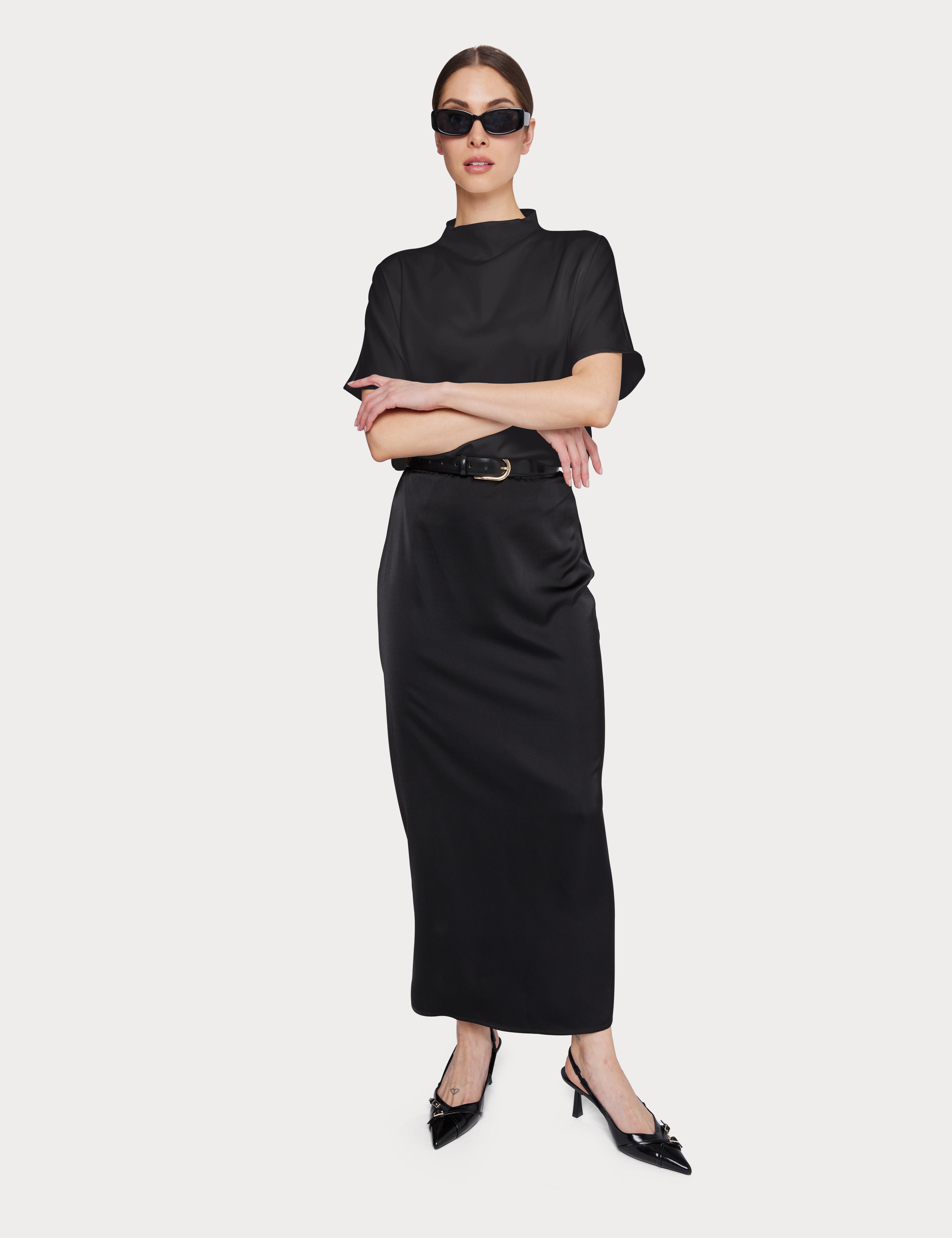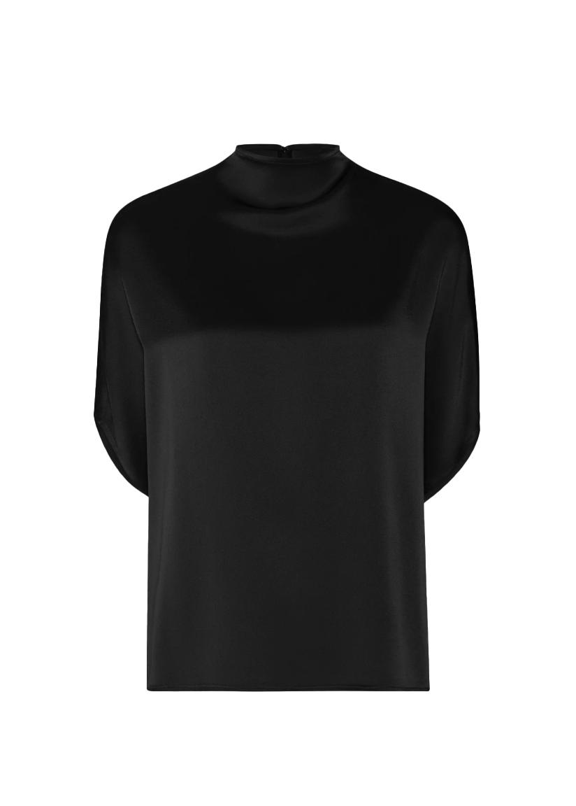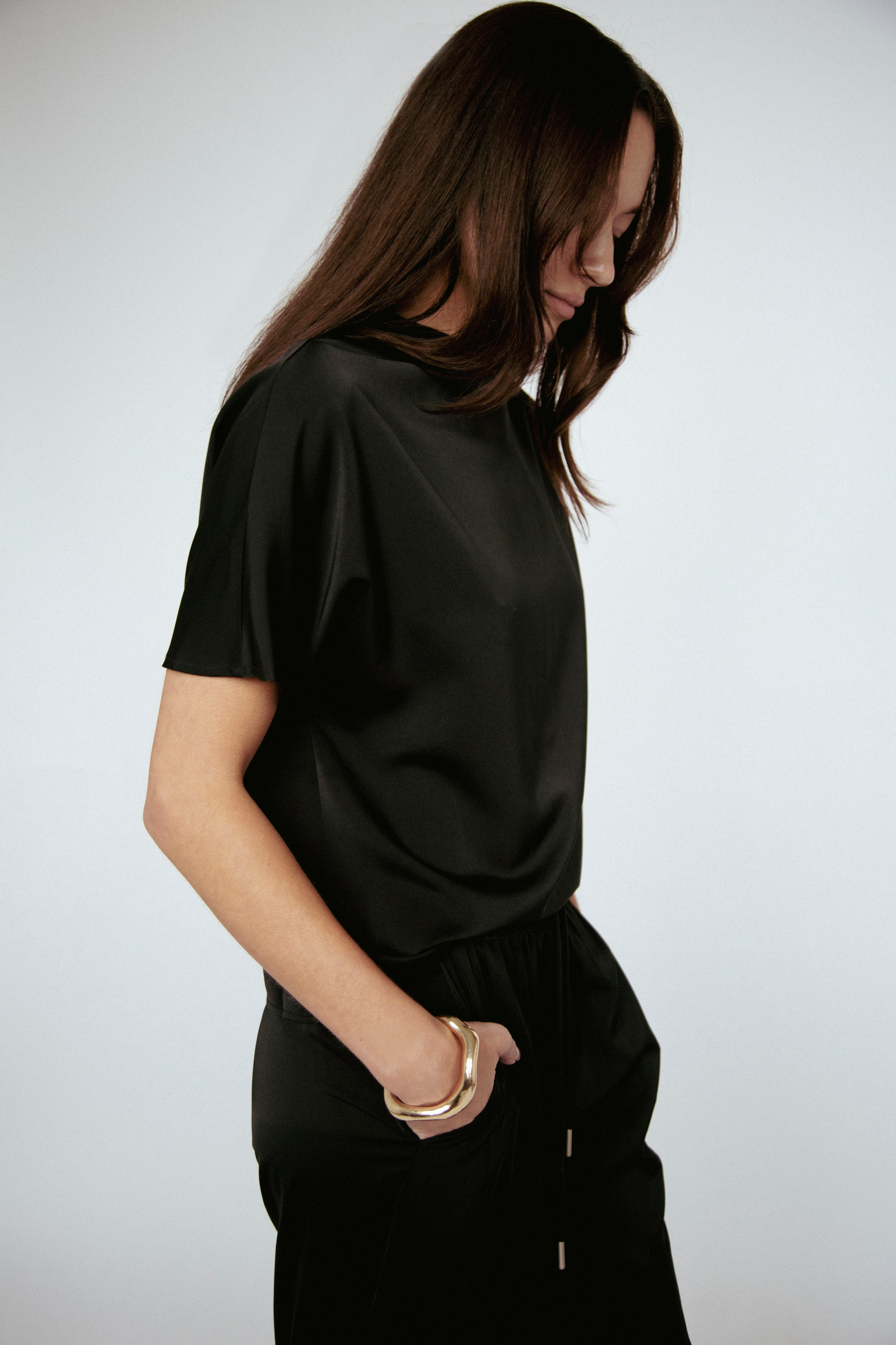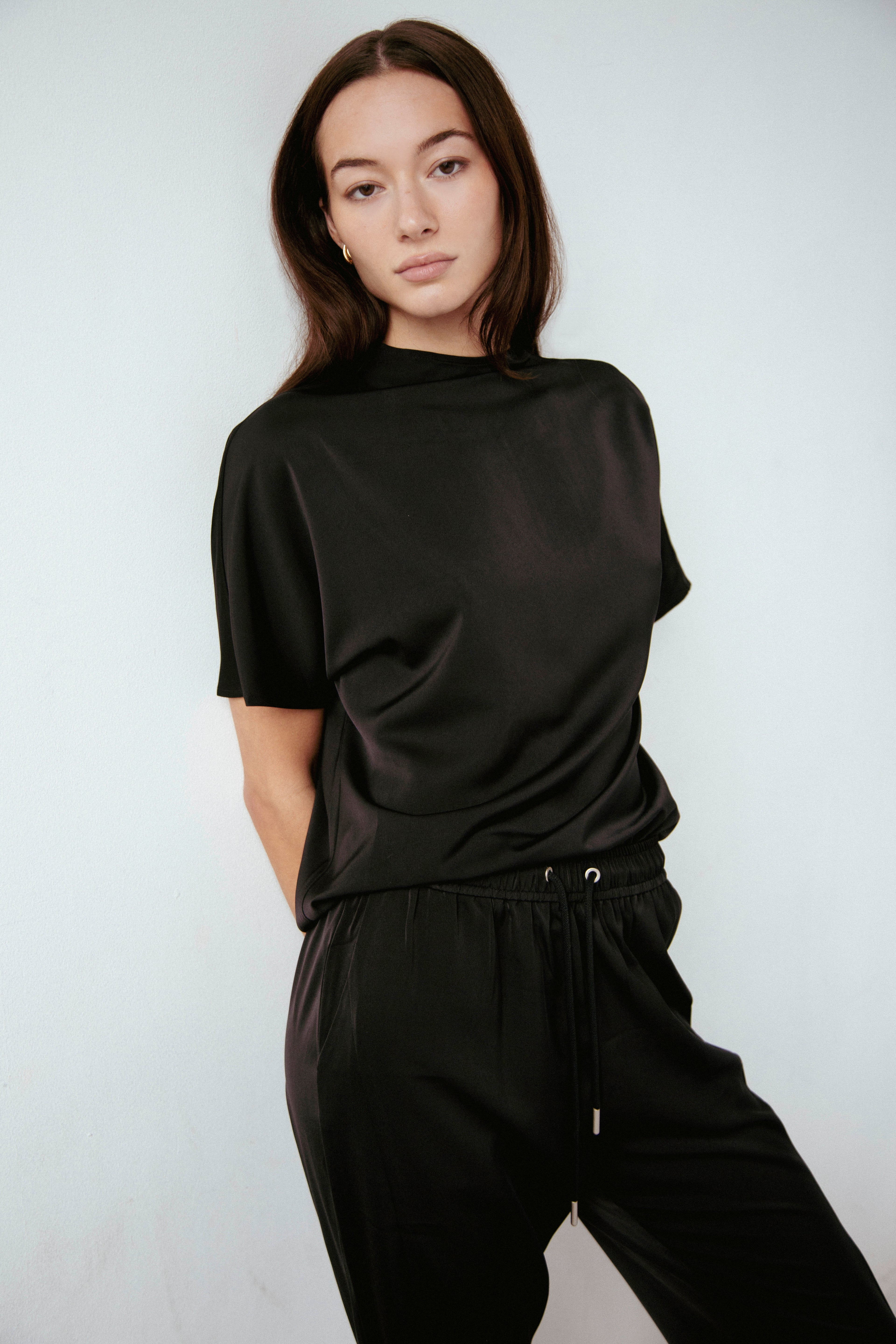 Elevate your wardrobe with our batwing satin top, crafted from buttery, silky-soft satin. This effortlessly chic tee features a beautiful weight that flows and drapes gracefully, catching the light with every movement. The relaxed fit offers versatility, making it ideal for pairing with denim, dress pants, or skirts for a sophisticated look. A mock neck adds elegant drape, while the loose batwing sleeves create a beautifully flowing, relaxed easy to wear silhouette. For an hourglass effect, style it tucked in. Finished with a discreet back zipper closure, this top combines comfort with refinement.
