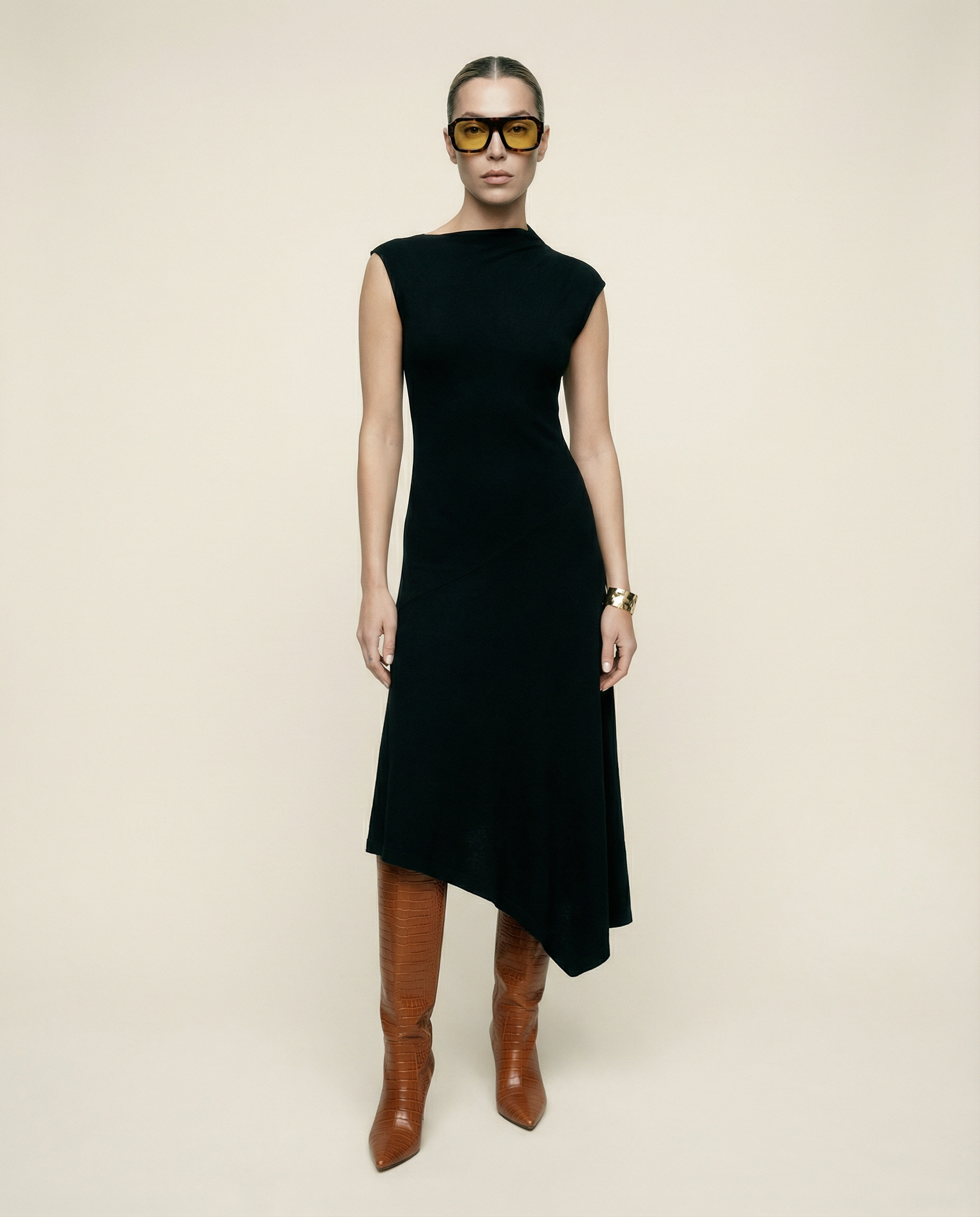 Sculptural ease meets everyday versatility. This asymmetric dress is crafted from our signature bamboo jersey—a fabric chosen for its luxurious drape, breathable softness, and sustainable footprint. Featuring pleated shoulder detailing and a fluid, uneven hemline, the silhouette strikes a balance between refined and relaxed.