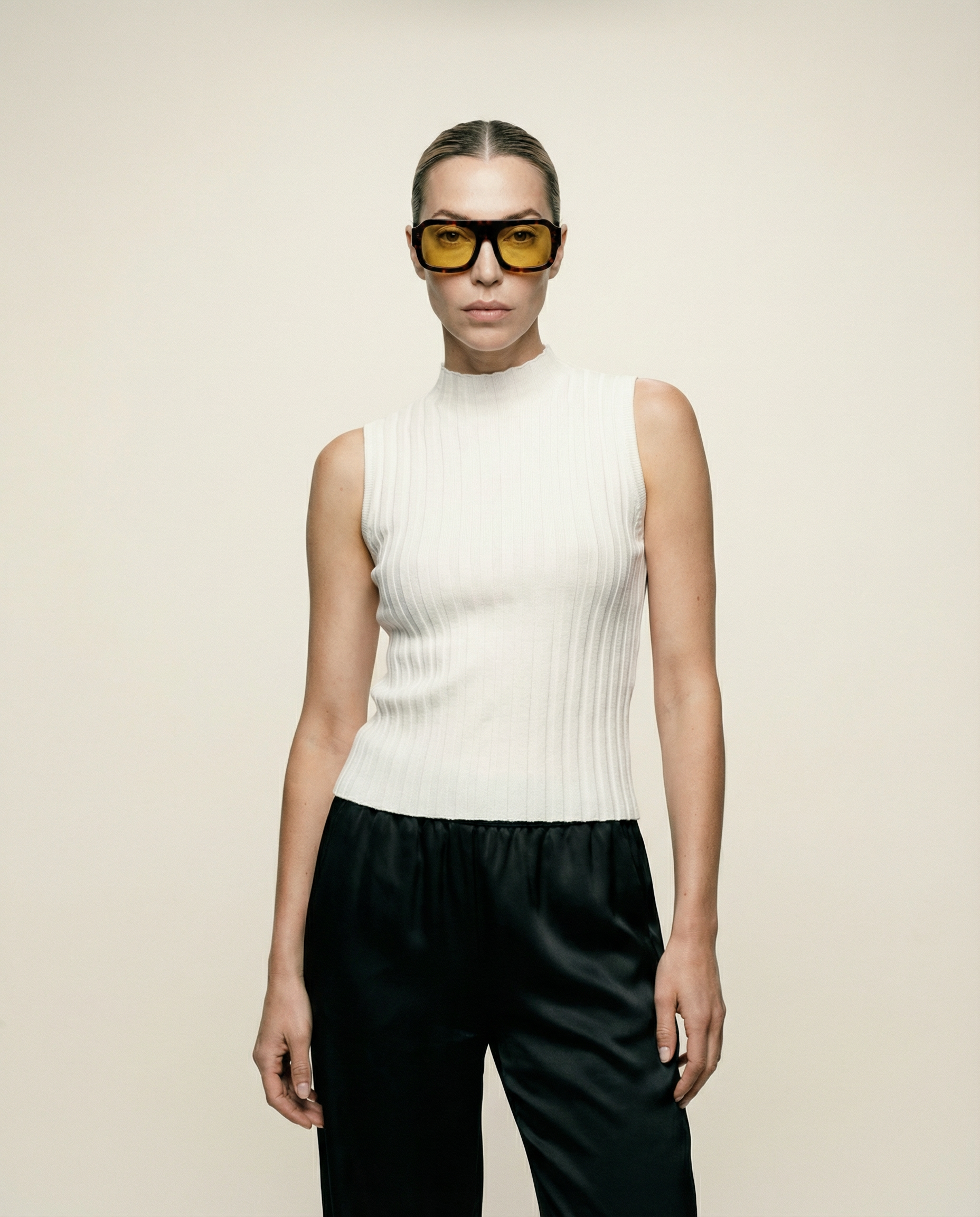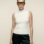 A sleek essential with a modern edge. This mockneck tank is cut from a fine modal-cotton blend, offering an exceptionally soft hand feel with remarkable stretch and recovery. The deep ribbing detail creates a subtle texture that elevates its minimal silhouette, while the mockneck adds refinement. Designed to move with you, this versatile piece layers effortlessly under blazers and knits, yet stands strong on its own for a clean, streamlined look.