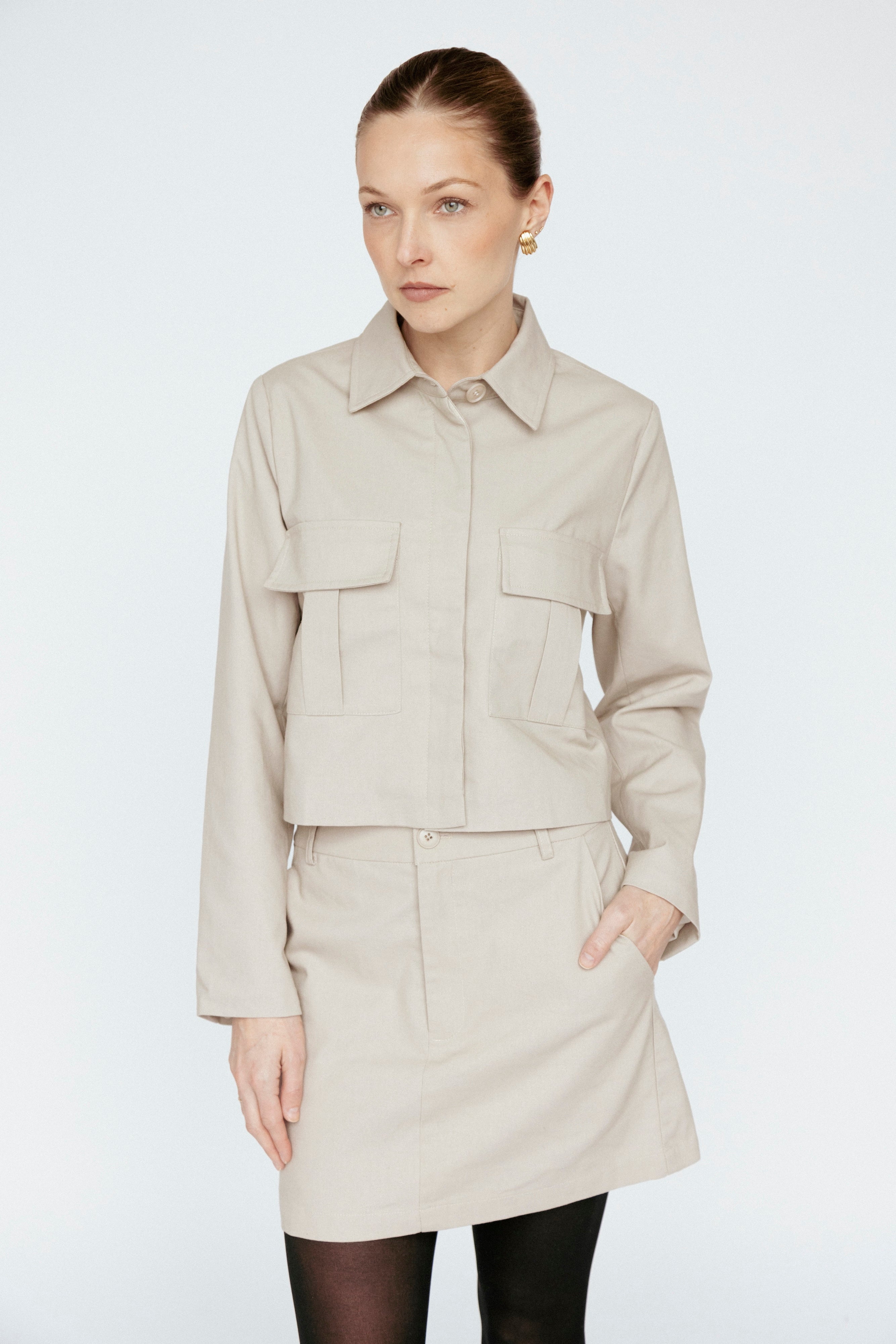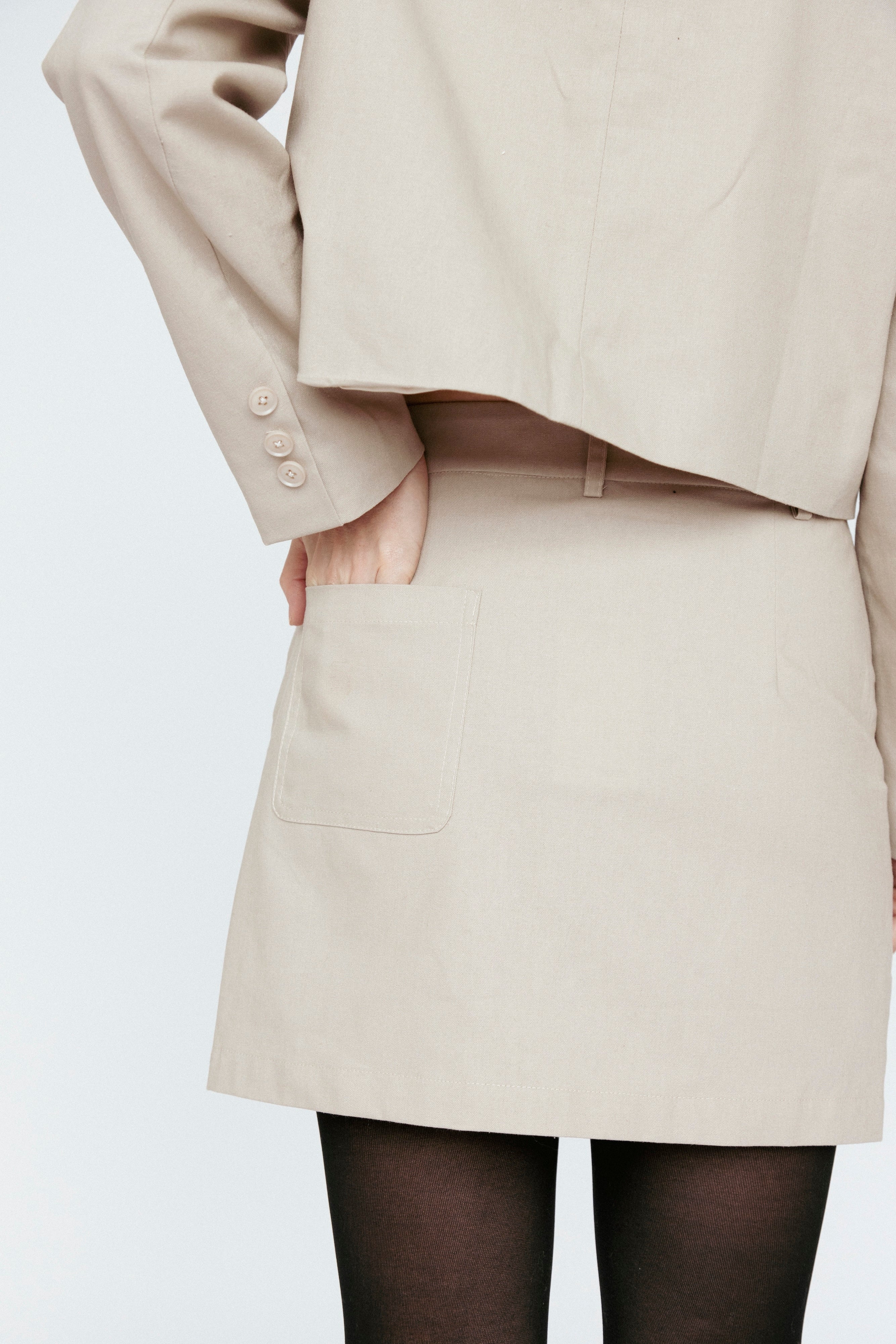 A masterclass in refined minimalism, this structured mini skirt is designed for effortless sophistication. Crafted from a luxurious cotton-linen blend, its tailored silhouette strikes the perfect balance between structure and ease. A precisely constructed fly-front detail lends a polished edge, while pocket belt loops and a single back pocket redefine classic utility with elevated restraint. Cut to a versatile length—never too short, always just right—this piece transitions seamlessly from day to evening, embodying modern elegance with an air of quiet confidence.