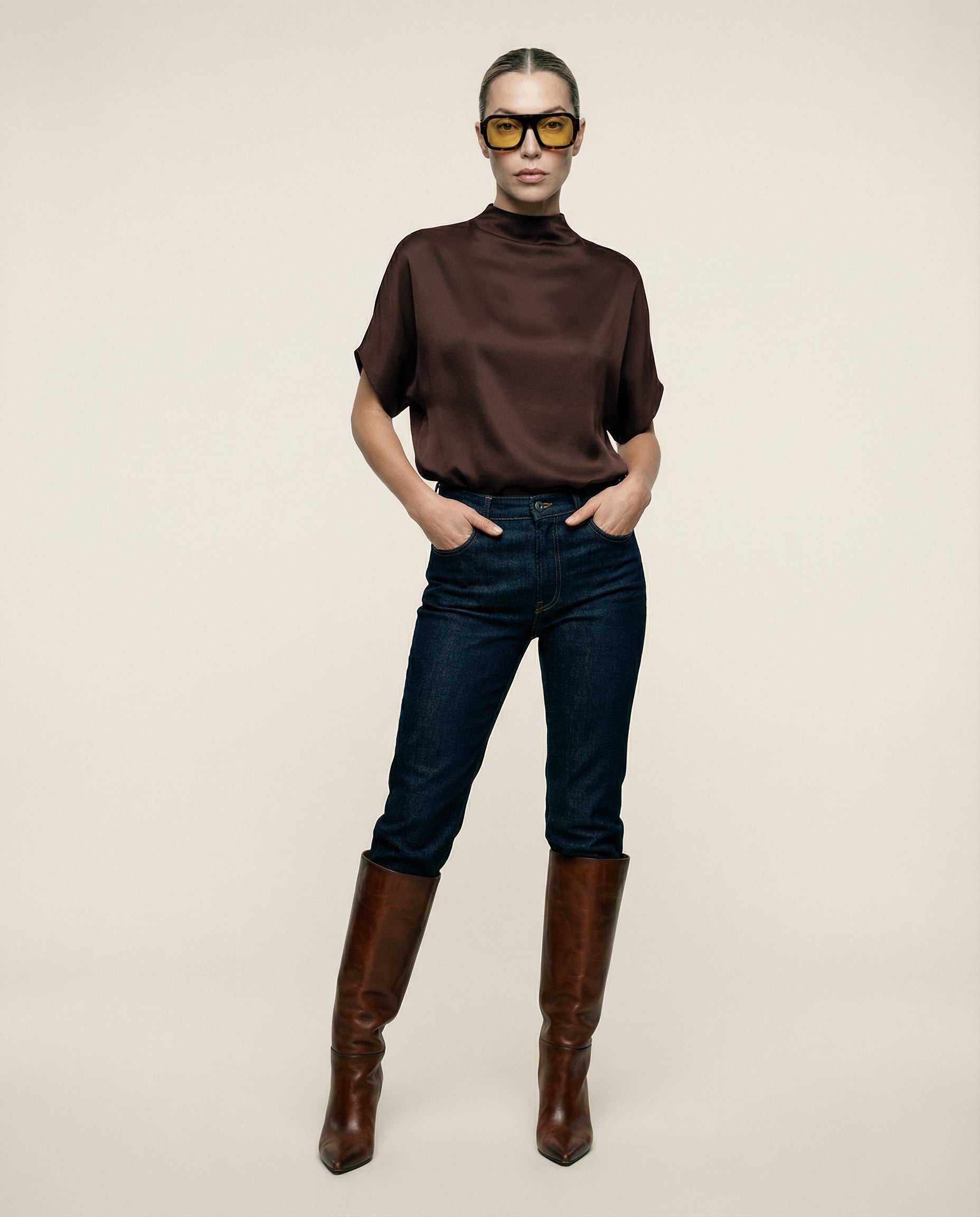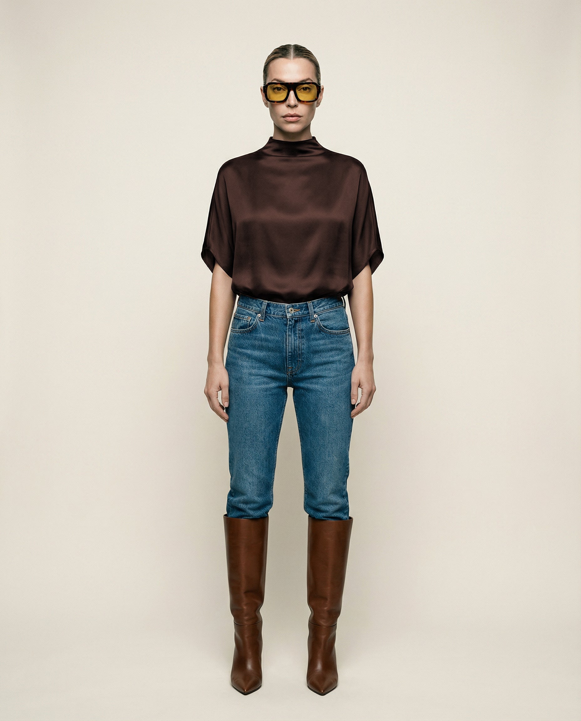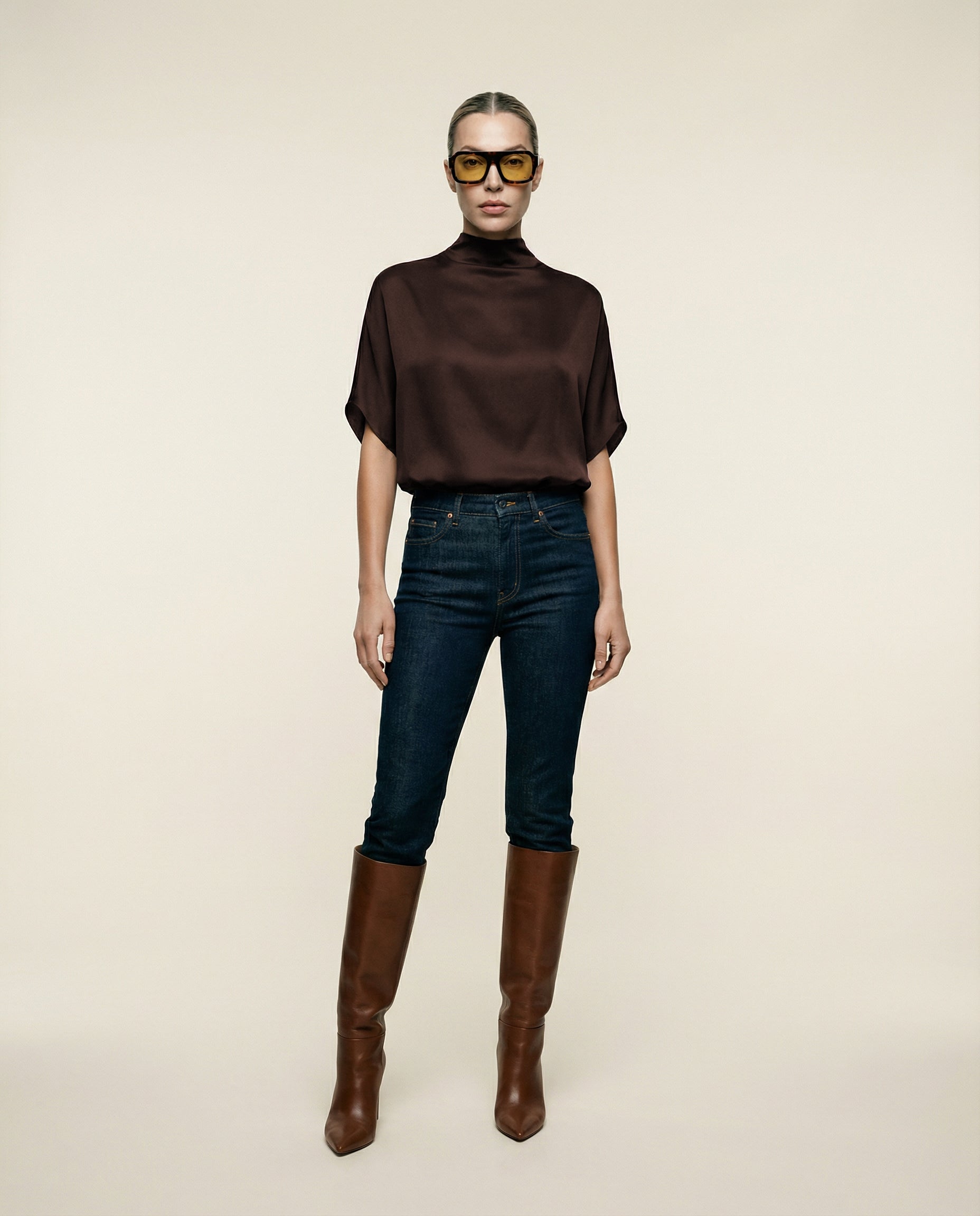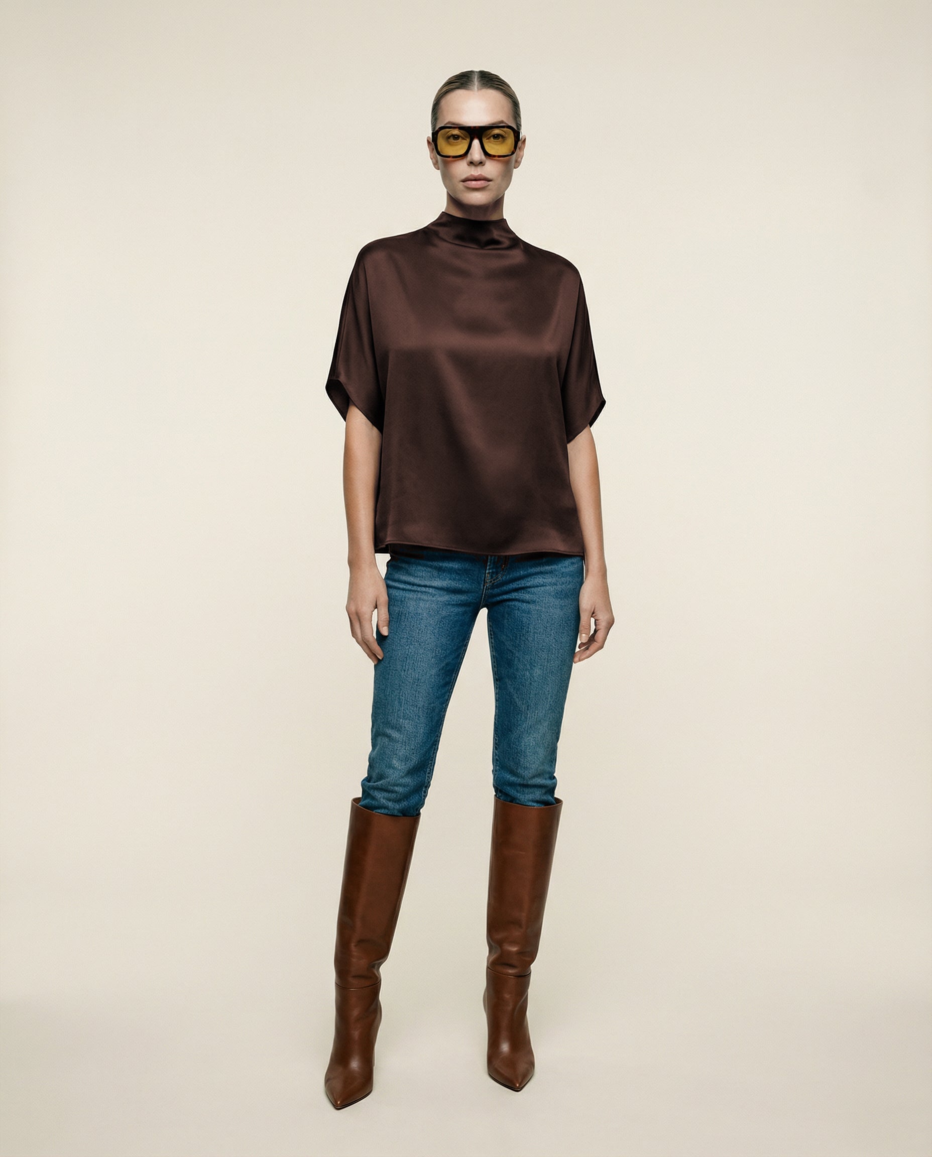 Elevate your wardrobe with our batwing satin top, crafted from buttery, silky-soft satin. This effortlessly chic tee features a beautiful weight that flows and drapes gracefully, catching the light with every movement. The relaxed fit offers versatility, making it ideal for pairing with denim, dress pants, or skirts for a sophisticated look. A mock neck adds elegant drape, while the loose batwing sleeves create a beautifully flowing, relaxed easy to wear silhouette. For an hourglass effect, style it tucked in. Finished with a discreet back zipper closure, this top combines comfort with refinement.