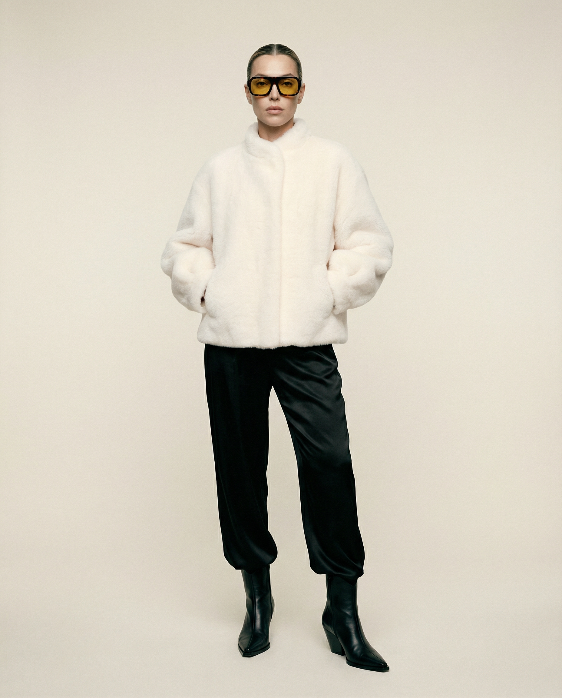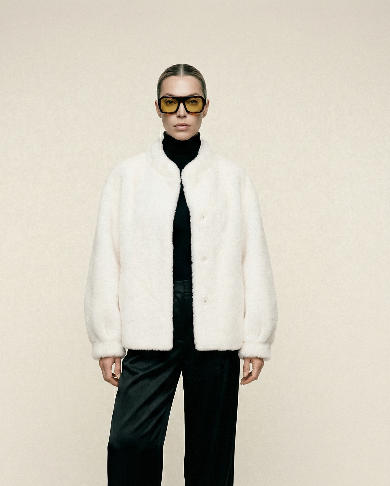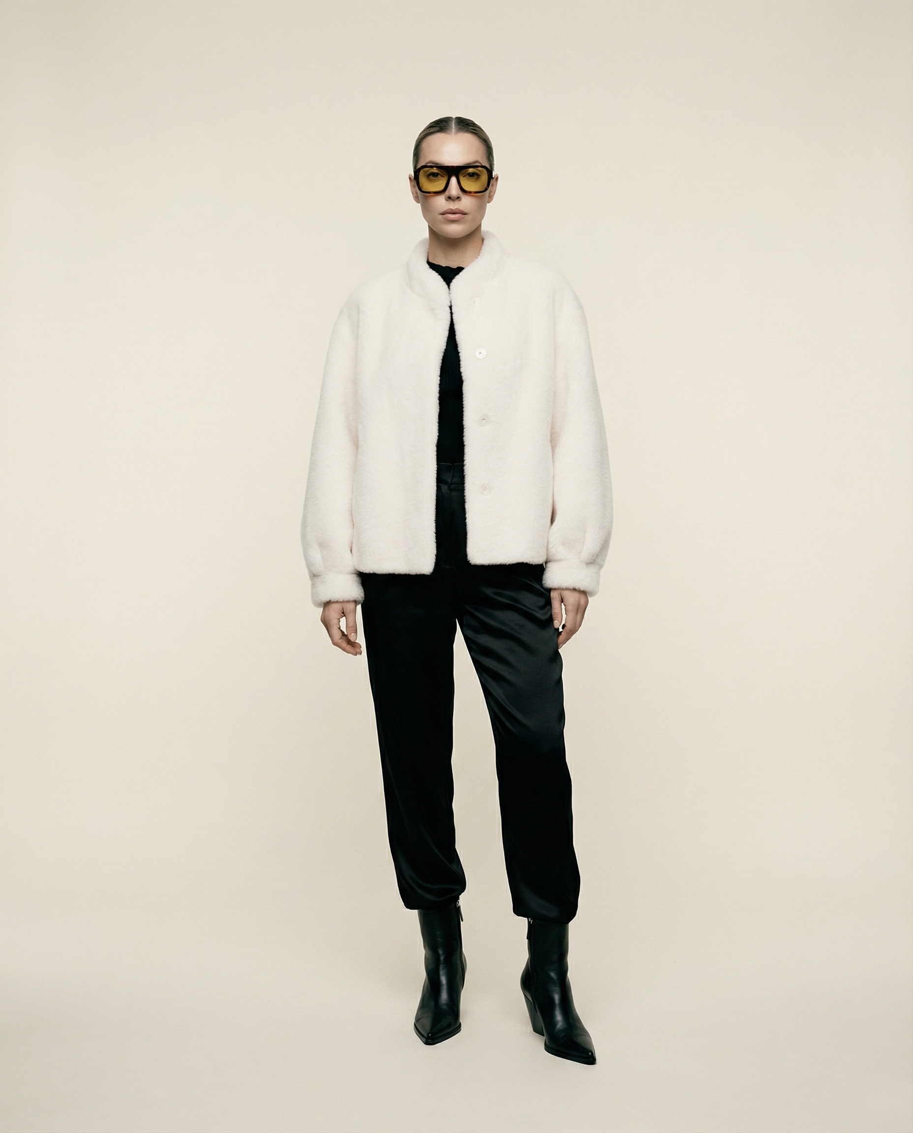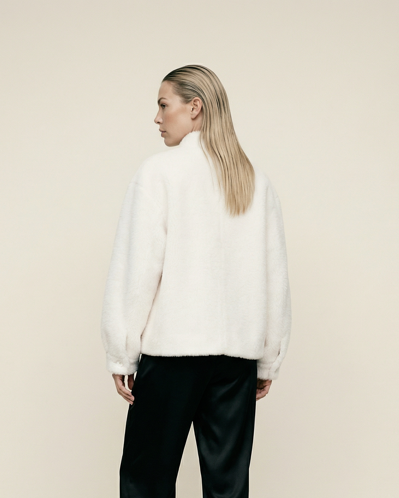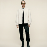 Cozy meets considered. This plush teddy bomber is crafted from soft wool bonded to a faux suede interior—offering the warmth and texture of classic shearling without the use of animal skins. This ivory has a hint of warmth, just a dash of pink.