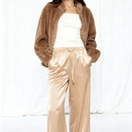 We call this the fits everyone pant, a must have luxurious silky soft statement pant. This fabric drapes beautifully and shines. A comfortable wide leg fit with an elastic back creates the perfect waist fit on all sizes. Pockets and gold hardware drawstrings finish off this stellar style. Small pleat tucks elevate this pant.
