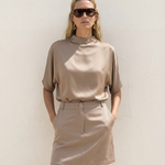 Effortless elegance in our signature Butter Satin. This mini skirt strikes the perfect balance—modest length, luxurious drape, and a subtle luminous finish. Fully lined for comfort and confidence. Paired with our Batwing Tee in Mink.