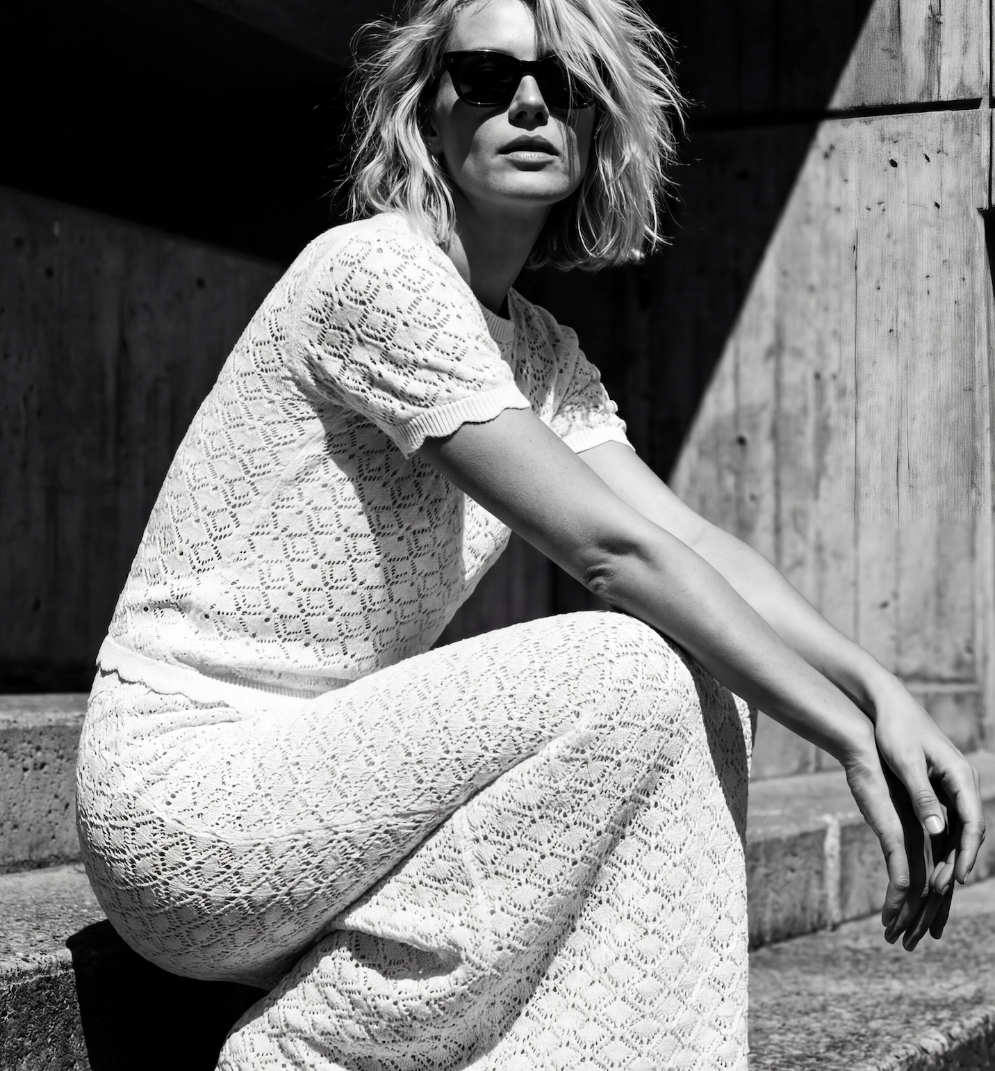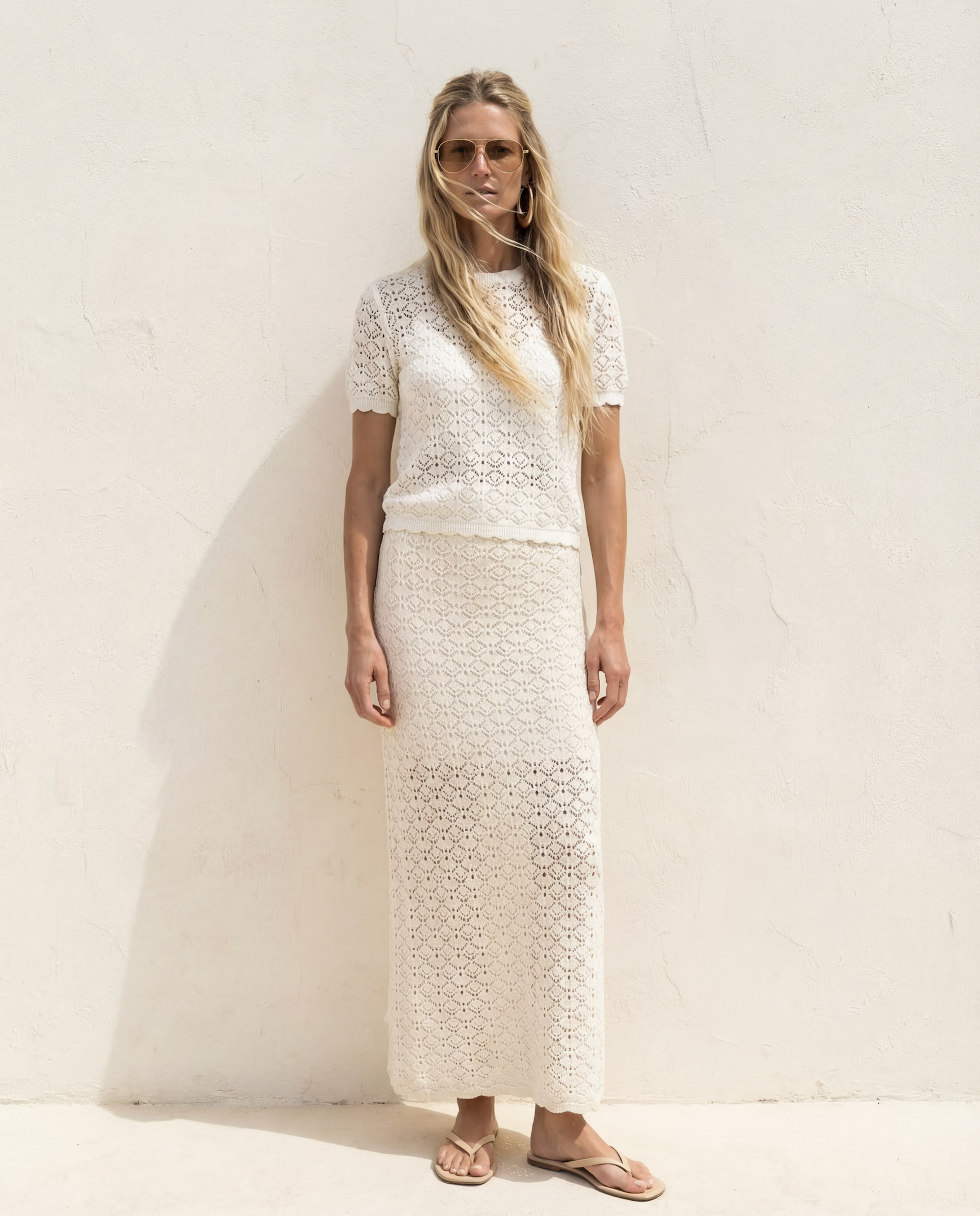 Crafted from premium 100% cotton, this midi skirt features delicate crochet lace knit with refined texture and understated elegance. The elasticized waist provides comfortable wear, while subtle stretch ensures effortless movement. A graceful back slit and coordinating lining layer complete the sophisticated silhouette.