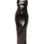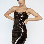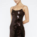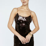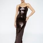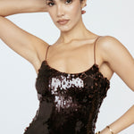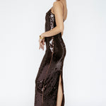 A study in quiet glamour. This deep mahogany column gown is hand-finished in rich, light-catching sequins that subtly shift with every movement. Designed with barely-there straps and a softly sculpted silhouette, it skims the body with ease, thanks to a silky stretch-jersey interior that offers unexpected comfort beneath the surface.
